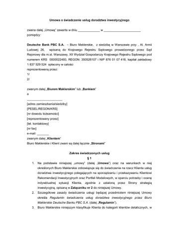 Umowa o wiadczenie us ug doradztwa inwestycyjnego zwana dalej „Umow ” zawarta w dniu _____________ w ______________________ pomi dzy: Deutsche Bank PBC S.A. – Biuro Maklerskie, z siedzib w Warszawie przy , Al. Armii Ludowej 26, wpisan do Krajowego Rejestru S dowego prowadzonego przez S d Rejonowy dla m.st. Warszawy, XII Wydzia Gospodarczy Krajowego Rejestru S dowego pod numerem KRS 0000022493, REGON: 350526107 i NIP 676 01 07 416, kapita zak adowy 1 837 529 524 op acony w ca ci reprezentowan przez: 1/ 2/ zwanym dalej „Biurem Maklerskim” lub „Bankiem” a _____________________ [adres zamieszkania/siedziby] [PESEL/REGON/KRS] [nr dowodu to samo ci] [reprezentowany przez] [tel. kontaktowy] [nr fax] e-mail: _______ zwanym dalej „Klientem” Biuro Maklerskie i Klient zwani s dalej cznie „Stronami” Zakres wiadczonych us ug §1 1. Na podstawie niniejszej „umowy” (dalej „Umowa”) oraz na warunkach w niej okre lonych Biuro Maklerskie zobowi zuje si do wiadczenia na rzecz Klienta us ug doradztwa inwestycyjnego polegaj cych na sporz dzaniu i przekazywaniu Klientowi Rekomendacji Inwestycyjnych oraz Portfeli Modelowych, w oparciu potrzeby i ocen indywidualnej sytuacji Klienta, zgodnie z ustalon przez Strony strategi inwestycyjn , opisan w Za czniku nr 2 do niniejszej Umowy. 2. Szczegó owe zasady okre la Regulamin wiadczenia us ugi b cej przedmiotem niniejszej Umowy wiadczenia us ug doradztwa inwestycyjnego przez Biuro Maklerskie Deutsche Banku PBC S.A. (dalej „Regulamin”). 3. Biuro Maklerskie niniejszym klasyfikuje Klienta do kategorii klientów detalicznych, w -2- rozumieniu przepisów ustawy z dnia 29 lipca 2005 r. o obrocie instrumentami finansowymi ( Dz. U. nr 183, poz. 1538 z pó n. zm.) w odniesieniu do us ug wiadczonych na podstawie niniejszej Umowy. 4. Znaczenie wyra pisanych wielk liter , których definicji nie zawiera niniejsza Umowa okre lone jest w Regulaminie. W razie kolizji definicji rozstrzygaj ce jest znaczenie nadane niniejsz Umow . §2 1. Rekomendacje Inwestycyjne oraz Portfele Modelowe b Klientom, na rzecz których Biuro Maklerskie przekazywane wy cznie wiadczy us ugi w zakresie przyjmowania i przekazywania zlece nabycia lub zbycia Instrumentów Finansowych. 2. Rekomendacje Inwestycyjne oraz Portfele Modelowe b przekazywane Klientowi: a. w formie ustnej (za po rednictwem rejestrowanych rozmów telefonicznych), lub b. w formie elektronicznej (na podany przez Klienta adres poczty elektronicznej), lub, c. w formie pisemnej (mo liwy wy cznie odbiór osobisty w Biurze Maklerskim, Oddziale Banku lub Regionalnym Centrum Inwestycyjnym). 3. W celu identyfikacji Klienta, któremu przekazywane s Rekomendacje Inwestycyjne oraz Portfele Modelowe z po rednictwem telefonu, upowa niony pracownik Biura Maklerskiego, lub Regionalnego Centrum Inwestycyjnego, mo e da od Klienta podania has a, ustalonego w Karcie Klienta. 4. Rekomendacje Inwestycyjne oraz Portfele Modelowe przekazywane s Klientowi na numer telefonu, lub adres poczty elektronicznej podany przez Klienta w Karcie Klienta. Zobowi zania Klienta §3 1. Klient zobowi zuje si do sk adania zlece nabycia lub zbycia Instrumentów Finansowych w zwi zku z przekazywan Rekomendacj Inwestycyjn lub Portfelem Modelowym, wy cznie w Biurze Maklerskim. 2. W celu zapewnienia, e zakres wiadczonej na rzez Klienta us ugi doradztwa inwestycyjnego jest dla Klienta odpowiedni, Klient zobowi zuje si do bie cego informowania Biura Maklerskiego na pi mie o zmianie swojej sytuacji finansowej, wiedzy i do wiadczeniu w zakresie inwestowania w Instrumenty Finansowe, celu inwestycyjnym i maksymalnym akceptowalnym poziomie ryzyka. 3. Rekomendacje Inwestycyjne, Portfele Modelowe oraz wszystkie inne informacje i raporty otrzymywane od Biura Maklerskiego, w ramach wiadczonej us ugi doradztwa inwestycyjnego mog by wykorzystywane przez Klienta wy cznie w celu zawierania transakcji na rachunek w asny. Klient zobowi zuje si do nieujawniania UM/47/E/09 -3- osobom trzecim, bez pisemnej zgody Biura Maklerskiego, Rekomendacji Inwestycyjnych, Portfeli Modelowych, ani adnych innych informacji oraz raportów otrzymywanych od Biura Maklerskiego w ramach wiadczonej us ugi doradztwa inwestycyjnego, z zastrze eniem przypadków, gdy te Rekomendacje Inwestycyjne, Portfele Modelowe oraz inne informacje i raporty: a) zosta y wcze niej podane do publicznej wiadomo ci, lub b) ujawnienie takie jest wymagane przez w ciwe instytucje na podstawie obowi zuj cych przepisów prawa. Wynagrodzenie §4 1. Z tytu u us ugi doradztwa inwestycyjnego wiadczonej na rzecz Klientów Biuro Maklerskie nie pobiera od Klienta op at. 2. Biuro Maklerskie pobiera od Klientów prowizje i op aty z tytu u transakcji zawieranych za po rednictwem Biura Maklerskiego na podstawie przekazywanych Rekomendacji Inwestycyjnych oraz Portfeli Modelowych, zgodnie z obowi zuj Tabel Op at. Odpowiedzialno §5 1. Rekomendacje Inwestycyjne i Portfele Modelowe uzyskane przez Klienta od Biura Maklerskiego w ramach wiadczenia us ugi doradztwa inwestycyjnego, nie mog by traktowane i postrzegane przez Klienta jako zapewnienie lub gwarancja osi gni cia potencjalnych lub spodziewanych rezultatów (zysków) z transakcji realizowanych na podstawie tych Rekomendacji Inwestycyjnych oraz Portfeli Modelowych. 2. Ostateczn decyzj odno nie nabycia lub zbycia oraz powstrzymania si od nabycia lub zbycia Instrumentu Finansowego, Klient podejmuje wy cznie na podstawie w asnej analizy ryzyka Maklerskiego. oraz Klient indywidualnych ponosi decyzji, wy czn podj tych odpowiedzialno niezale nie za w asne od Biura decyzje inwestycyjne. §6 1. Biuro Maklerskie nie ponosi odpowiedzialno ci za wynik finansowy transakcji realizowanych w zwi zku ze wiadczon us ug doradztwa inwestycyjnego i wynikaj ce z tego dla Klienta skutki, w szczególno ci za nieosi gni cie przez Klienta spodziewanych korzy ci lub zysków z transakcji, które zale od czynników rynkowych niezale nych od Biura Maklerskiego, o ile Biuro Maklerskie i osoby, za które pono