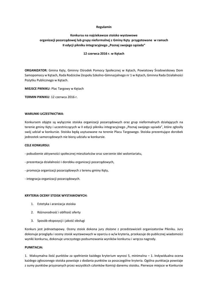 Regulamin Konkursu na najciekawsze stoisko wystawowe organizacji pozarządowej lub grupy nieformalnej z Gminy Kęty przygotowane w ramach II edycji pikniku integracyjnego „Poznaj swojego sąsiada” 12 czerwca 2016 r. w Kętach ORGANIZATOR: Gmina Kęty, Gminny Ośrodek Pomocy Społecznej w Kętach, Powiatowy Środowiskowy Dom Samopomocy w Kętach, Rada Rodziców Zespołu Szkolno-Gimnazjalnego nr 1 w Kętach, Gminna Rada Działalności Pożytku Publicznego w Kętach. MIEJSCE PIKNIKU: Plac Targowy w Kętach TERMIN PIKNIKU: 12 czerwca 2016 r. WARUNKI UCZESTNICTWA: Konkursem objęte są wyłącznie stoiska organizacji pozarządowych oraz grup nieformalnych działających na terenie gminy Kęty i uczestniczących w II edycji pikniku integracyjnego „Poznaj swojego sąsiada”, które zgłosiły swój udział w konkursie. Stoiska będą usytuowane na terenie Placu Targowego. Stoiska prezentujące dorobek jednostek samorządowych nie biorą udziału w konkursie. CELE KONKURSU: - pobudzenie aktywności społecznej mieszkańców oraz szerzenie idei wolontariatu, - prezentacja działalności i dorobku organizacji pozarządowych, - promocja organizacji pozarządowych z terenu gminy Kęty, - integracja organizacji pozarządowych. KRYTERIA OCENY STOISK WYSTAWOWYCH: 1. Estetyka i aranżacja stoiska 2. Różnorodność i obfitość oferty 3. Sposób ekspozycji i jakość obsługi Konkurs jest jednoetapowy. Oceny stoisk dokona jury złożone z przedstawicieli organizatorów Pikniku. Jury dokonuje przeglądu i oceny stoisk wystawowych w oparciu o w/w kryteria, przekazuje do publicznej wiadomości wyniki konkursu, dokonuje uroczystego podsumowania wyników konkursu i wręcza nagrody. PUNKTACJA: 1. Maksymalna ilość punktów za spełnienie każdego kryterium wynosi 5, minimalna – 1. Indywidualna ocena każdego zgłoszonego stoiska powstaje z dodania punktów za poszczególne kryteria. Ogólna punktacja powstaje z sumy punktów przyznanych przez wszystkich członków Komisji danemu stoisku. Pierwsze miejsce w Konkursie zajmuje stoisko, które otrzyma największą liczbę punktów. Uczestnicy konkursu zajmujący miejsca od I do III otrzymają nagrody ufundowane przez Gminę Kęty: za zajęcie I miejsca - 700 zł, za zajęcie II miejsca - 500 zł, za zajecie III miejsca - 300 zł. Odbiór nagród w kasie Urzędu Gminy Kęty do 14 dni od 12.06.2016 przez osobę upoważnioną. 2. Prezentacja odbywa się 12 czerwca 2016 r. w godzinach od 11.00 do 17.00 na przygotowanym przez organizację stoisku w wyznaczonym przez organizatorów miejscu, określonym w zapotrzebowaniu. Stoiska będą zadaszone (wiaty targowe). 3. Prezentacja działalności może się odbywać poprzez m.in. prezentację wyróżnień, pucharów, odznaczeń, sprzętu charakterystycznego dla danej działalności, kronik a także degustację potraw czy też animowanie działań na stoisku. Za porządek i estetykę na stoisku odpowiedzialna jest organizacja. 4. Biorąc udział w Pikniku organizacja wyraża zgodę na sfotografowanie stoiska i użycie zdjęć w celach promocyjnych Gminy Kęty. 5. Organizatorzy udostępniają organizacji po 1 stoliku i 2 krzesłach lub 1 ławce, pozostałe stoliki i krzesła organizacja zapewnia sobie we własnym zakresie. ZGŁOSZENIA DO UDZIAŁU W KONKURSIE: Zgłoszenie do udziału w konkursie należy przesłać do 3 czerwca 2016 r. listownie na adres: Urząd Gminy Kęty, ul. Rynek 7, 32-650 Kęty lub mailowo na adres: [email protected]. Stoiska zlokalizowane na Placu Targowym w Kętach należy zaaranżować 12 czerwca 2016 r. do godz. 10.30. W sprawach organizacyjnych związanych z ustawieniem stoisk prosimy kontaktować się z Wydziałem Rozwoju Urzędu Gminy Kęty tel: 33/844-76-00 wew. 117 lub 165. Materiały przedstawiające działalność organizacji przeznaczone do zaprezentowania na scenie prosimy nadesłać do 2 czerwca 2016 r. na adres [email protected]. Informacja o konkursie zostanie podana do publicznej wiadomości na stronach: www.kety.pl, www.ngo.kety.pl OGŁOSZENIE WYNIKÓW KONKURSU ODBĘDZIE SIĘ W DNIU PIKNIKU. ZGŁOSZENIE UDZIAŁU MUSI ZAWIERAĆ: Nazwę Organizacji: Osobę do kontaktu: Rezerwacja stoiska o wymiarach: 2x3 lub 4x6 (wypisać właściwe) Materiały przedstawiające działalność organizacji przeznaczone do zaprezentowania