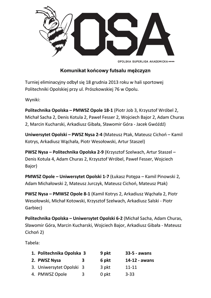 Komunikat końcowy futsalu mężczyzn Turniej eliminacyjny odbył się 18 grudnia 2013 roku w hali sportowej Politechniki Opolskiej przy ul. Prószkowskiej 76 w Opolu. Wyniki: Politechnika Opolska – PMWSZ Opole 18-1 (Piotr Job 3, Krzysztof Wróbel 2, Michał Sacha 2, Denis Kotula 2, Paweł Fesser 2, Wojciech Bajor 2, Adam Churas 2, Marcin Kucharski, Arkadiusz Gibała, Sławomir Góra - Jacek Gwóźdź) Uniwersytet Opolski – PWSZ Nysa 2-4 (Mateusz Ptak, Mateusz Cichoń – Kamil Kotrys, Arkadiusz Wąchała, Piotr Wesołowski, Artur Staszel) PWSZ Nysa – Politechnika Opolska 2-9 (Krzysztof Szelwach, Artur Staszel – Denis Kotula 4, Adam Churas 2, Krzysztof Wróbel, Paweł Fesser, Wojciech Bajor) PMWSZ Opole – Uniwersytet Opolski 1-7 (Łukasz Potępa – Kamil Pinowski 2, Adam Michałowski 2, Mateusz Jurczyk, Mateusz Cichoń, Mateusz Ptak) PWSZ Nysa – PMWSZ Opole 8-1 (Kamil Kotrys 2, Arkadiusz Wąchała 2, Piotr Wesołowski, Michał Kotowski, Krzysztof Szelwach, Arkadiusz Salski - Piotr Garbiec) Politechnika Opolska – Uniwersytet Opolski 6-2 (Michał Sacha, Adam Churas, Sławomir Góra, Marcin Kucharski, Wojciech Bajor, Arkadiusz Gibała - Mateusz Cichoń 2) Tabela: 1. 2. 3. 4. Politechnika Opolska 3 PWSZ Nysa 3 Uniwersytet Opolski 3 PMWSZ Opole 3 9 pkt 6 pkt 3 pkt 0 pkt 33-5 - awans 14-12 - awans 11-11 3-33 Politechnika Opolska: Arkadiusz Lech – Krzysztof Wróbel (3 bramki), Krzysztof Meryk, Michał Sacha (3), Adam Churas (5), Sławomir Góra (2), Denis Kotula (6), Marcin Kucharski (2), Paweł Fesser (3), Piotr Job (3), Wojciech Bajor (4), Arkadiusz Gibała (2). Trener Tomasz Wróbel. PWSZ Nysa: Grzegorz Sapiecha, Dawid Mańczyk – Przemysław Semik, Kamil Kotrys (3), Arkadiusz Wąchała (3), Piotr Wesołowski (2), Michał Kotowski, Tomasz Tomoń, Krzysztof Szelwach (2), Artur Staszel (2), Kamil Pogwizd, Arkadiusz Salski (1). Trener Marcin Dykta. Uniwersytet Opolski: Mateusz Jurczyk (1), Mateusz Rogalewicz – Karol Macherzyński, Adam Michałowski (2), Mateusz Ptak (2), Tomasz Czajka, Kamil Pinowski (2), Mateusz Cichoń (4), Wojciech Konopek. Trener Jacek Cieśliński. PMWSZ Opole: Andrzej Gbur, Łukasz Białek, Łukasz Potępa (1), Piotr Garbiec (1), Bartosz Ciach, Jacek Gwóźdź (1), Kamil Szwed. Mecze sędziował Sebastian Stemplewski.
