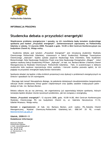 Politechnika Gdańska INFORMACJA PRASOWA Studencka debata o przyszłości energetyki Współczesne problemy energetyczne i sposoby na ich rozwikłania będą tematem studenckiego spotkania pod hasłem „Przyszłość energetyki”. Zainteresowanych zapraszamy na Politechnikę Gdańska w sobotę, 12 stycznia 2008. Początek o godz. 10.00 w Mini Centrum Konferencyjnym (za budynkiem Chemii A). Wstęp wolny. – Studencka debata pod tytułem „Przyszłość Energetyki” jest inicjatywą studentów Wydziału Chemicznego Politechniki Gdańskiej, zrzeszonych w Sekcji Studenckiej Polskiego Towarzystwa Chemicznego „Hybryda”. Szybko zyskała poparcie Naukowego Koła Chemików, Koła Studentów Biotechnologii, Koła Naukowego Studentów Fizyki oraz Koła Naukowego Energetyków „Biogaz” – mówi opiekun naukowy Sekcji Studenckiej PTChem „Hybryda”, dr hab. inż. Barbara Becker z Katedry Chemii Nieorganicznej na Wydziale Chemicznym Politechniki Gdańskiej. – Fakt, iż uczestniczące w debacie studenckie koła naukowe reprezentują różne wydziały i kierunki studiów pozwala sądzić, że ich poglądy na przyszłość energetyki będą bardzo różnorodne. Spotkanie składać się będzie z kilku krótkich prezentacji oraz dyskusji o problemach energetycznych na świecie i sposobach na ich rozwiązanie. – Dlaczego taki temat? Niewątpliwie dlatego, że pokolenie dzisiejszych dwudziestolatków bezpośrednio odczuje skutki zwiększonej emisji gazów cieplarnianych oraz spadku zasobów tradycyjnych paliw – dodaje dr hab. inż. Barbara Becker. Debata odbywa się po raz pierwszy, ale organizatorzy już zapowiadają kolejne spotkania, których tematyka będzie dotykać równie żywotnych problemów, jak ten związany z energetyką. Debata „Przyszłość energetyki”: 12 stycznia 2008, godz. 10.00-14.00, Mini Centrum Konferencyjne Wydziału Chemicznego PG (za budynkiem Chemii A), ul. Gabriela Narutowicza 11/12, Gdańsk Wrzeszcz. Wstęp wolny. Kontakt z organizatorem: dr hab. inż. Barbara Becker, prof. nadzw. PG, Katedra Chemii Nieorganicznej, Wydział Chemiczny Politechniki Gdańskiej, tel.: 058/347 25 92, e-mail: [email protected] Gdańsk, 2008-01-11 Dodatkowe informacje: Katarzyna Żelazek Politechnika Gdańska e-mail: [email protected] tel.: 58 347 29 69 fax: 58 347 29 90 ul. Narutowicza 11/12 Gdańsk