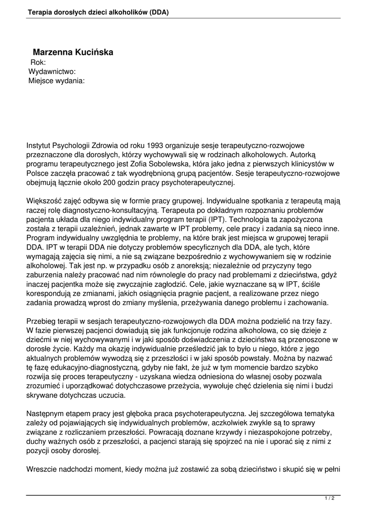 Terapia dorosłych dzieci alkoholików (DDA) Marzenna Kucińska Rok: Wydawnictwo: Miejsce wydania: Instytut Psychologii Zdrowia od roku 1993 organizuje sesje terapeutyczno-rozwojowe przeznaczone dla dorosłych, którzy wychowywali się w rodzinach alkoholowych. Autorką programu terapeutycznego jest Zofia Sobolewska, która jako jedna z pierwszych klinicystów w Polsce zaczęła pracować z tak wyodrębnioną grupą pacjentów. Sesje terapeutyczno-rozwojowe obejmują łącznie około 200 godzin pracy psychoterapeutycznej. Większość zajęć odbywa się w formie pracy grupowej. Indywidualne spotkania z terapeutą mają raczej rolę diagnostyczno-konsultacyjną. Terapeuta po dokładnym rozpoznaniu problemów pacjenta układa dla niego indywidualny program terapii (IPT). Technologia ta zapożyczona została z terapii uzależnień, jednak zawarte w IPT problemy, cele pracy i zadania są nieco inne. Program indywidualny uwzględnia te problemy, na które brak jest miejsca w grupowej terapii DDA. IPT w terapii DDA nie dotyczy problemów specyficznych dla DDA, ale tych, które wymagają zajęcia się nimi, a nie są związane bezpośrednio z wychowywaniem się w rodzinie alkoholowej. Tak jest np. w przypadku osób z anoreksją; niezależnie od przyczyny tego zaburzenia należy pracować nad nim równolegle do pracy nad problemami z dzieciństwa, gdyż inaczej pacjentka może się zwyczajnie zagłodzić. Cele, jakie wyznaczane są w IPT, ściśle korespondują ze zmianami, jakich osiągnięcia pragnie pacjent, a realizowane przez niego zadania prowadzą wprost do zmiany myślenia, przeżywania danego problemu i zachowania. Przebieg terapii w sesjach terapeutyczno-rozwojowych dla DDA można podzielić na trzy fazy. W fazie pierwszej pacjenci dowiadują się jak funkcjonuje rodzina alkoholowa, co się dzieje z dziećmi w niej wychowywanymi i w jaki sposób doświadczenia z dzieciństwa są przenoszone w dorosłe życie. Każdy ma okazję indywidualnie prześledzić jak to było u niego, które z jego aktualnych problemów wywodzą się z przeszłości i w jaki sposób powstały. Można by nazwać tę fazę edukacyjno-diagnostyczną, gdyby nie fakt, że już w tym momencie bardzo szybko rozwija się proces terapeutyczny - uzyskana wiedza odniesiona do własnej osoby pozwala zrozumieć i uporządkować dotychczasowe przeżycia, wywołuje chęć dzielenia się nimi i budzi skrywane dotychczas uczucia. Następnym etapem pracy jest głęboka praca psychoterapeutyczna. Jej szczegółowa tematyka zależy od pojawiających się indywidualnych problemów, aczkolwiek zwykle są to sprawy związane z rozliczaniem przeszłości. Powracają doznane krzywdy i niezaspokojone potrzeby, duchy ważnych osób z przeszłości, a pacjenci starają się spojrzeć na nie i uporać się z nimi z pozycji osoby dorosłej. Wreszcie nadchodzi moment, kiedy można już zostawić za sobą dzieciństwo i skupić się w pełni 1/2 Terapia dorosłych dzieci alkoholików (DDA) na aktualnym życiu. To ostatni, trzeci etap terapii nazywany przez nas porządkowaniem obecnego życia. Każdy pacjent ma okazję do przyjrzenia się dokładnie różnym obszarom własnego funkcjonowania pod kątem tego, co mu się w nim podoba, a co nie. Następnie pacjenci układają swój własny plan rozwinięcia tego, co im się we własnym życiu podoba oraz zmiany tego, z czego są niezadowoleni. Najczęściej to, co chcą zmienić, to swoje miejsce w świecie. Często chodzi po prostu o to, by takie miejsce mieć, np. wyodrębnić je z całego mieszkania lub urządzić własny pokój. Czasem oznacza to uporządkowanie tego, co robię, wyznaczenie granic między czasem na pracę, a czasem spędzanym z bliskimi i czasem dla siebie. Wiele dorosłych dzieci alkoholików zaczyna wprowadzanie zmian w swoim życiu od zastanowienia się, kim jestem, a kim chciałbym być i jakim chciałbym być, co jest dla mnie naprawdę ważne w życiu. Mówiąc po prostu, przeprowadzają generalne porządki. Cele terapii DDA ogniskują się wokół aktualnego dorosłego życia. Chodzi o to by zostawić za sobą dzieciństwo, rozstać się z nim, zmienić obraz samego siebie na adekwatny do aktualnej rzeczywistości oraz uporządkować swoje obecne życie. Aby tego dokonać należy najpierw zmierzyć się z różnymi trudnymi uczuciami i wspomnieniami, ale tak by móc poczuć swoją siłę i niezależność. Po wpływem takich doświadczeń DDA zaczyna najczęściej patrzeć na sobie bardziej realistycznie niż dotychczas. DDA rozpoczynając terapię mają w sobie dużo lęku, przed samym sobą; boją się iż pod spodem odkryją potwora - kogoś niewartego kochania, egoistę, może nawet psychopatę. To, co spotykają odkrywając siebie w toku terapii okazuje się zgoła inne, choć nie zawsze jest to różowy obraz. Uczą się widzieć siebie jako realnych ludzi, mających w sobie cząstkę dobra i zła, decydujących o tym, którą część siebie pokazują czy dają innym. Ten realny obraz siebie zwykle jest bardziej pozytywny niż wizja siebie, jaką mieli przed terapią. Wśród pożądanych efektów terapii DDA Zosia Sobolewska wymienia uwolnienie się od poczucia krzywdy i innych urazów z dzieciństwa oraz nauczenie się konstruktywnych sposobów radzenia sobie z przykrymi emocjami. Najważniejszy jest chyba powrót do realnego życia, czyli bardziej bezpośredni kontakt z rzeczywistością, bez uciekania się w fikcyjny świat i bez uzależnienia się od innych osób oraz otwarcie się na bliskie kontakty z ludźmi i przeżywanie emocji z tym związanych, bez lęku przed odrzuceniem. Autorka jest psychologiem, psychoterapeutą. Kieruje Ośrodkiem Psychoterapii IPZ , specjalizującym się w terapii dorosłych dzieci alkoholików. 2/2