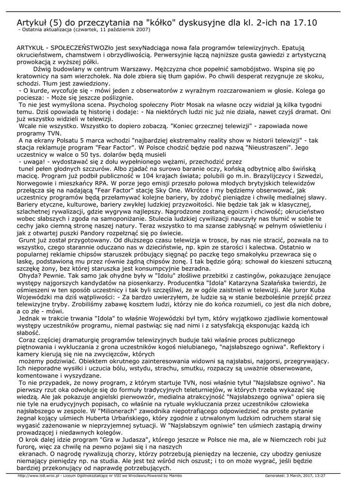 Artykuł (5) do przeczytania na "kółko" dyskusyjne dla kl. 2-ich na 17.10