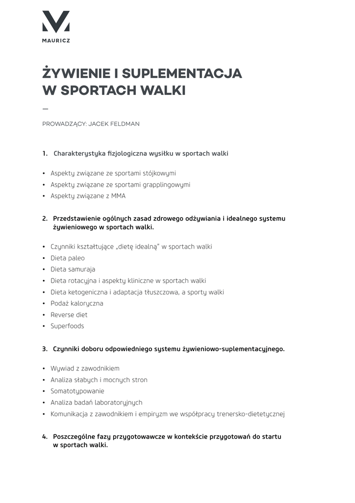 ŻYWIENIE I SUPLEMENTACJA W SPORTACH WALKI _ PROWADZĄCY: JACEK FELDMAN 1. Charakterystyka fizjologiczna wysiłku w sportach walki • Aspekty związane ze sportami stójkowymi • Aspekty związane ze sportami grapplingowymi • Aspekty związane z MMA 2. Przedstawienie ogólnych zasad zdrowego odżywiania i idealnego systemu żywieniowego w sportach walki. • Czynniki kształtujące „dietę idealną” w sportach walki • Dieta paleo • Dieta samuraja • Dieta rotacyjna i aspekty kliniczne w sportach walki • Dieta ketogeniczna i adaptacja tłuszczowa, a sporty walki • Podaż kaloryczna • Reverse diet • Superfoods 3. Czynniki doboru odpowiedniego systemu żywieniowo-suplementacyjnego. • Wywiad z zawodnikiem • Analiza słabych i mocnych stron • Somatotypowanie • Analiza badań laboratoryjnych • Komunikacja z zawodnikiem i empiryzm we współpracy trenersko-dietetycznej 4. Poszczególne fazy przygotowawcze w kontekście przygotowań do startu w sportach walki. • Faza roztrenowania • Faza offseasonowa • Faza przygotowawcza • Faza przed walką • Faza rekuperacji po ważeniu 5. Różnice związane z przygotowaniami do startów amatorskich oraz zawodowych. • Plusy i minusy przygotowań do startów w zawodach amatorskich • Plusy i minusy przygotowań do walki zawodowej 6. Dietoterapia w sportach walki. • Identyfikacja oraz wyrównanie niedoborów witamin i minerałów • Analiza zaburzeń metabolicznych oraz ich zaadresowanie • Usprawnienie funkcjonowania układu immunologicznego • Regulacja neuroprzekaźników • Optymalizacja szlaków metylacyjnych • Zadbanie o odpowiednią pracę żołądka oraz jelit 7. Różnice w doborze diety i suplementacji w dyscyplinach stójkowych i parterowych. 8. Charakterystyka błędów żywieniowo-suplementacyjnych zawodników w poszczególnych fazach przygotowawczych. 9. Charakterystyka poszczególnych faz przygotowawczych w kontekście doboru odpowiedniej diety. • Dobór makroskładników • Najskuteczniejsze systemy plasowania węglowodanów • Najlepsze systemy dietetyczno-suplementacyjne w celu redukcji tkanki tłuszczowej i masy ciała • Analiza przypadków w celu identyfikacji różnic w indywidualnym doborze diety 10. Charakterystyka poszczególnych faz przygotowawczych w kontekście doboru odpowiedniej suplementacji. • Stackowanie suplementów w poszczególnych fazach przygotowawczych • Analiza przypadków w celu identyfikacji różnic w postępowaniu suplementacyjnym 11. Zbijanie wagi krok po kroku. • Czynniki wpływające na skuteczną redukcję masy ciała • Hormony – nasi przyjaciele i wrogowie jednocześnie • Strategie redukcji stresu i napięcia przed startem • Najlepsze strategie skutecznego i bezpiecznego odwadniania 12. Rekuperacja po ważeniu. • Indywidualne podejście w rekuperacji do poszczególnego rodzaju zawodników • Przykładowe schematy rekuperacji po ważeniu • Przykładowe problemy mogące wystąpić w okresie rekuperacji po ważeniu 13. Doping w sportach walki. • SAA w sportach walki • Legalny doping, czyli jak wprowadzić swój organizm na wyżyny • Doping mózgu 14. Studium przypadków. • Analiza badań krwi poszczególnych przypadków • Postępowanie w przypadku problemów zawodników w różnych fazach przygotowań • Dobór odpowiedniej diety i suplementacji do konkretnych i autentycznych pacjentów