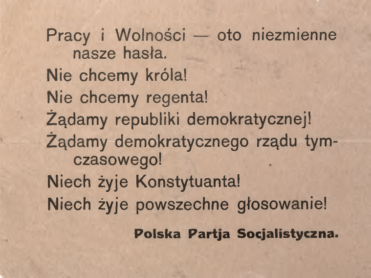 Pracy i Wolności — oto niezmienne nasze hasła. Nie chcemy króla! Nie chcemy regenta! Żądamy republiki demokratycznej! Żądamy demokratycznego rządu tym czasowego! Niech żyje Konstytuanta! Niech żyje powszechne głosowanie! Polska Partja Socjalistyczna.