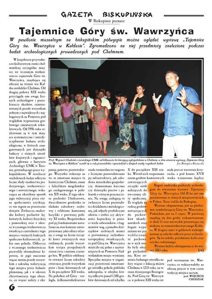 W Biskupinie poznasz Tajemnice Góry św. Wawrzyńca W pawilonie muzealnym na biskupińskim półwyspie można oglądać wystawę „Tajemnice Góry św. Wawrzyńca w Kałdusie”. Zgromadzono na niej przedmioty znalezione podczas badań archeologicznych prowadzonych pod Chełmnem. W krajobrazie przyrodniczo-kulturowym ziemi chełmińskiej szczególne miejsce we wczesnym średniowieczu zajmowała Góra św. Wawrzyńca, znajdująca się obecnie na terenie wsi Kałdus niedaleko Chełmna. Od drugiej połowy XIX wieku przyciągała ona uwagę licznych archeologów i poszukiwaczy skarbów, zainteresowanych przede wszystkim jednym z największych i najbogatszych na Pomorzu pod względem wyposażenia grobowego cmentarzysk szkieletowych. Od 1996 roku realizowane są w tym miejscu systematyczne i interdyscyplinarne badania archeologiczne, w których zaangażowanych jest dziesiątki badaczy z różnych ośrodków krajowych i zagranicznych, głównie z Instytutu Archeologii UMK w Toruniu, prowadzącego prace wykopaliskowe. W rezultacie wieloletnich badań odkryto liczne ślady osadnictwa pradziejowego, średniowiecznego i nowożytnego, wskazujące na określony sposób jego waloryzacji przez różne społeczności użytkujące ten region na przestrzeni dziejów. Zwłaszcza znaleziska kultury pucharów lejkowatych, kultury łużyckiej i pomorskiej oraz z okresu wczesnego średniowiecza świadczą o centralności tego miejsca i ważnych funkcjach społeczno-kulturowych, jakie ono pełniło. Odkrycia z wczesnego średniowiecza pozwoliły sformułować hipotezę, że jego znaczenie wiązać można przede wszystkim z sakralną waloryzacją tego miejsca przez ludność plemienną, jak i w okresie chrystianizacji tego obszaru, co wiązać należy z eks- Prof. Wojciech Chudziak z toruńskiego UMK, od kilkunastu lat kierujący wykopaliskami w Chełmnie, w dniu otwarcia wystawy „Tajemnice Góry św. Wawrzyńca w Kałdusie” wcielił się w rolę przewodnika i opowiedział o dziejach osady i wynikach badań fot. Remigiusz Konieczka pansją państwa piastowskiego. Wszystko wskazuje na to, że omawiane miejsce to historyczne Chełmno, znane z falsyfikatu mogileńskiego zredagowanego w połowie XII wieku. Z tego okresu pochodzi 2-hektarowe, dwuczłonowe grodzisko ze śladami zabudowy zrębowej i reliktami kamiennej bazyliki z pierwszej połowy XI wieku. Bezpośrednio pod jej fundamentami natrafiono na stos kamieni zinterpretowany jako ołtarz ofiarny, z uwagi na liczne szczątki kości zwierzęcych oraz roślinnych, przede wszystkim tysiące przepalonych ziaren żyta i nasiona czarnego bzu. W pobliżu odsłonięto również liczne szkielety zwierzęce, przede wszystkim psów i koni datowanych od X do początków XII wieku. Na południe od Góry - rozległa, kilkunastohektarowa osada rzemieślniczo-targowa z licznymi pozostałościami jej infrastruktury, jak zabudowa mieszkalno-gospodarcza, domniemana karczma czy dziesiątki pieców i palenisk o różnym przeznaczeniu. Na uwagę zasługują tu zwłaszcza liczne pozostałości działalności metalurgicznej, jak odpady produkcyjne ołowiu i srebra czy aktywności kupieckiej w postaci wielu odważników i fragmentów wag, a ponadto dziesiątków srebrnych monet o proweniencji zachodnioeuropejskiej świadczących, że pod Górą św. Wawrzyńca mieściło się jedno z najważniejszych na Pomorzu Nadwiślańskim miejsc wymiany. Specjalne miejsce w organizacji przestrzeni omawianego ośrodka pełniła pobliska nekropolia, w obrębie której odkryto ponad 1.500 grobów datowanych od schyłku X do początków XIII wie- niała jeszcze warownia krzyku. Wśród nich rozpoznano żacka, a pod koniec XVII osiem grobów komorowych wieku wzniesiono kaplicę zawierających Bogate znaleziska posłużyły archeoloszczątki osób należących do gom do stworzenia wystawy Tajemnice ówczesnej eli- Góry św. Wawrzyńca. Od 10 lat jest ona ty społecznej. prezentowana w różnych miejscowościach Ze względu na w Polsce. Teraz trafiła do Biskupina. Wystawa eksponowana jest na platforrodzaj grobów mie symbolizującej Górę św. Wawrzyńca. nawiązujących do pochów- Podzielona jest na 2 części. W pierwszej ków skandy- znajdują się dwa groby zrekonstruowane nawskich oraz w skali 1:1 oraz niezwykle prezentująca się bogate wypo- makieta wczesnośredniowiecznego Kałdusażenie nie jest su. W drugiej części w gablotach wykespowykluczone, nowane są zabytki odkryte przez archeoloże pochowa- gów. Są to ozdoby, przedmioty kultu oraz ne w nich oso- użytku codziennego. Wystawa będzie udostępniona aż do wioby były obce(rk) go pochodze- sny 2013 roku. nia. Kres istnienia badanego ośrodka należy wiązać z lokacją miasta Chełmna w 1233 roku, na terenie dzisiejszego Starogrodu. Pod Górą św. Wawrzyńca, w połowie XIII wieku ist- pod wezwaniem św. Wawrzyńca co wskazywałoby na obecną jeszcze w tym czasie tradycję miejsca sacrum. prof. WOJCIECH CHUDZIAK