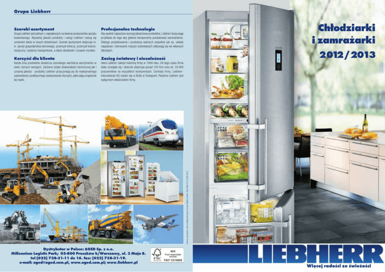 Grupa Liebherr Profesjonalne technologie Grupa Liebherr jest jednym z największych na świecie producentów sprzętu budowlanego. Wysokiej jakości produkty i usługi Liebherr cieszą się uznaniem także w innych dziedzinach. Szeroki asortyment obejmuje m. in. sprzęt gospodarstwa domowego, przemysł lotniczy, przemysł kosmonautyczny i systemy transportowe, a także obrabiarki i żurawie morskie. Aby spełnić najwyższe wymogi jakościowe produktów, Liebherr dużą wagę przykłada do tego aby główne komponenty produkować samodzielnie. Dlatego projektowanie i produkcja ważnych zespołów jak np. układy napędowe i sterowanie maszyn budowlanych odbywają się we własnych fabrykach. Korzyści dla klienta Zasięg światowy i niezależność Każda linia produktów dostarcza szerokiego wachlarza asortymentu w wielu różnych wersjach. Zarówno dzięki doskonałości technicznej jak i uznanej jakości - produkty Liebherr przyczyniają się do maksymalnego zadowolenia z praktycznego zastosowania i korzyści, jakie dają urządzenia tej marki. Hans Liebherr założył rodzinną firmę w 1949 roku. Od tego czasu firma stale rozwijała się i obecnie obejmuje ponad 120 firm oraz ok. 33.000 pracowników na wszystkich kontynentach. Centrala firmy, LiebherrInternational AG mieści się w Bulle w Szwajcarii. Rodzina Liebherr jest wyłącznym właścicielem firmy. Chłodziarki i zamrażarki 2012 / 2013 Zmiany zastrzeżone. Druk w Niemczech przez Fischer Medien GmbH. 7943 696-07/12.0/02.2012 Szeroki asortyment Dystrybutor w Polsce: AGED Sp. z o.o. Millennium Logistic Park; 05-800 Pruszków k/Warszawy, ul. 3 Maja 8. tel (022) 738-31-11 do 16. fax: (022) 738-31-19. e-mail: [email protected], www.aged.com.pl; www.liebherr.pl Więcej radości ze świeżości 10 powodów, dla których warto kupować produkty firmy Liebherr 1 Doświadczenie, które się liczy Jako wiodący producent automatycznych chłodziarko-zamrażarek firma Liebherr już od ponad 50 lat konsekwentnie projektuje i produkuje nowe, przekonujące rozwiązania. Zaufanie naszych klientów stanowi dla nas stałą motywację. Marka Liebherr jako jeden z niewielu producentów urządzeń chłodniczych może pochwalić się wysoką lojalnością swoich klientów. Klienci, którzy raz kupili urządzenia Liebherr przy kolejnych zakupach zostają wierni marce Liebherr. 2 Jakość na najwyższym poziomie Aby zagwarantować niezawodność naszych produktów, do ich produkcji używamy wyłącznie najwyższej jakości materiałów i komponentów. Już podczas procesu wykończeniowego każde urządzenie jest wielokrotnie sprawdzane pod kątem jakości i funkcjonalności. Stały rozwój produktów, optymalizacja wszelkich komponentów, jak również perfekcyjne w każdym calu wykonanie gwarantują, już prawie przysłowiową, jakość firmy Liebherr – a co za tym idzie długowieczność naszych produktów, przekonującą na co dzień przez wiele lat. 3 Klasyczny styl Przez połączenie wysokogatunkowych materiałów z klasycznymi formami automatyczne chłodziarko-zamrażarki firmy Liebherr spełniają najwyższe wymagania estetyczne. Połączenie najwyższej klasy stali szlachetnej z precyzyjnym elektronicznym sterowaniem i wyposażeniem GlassLine gwarantuje ponadczasową elegancję przez wiele lat. 4 Przyjazne dla środowiska ActiveGreen - Troska o środowisko w firmie Liebherr rozpoczyna się już podczas projektowania automatycznych chłodziarko-zamrażarek. Firma Liebherr używa najwyższej jakości komponentów dla długiego i pewnego funkcjonowania oraz najlepszej efektywności energetycznej. Wszystkie tworzywa sztuczne są odpowiednio oznaczone dla ułatwienia recyklingu. Również procesy wykończeniowe są ukierunkowane na efektywne wykorzystanie zasobów. W ten sposób na przykład ciepło, potrzebne do produkcji urządzeń, odprowadzane jest z powrotem do obiegu jako energia grzewcza. Wszystkie europejskie fabryki Liebherr są certyfikowane według międzynarodowej normy zarządzania środowiskowego ISO 14001. 5 Super energooszczędność Przez zastosowanie najnowocześniejszej elektroniki w połączeniu z wysoko wydajnymi systemami chłodniczymi firma Liebherr oferuje we wszystkich grupach produktów atrakcyjny i super oszczędny program w najlepszych klasach efektywności energetycznej. Urządzenia firmy Liebherr w najlepszej klasie efektywności energetycznej A+++ cechuje najwyższy poziom oszczędności energetycznej. 6 BioFresh – samo zdrowie BioFresh gwarantuje perfekcyjny klimat dla wyjątkowo długiej świeżości. W temperaturze nieco powyżej 0°C i przy idealnej wilgotności powietrza warzywa i owoce, mięso, ryby i produkty mleczne zachowują zdrowe witaminy, delikatny aromat i apetyczny wygląd do trzech razy dłużej niż w tradycyjnej lodówce. 7 NoFrost – profesjonalna jakość chłodzenia 8 Idealny klimat dla szlachetnych win Koniec z rozmrażaniem! Urządzenia NoFrost firmy Liebherr pozwalają na długo zachować świeżość produktów dzięki doskonałej wydajności chłodniczej. Produkty są zamrażane obiegowym powietrzem chłodzącym, a wilgoć jest odprowadzana z powietrza. Dzięki temu w zamrażarce nie tworzy się zbędny lód, a produkty spożywcze nie ulegają oszronieniu. Chłodziarki do długotrwałego przechowywania wina oferują idealne warunki dla spokojnego dojrzewania win i rozwinięcia ich doskonałego smaku. Chłodziarki do win ze strefami temperatur gwarantują optymalną temperaturę serwowania. Perfekcyjne połączenie obu zalet oferują urządzenia Vinidor. 9 Wyróżnienia Doskonała jakość produktu i styl urządzeń firmy Liebherr potwierdzana jest ciągle na nowo przez niezależne instytuty. Chłodziarka KBgb 3864 z czarnymi, szklanymi drzwiami otrzymała nagrodę Plus X Award za wysoką jakość, estetyczne i ekologiczne wykonanie oraz tytuł «Najlepszej chłodziarki 2011 roku». Również w ramach renomowanego konkursu Reddot Award urządzenia firmy Liebherr regularnie zdobywają wy