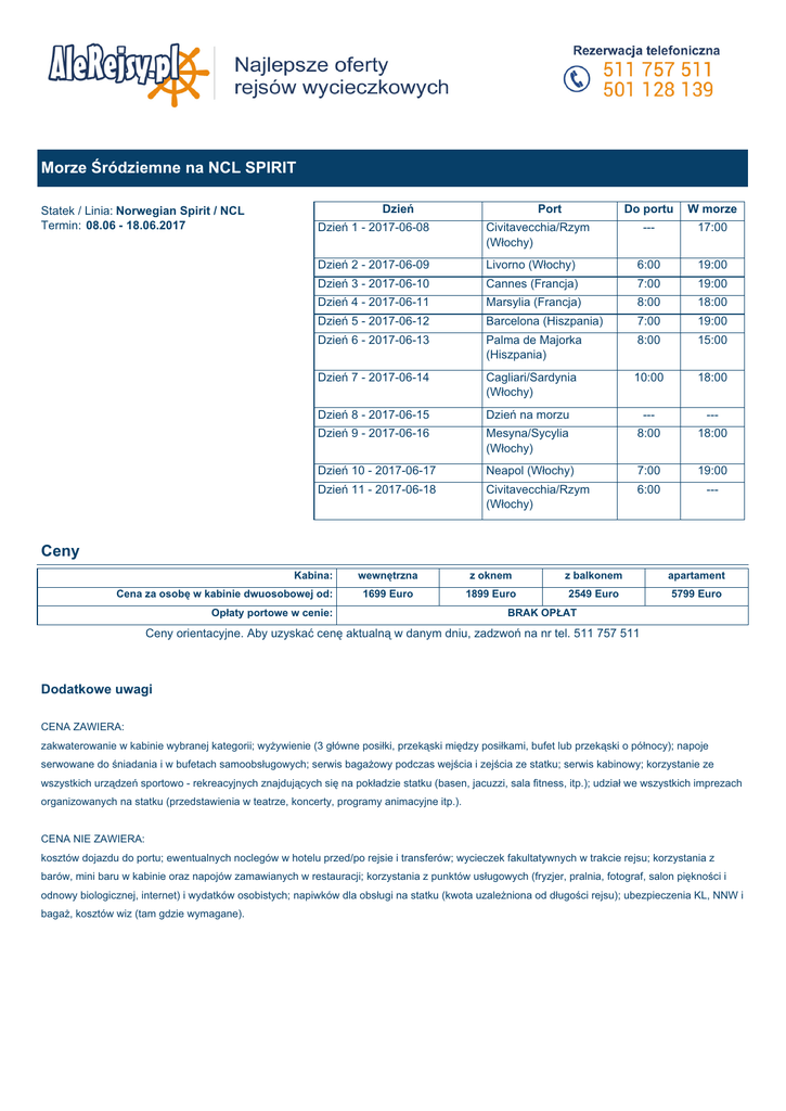 Morze Śródziemne na NCL SPIRIT Ceny