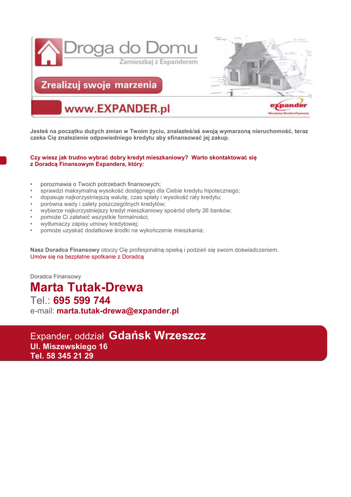 Jesteś na początku dużych zmian w Twoim życiu, znalazłeś/aś swoją wymarzoną nieruchomość, teraz czeka Cię znalezienie odpowiedniego kredytu aby sfinansować jej zakup. Czy wiesz jak trudno wybrać dobry kredyt mieszkaniowy? Warto skontaktować się z Doradcą Finansowym Expandera, który: • • • • • • • • porozmawia o Twoich potrzebach finansowych; sprawdzi maksymalną wysokość dostępnego dla Ciebie kredytu hipotecznego; dopasuje najkorzystniejszą walutę, czas spłaty i wysokość raty kredytu; porówna wady i zalety poszczególnych kredytów; wybierze najkorzystniejszy kredyt mieszkaniowy spośród oferty 26 banków; pomoże Ci załatwić wszystkie formalności; wytłumaczy zapisy umowy kredytowej; pomoże uzyskać dodatkowe środki na wykończenie mieszkania; Nasz Doradca Finansowy otoczy Cię profesjonalną opieką i podzieli się swoim doświadczeniem. Umów się na bezpłatne spotkanie z Doradcą Doradca Finansowy Marta Tutak-Drewa Tel.: 695 599 744 e-mail: [email protected] Expander, oddział Ul. Miszewskiego 16 Tel. 58 345 21 29 Gdańsk Wrzeszcz