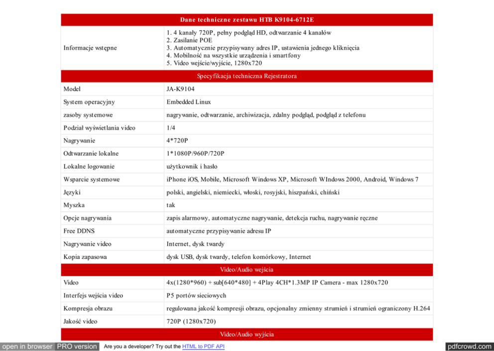 Dane te chnicz ne z e stawu HTB K9104-6712E Informacje wstępne 1. 4 kanały 720P, pełny podgląd HD, odtwarzanie 4 kanałów 2. Zasilanie POE 3. Automatycznie przypisywany adres IP, ustawienia jednego kliknięcia 4. Mobilność na wszystkie urządzenia i smartfony 5. Video wejście/wyjście, 1280x720 Specyfikacja techniczna Rejestratora Model JA-K9104 System operacyjny Embedded Linux zasoby systemowe nagrywanie, odtwarzanie, archiwizacja, zdalny podgląd, podgląd z telefonu Podział wyświetlania video 1/4 Nagrywanie 4*720P Odtwarzanie lokalne 1*1080P/960P/720P Lokalne logowanie użytkownik i hasło Wsparcie systemowe iPhone iOS, Mobile, Microsoft Windows XP, Microsoft WIndows 2000, Android, Windows 7 Języki polski, angielski, niemiecki, włoski, rosyjski, hiszpański, chiński Myszka tak Opcje nagrywania zapis alarmowy, automatyczne nagrywanie, detekcja ruchu, nagrywanie ręczne Free DDNS automatyczne przypisywanie adresu IP Nagrywanie video Internet, dysk twardy Kopia zapasowa dysk USB, dysk twardy, telefon komórkowy, Internet Video/Audio wejścia Video 4x(1280*960) + sub[640*480] + 4Play 4CH*1.3MP IP Camera - max 1280x720 Interfejs wejścia video P5 portów sieciowych Kompresja obrazu regulowana jakość kompresji obrazu, opcjonalny zmienny strumień i strumień ograniczony H.264 Jakość video 720P (1280x720) Video/Audio wyjścia open in browser PRO version Are you a developer? Try out the HTML to PDF API pdfcrowd.com HDMI wyjście 1920*1080p 50Hz, 60Hz VGA wyjście 800x600, 1024x768, 1280x1024, 1366x768, 1440x900 Rozdzielczość nagrywania 720P Video wyjście (kanał) 1HDMI, 1VGA Ilość klatek na sekundę (FPS) 25(PAL), 30(NT SC) Podwójny strumień tak Dysk twardy T yp interfejsu 1SAT A Maksymalna pojemność (T ) 4T B Interfejs zewnętrzny Interfejs sieci 5*RJ45 10M/100M transmisja cyfrowa zasilana poprzez jeden kabel USB2.0 Interface 2 porty RS RS485 Interfejs bezprzewodowy 3G, WiFi Ogólne NVR-zasilanie DC15V 4A NVR-pobór mocy (W) <20W (nie wliczając HDD) NVR - temperatura pracy (C) -10°C ~ 55°C NVR-wilgotność (%) RH >90% Spe cyfikacja kame r Model JA-6013E Wielkość matrycy 1.3 Mpix Przetwornik 1/3" progressive scan CMOS Ilość pikseli 1280(H) x 720(V) Min. oświetlenie 0Lux/F1.2(IR ON) Zasięg IR 10-15M (30x5leds) open in browser PRO version Are you a developer? Try out the HTML to PDF API pdfcrowd.com S/N stosunek sygnał/szum >39sb(AGC wył.) Elektroniczna migawka auto/1/25s-1/10000s Dzień/Noc EXT /Auto Obiektyw T yp obiektywu 3.6mm 1/2.5" DC/ICR/ 6mm 1/2.5" DC/ICR Kompresja Audio/Video Kompresja Video H.264 Rozdzielczość obrazu 1280x720 Podwójny strumień główny strumień: 720P 25k dodatkowy strumień: 640*360 25k/PAL Przepływność 64Kbps-4096Kbps w trybie ciągłym T ransmisja i zapis danych T ypy przechowywania danych nagrywanie(video), pliki obrazu Przechowywanie ręczny, automatyczny (czas, detekcja ruchu, alarm) Protokoły/Funkcje sieci RT SP, UPnP, PPPOE, DDNS, ONVIF Przeglądarka internetowa IE Dostęp z telefonu komórkowego 3G Iphone, Android Interfejs sieci RJ45 10M/100M Ethernet T emperatura pracy Zakres temperatur -10°C +55°C/10%-90% Zasilanie 600mA/DC12V/POE moduł opcjonalny Pobór mocy 6W Inne informacje do zestawu IP KIT Rozmiar 40*30*19cm (zestawu) 42*4*615cm (rozmiar kartonu) Waga 5.5kg (waga zestawu); 22kg (waga kartonu) Ilość w kartonie 4 zestawy open in browser PRO version Are you a developer? Try out the HTML to PDF API pdfcrowd.com W pudełku W pudełku open in browser PRO version Zasilacz 12V/4A, oprogramowanie na CD,DVR, Instrukcja obsługi - j.angielski, myszka Are you a developer? Try out the HTML to PDF API pdfcrowd.com