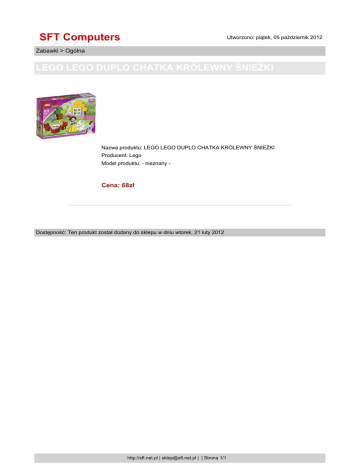 SFT Computers Utworzono: piątek, 05 październik 2012 Zabawki > Ogólna LEGO LEGO DUPLO CHATKA KRÓLEWNY ŚNIEŻKI Nazwa produktu: LEGO LEGO DUPLO CHATKA KRÓLEWNY ŚNIEŻKI Producent: Lego Model produktu: - nieznany - Cena: 68zł Dostępność: Ten produkt został dodany do sklepu w dniu wtorek, 21 luty 2012 http://sft.net.pl | [email protected] | | Strona 1/1