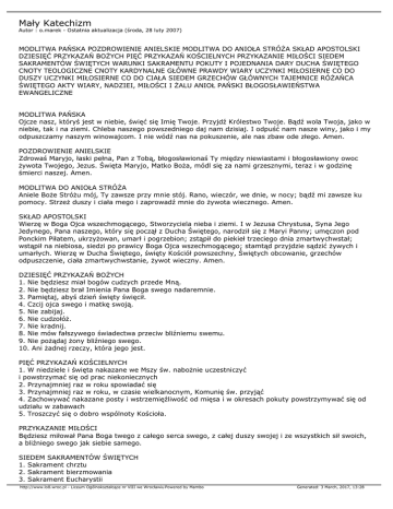 Mały Katechizm Autor : o.marek - Ostatnia aktualizacja (środa, 28 luty 2007) MODLITWA PAŃSKA POZDROWIENIE ANIELSKIE MODLITWA DO ANIOŁA STRÓŻA SKŁAD APOSTOLSKI DZIESIĘĆ PRZYKAZAŃ BOŻYCH PIĘĆ PRZYKAZAŃ KOŚCIELNYCH PRZYKAZANIE MIŁOŚCI SIEDEM SAKRAMENTÓW ŚWIĘTYCH WARUNKI SAKRAMENTU POKUTY I POJEDNANIA DARY DUCHA ŚWIĘTEGO CNOTY TEOLOGICZNE CNOTY KARDYNALNE GŁÓWNE PRAWDY WIARY UCZYNKI MIŁOSIERNE CO DO DUSZY UCZYNKI MIŁOSIERNE CO DO CIAŁA SIEDEM GRZECHÓW GŁÓWNYCH TAJEMNICE RÓŻAŃCA ŚWIĘTEGO AKTY WIARY, NADZIEI, MIŁOŚCI I ŻALU ANIOŁ PAŃSKI BŁOGOSŁAWIEŃSTWA EWANGELICZNE MODLITWA PAŃSKA Ojcze nasz, któryś jest w niebie, święć się Imię Twoje. Przyjdź Królestwo Twoje. Bądź wola Twoja, jako w niebie, tak i na ziemi. Chleba naszego powszedniego daj nam dzisiaj. I odpuść nam nasze winy, jako i my odpuszczamy naszym winowajcom. I nie wódź nas na pokuszenie, ale nas zbaw ode złego. Amen. POZDROWIENIE ANIELSKIE Zdrowaś Maryjo, łaski pełna, Pan z Tobą, błogosławionaś Ty między niewiastami i błogosławiony owoc żywota Twojego, Jezus. Święta Maryjo, Matko Boża, módl się za nami grzesznymi, teraz i w godzinę śmierci naszej. Amen. MODLITWA DO ANIOŁA STRÓŻA Aniele Boże Stróżu mój, Ty zawsze przy mnie stój. Rano, wieczór, we dnie, w nocy; bądź mi zawsze ku pomocy. Strzeż duszy i ciała mego i zaprowadź mnie do żywota wiecznego. Amen. SKŁAD APOSTOLSKI Wierzę w Boga Ojca wszechmogącego, Stworzyciela nieba i ziemi. I w Jezusa Chrystusa, Syna Jego Jedynego, Pana naszego, który się począł z Ducha Świętego, narodził się z Maryi Panny; umęczon pod Ponckim Piłatem, ukrzyżowan, umarł i pogrzebion; zstąpił do piekieł trzeciego dnia zmartwychwstał; wstąpił na niebiosa, siedzi po prawicy Boga Ojca wszechmogącego; stamtąd przyjdzie sądzić żywych i umarłych. Wierzę w Ducha Świętego, święty Kościół powszechny, Świętych obcowanie, grzechów odpuszczenie, ciała zmartwychwstanie, żywot wieczny. Amen. DZIESIĘĆ PRZYKAZAŃ BOŻYCH 1. Nie będziesz miał bogów cudzych przede Mną. 2. Nie będziesz brał Imienia Pana Boga swego nadaremnie. 3. Pamiętaj, abyś dzień święty święcił. 4. Czcij ojca swego i matkę swoją. 5. Nie zabijaj. 6. Nie cudzołóż. 7. Nie kradnij. 8. Nie mów fałszywego świadectwa przeciw bliźniemu swemu. 9. Nie pożądaj żony bliźniego swego. 10. Ani żadnej rzeczy, która jego jest. PIĘĆ PRZYKAZAŃ KOŚCIELNYCH 1. W niedziele i święta nakazane we Mszy św. nabożnie uczestniczyć i powstrzymać się od prac niekoniecznych 2. Przynajmniej raz w roku spowiadać się 3. Przynajmniej raz w roku, w czasie wielkanocnym, Komunię św. przyjąć 4. Zachowywać nakazane posty i wstrzemięźliwość od mięsa i w okresach pokuty powstrzymywać się od udziału w zabawach 5. Troszczyć się o dobro wspólnoty Kościoła. PRZYKAZANIE MIŁOŚCI Będziesz miłował Pana Boga twego z całego serca swego, z całej duszy swojej i ze wszystkich sił swoich, a bliźniego swego jak siebie samego. SIEDEM SAKRAMENTÓW ŚWIĘTYCH 1. Sakrament chrztu 2. Sakrament bierzmowania 3. Sakrament Eucharystii http://www.lo8.wroc.pl - Liceum Ogólnokształcące nr VIII we Wrocławiu Powered by Mambo Generated: 3 March, 2017, 13:28 4. 5. 6. 7. Sakrament Sakrament Sakrament Sakrament pokuty i pojednania namaszczenia chorych święceń małżeństwa WARUNKI SAKRAMENTU POKUTY I POJEDNANIA 1. Rachunek sumienia 2. Żal za grzechy 3. Mocne postanowienie poprawy 4. Szczera spowiedź 5. Zadośćuczynienie DARY DUCHA ŚWIĘTEGO 1. Dar mądrości 2. Dar rozumu 3. Dar umiejętności 4. Dar rady 5. Dar męstwa 6. Dar pobożności 7. Dar bojaźni Bożej CNOTY TEOLOGICZNE 1. Wiara 2. Nadzieja 3. Miłość CNOTY KARDYNALNE 1. Roztropność 2. Sprawiedliwość 3. Wstrzemięźliwość 4. Męstwo GŁÓWNE PRAWDY WIARY 1. Jest jeden Bóg. 2. Bóg jest sędzią sprawiedliwym, który za dobre wynagradza, a za złe karze. 3. Są trzy Osoby Boskie: Bóg Ojciec, Syn Boży i Duch Święty. 4. Syn Boży stał się człowiekiem i umarł na krzyżu dla naszego zbawienia. 5. Dusza ludzka jest nieśmiertelna. 6. Łaska Boska jest do zbawienia koniecznie potrzebna. UCZYNKI MIŁOSIERNE CO DO DUSZY 1. Grzesznych upominać 2. Nieumiejętnych nauczać 3. Wątpiącym dobrze radzić 4. Strapionych pocieszać 5. Krzywdy cierpliwie znosić 6. Urazy chętnie darować 7. Modlić się za żywych i umarłych UCZYNKI MIŁOSIERNE CO DO CIAŁA 1. Głodnych nakarmić 2. Spragnionych napoić 3. Nagich przyodziać 4. Podróżnych w dom przyjąć 5. Więźniów pocieszać 6. Chorych odwiedzać 7. Umarłych pogrzebać SIEDEM GRZECHÓW GŁÓWNYCH 1. Pycha 2. Chciwość 3. Nieczystość 4. Nienawiść 5. Nieumiarkowanie w jedzeniu i piciu http://www.lo8.wroc.pl - Liceum Ogólnokształcące nr VIII we Wrocławiu Powered by Mambo Generated: 3 March, 2017, 13:28 6. Gniew 7. Lenistwo TAJEMNICE RÓŻAŃCA ŚWIĘTEGO Tajemnice radosne: 1. Zwiastowanie NMP 2. Nawiedzenie św. Elżbiety 3. Narodzenie Pana Jezusa 4. Ofiarowanie Pana Jezusa w świątyni 5. Znalezienie Pana Jezusa w świątyni Tajemnice światła: 1. Chrzest Jezusa w Jordanie 2. Wesele w Kanie Galilejskiej 3. Głoszenie Królestwa Bożego i wzywanie do nawrócenia 4. Przemienienie na Górze Tabor 5. Ustanowienie Eucharystii Tajemnice bolesne: 1. Modlitwa Pana Jezusa w Ogrójcu 2. Biczowanie Pana Jezusa 3. Ukoronowanie Pana Jezusa cierniową koroną 4. Niesienie krzyża 5. Ukrzyżowanie Tajemnice chwalebne: 1. Zmartwychwstanie Pana Jezusa 2. Wniebowstąpienie Pana Jezusa 3. Zesłanie Ducha Świętego 4. Wniebowzięcie NMP 5. Ukoronowanie w niebie NMP AKTY WIARY, NADZIEI, MIŁOŚCI I ŻALU Wierzę w Ciebie, Boże żywy, w Trójcy Jedyny prawdziwy. Wierzę, coś objawił, Boże, Twe słowo mylić nie może. Ufam Tobie, boś Ty wierny, Wszechmocny i miłosierny. Dasz mi grzechów odpuszczenie, łaskę i wieczne zbawienie. Boże, choć Cię nie pojmuję, jednak nad wszystko miłuję. Nad wszystko, co je