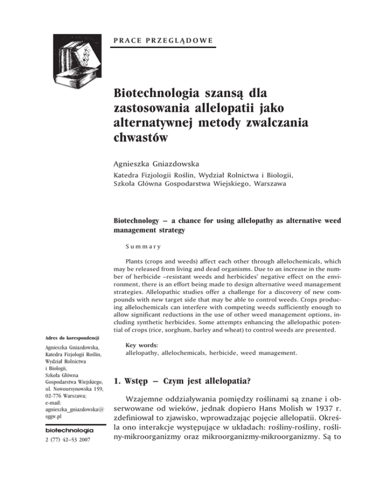 PRACE PRZEGL¥DOWE Biotechnologia szans¹ dla zastosowania allelopatii jako alternatywnej metody zwalczania chwastów Agnieszka Gniazdowska Katedra Fizjologii Roœlin, Wydzia³ Rolnictwa i Biologii, Szko³a G³ówna Gospodarstwa Wiejskiego, Warszawa Biotechnology – a chance for using allelopathy as alternative weed management strategy Summary Plants (crops and weeds) affect each other through allelochemicals, which may be released from living and dead organisms. Due to an increase in the number of herbicide –resistant weeds and herbicides’ negative effect on the environment, there is an effort being made to design alternative weed management strategies. Allelopathic studies offer a challenge for a discovery of new compounds with new target side that may be able to control weeds. Crops producing allelochemicals can interfere with competing weeds sufficiently enough to allow significant reductions in the use of other weed management options, including synthetic herbicides. Some attempts enhancing the allelopathic potential of crops (rice, sorghum, barley and wheat) to control weeds are presented. Adres do korespondencji Agnieszka Gniazdowska, Katedra Fizjologii Roœlin, Wydzia³ Rolnictwa i Biologii, Szko³a G³ówna Gospodarstwa Wiejskiego, ul. Nowoursynowska 159, 02-776 Warszawa; e-mail: agnieszka_gniazdowska@ sggw.pl 2 (77) 42–53 2007 Key words: allelopathy, allelochemicals, herbicide, weed management. 1. Wstêp – Czym jest allelopatia? Wzajemne oddzia³ywania pomiêdzy roœlinami s¹ znane i obserwowane od wieków, jednak dopiero Hans Molish w 1937 r. zdefiniowa³ to zjawisko, wprowadzaj¹c pojêcie allelopatii. Okreœla ono interakcje wystêpuj¹ce w uk³adach: roœliny-roœliny, roœliny-mikroorganizmy oraz mikroorganizmy-mikroorganizmy. S¹ to Biotechnologia szans¹ dla zastosowania allelopatii jako alternatywnej metody zwalczania chwastów oddzia³ywania biochemiczne o charakterze zarówno szkodliwym jak i korzystnym (1). Na pierwszym œwiatowym kongresie allelopatii w 1996 r. rozszerzono tê definicjê i uznano, ¿e allelopatia to zjawisko, w którym zaanga¿owane s¹ wtórne metabolity, wytwarzane przez roœliny, mikroorganizmy i grzyby, wp³ywaj¹ce na wzrost i rozwój systemów biologicznych i rolniczych. Zwi¹zki allelopatyczne (allelopatiny) s¹ to produkty metabolizmu wtórnego roœliny-donora, które po dostaniu siê do œrodowiska oddzia³uj¹ na znajduj¹ce siê w s¹siedztwie roœliny-akceptory. Dzia³anie allelopatin ujawnia siê na wszystkich poziomach organizacji ¿ywego organizmu: od fizjologicznego przez komórkowy, po molekularny, a pod wzglêdem chemicznym obejmuj¹ one ró¿norodne zwi¹zki organiczne. S¹ wœród nich wystêpuj¹ce w formie gazowej terpeny: a-pinen, b-pinen, kamfen, cyneol obecne np. w tkankach bylic (roœliny z rodzaju Artemisia) (2), jak te¿ skomplikowane, wielopierœcieniowe seskwiterpenoidy-heliannany np. heliannuole, laktony seskwiterpenów np. annuolid F ze s³onecznika (Helianthus annuus) (3). G³ówne klasy zwi¹zków allelopatycznych zosta³y szczegó³owo omówione w pracach przegl¹dowych Vyvyan (4) oraz Singh i wsp. (5). Wydzielanie zwi¹zków allelopatycznych do œrodowiska mo¿e odbywaæ siê na ró¿nej drodze: uwalniania lotnych substancji (ewaporacja); wymywania (³ugowanie) przez wodê z opadów atmosferycznych, wodê irygacyjn¹ lub rosê; wydzielania przez system korzeniowy (eksudacja); rozk³adu obumar³ych czêœci roœlin. Poszczególne drogi dostawania siê zwi¹zków allelopatycznych do œrodowiska zosta³y omówione w pracach w jêzyku polskim, m.in. przez Wójcik-Wojtkowiak i wsp. (6) oraz Gniazdowsk¹ i wsp. (7). Nagromadzone w glebie zwi¹zki allelopatyczne pochodz¹ zarówno od roœlin uprawnych, roœlin dziko rosn¹cych, chwastów, jak te¿ mog¹ byæ metabolitami mikroorganizmów glebowych. 2. Allelopatia chwastów Od drugiej po³owy XX w. wzros³o zainteresowanie oddzia³ywaniami allelopatycznymi miêdzy chwastami i roœlinami uprawnymi. Dostarczano coraz wiêcej dowodów, ¿e roœliny uprawne i chwasty wprowadzaj¹ do œrodowiska zwi¹zki chemiczne, które mog¹ byæ toksyczne zarówno dla nich samych, jak równie¿ dla innych gatunków (6). Pojawi³o siê szereg doniesieñ wskazuj¹cych, ¿e niekorzystny wp³yw zachwaszczenia na uprawy jest zwi¹zany nie tylko z konkurencj¹ o œwiat³o, wodê i zwi¹zki mineralne, ale tak¿e mo¿e byæ wynikiem produkowania przez chwasty allelopatin dzia³aj¹cych jako inhibitory wzrostu i rozwoju roœlin uprawnych. Roœliny nale¿¹ce do rodzaju Artemisia to chwasty, wystêpuj¹ce powszechnie w Azji, Europie i Ameryce Pó³nocnej. Bylica pospolita (A. vulgaris) stanowi jeden z najwiêkszych problemów w szkó³kach we wschodnich Stanach Zjednoczonych Ameryki Pó³nocnej (8). Posiada zdolnoœæ do wytwarzania silnego systemu korzeniowego i jest odporna na herbicydy, a tak¿e toleruje powtarzaj¹ce siê koszenie. Z kolei A. campestris, A. annua, A. herba alba i A. princeps var. orientalis tworz¹ gêste monokultury (9,10). Przyczyn¹ BIOTECHNOLOGIA 2 (77) 42-53 2007 43 Agnieszka Gniazdowska tego zjawiska mo¿e byæ zdolnoœæ tych roœlin do syntezy du¿ych iloœci olejków eterycznych w specjalnych gruczo³ach zlokalizowanych na powierzchni liœci. Wykazano w nich obecnoœæ kamfory, kamfenu, cyneolu, a tak¿e artemizininy. Zarówno liœcie jak i wodne ekstrakty Artemisia silnie hamuj¹ wzrost roœlin uprawnych. Tak¿e gleba pobrana z miejsc zajmowanych przez bylice hamuje wzrost i rozwój wielu gatunków roœlin oraz grzybów mikorytycznych. Nie poznano, jak dot¹d, molekularnego pod³o¿a oddzia³ywañ tych substancji, jednak¿e wydaje siê, ¿e charakteryzuj¹ siê mechanizmami dzia³ania, ró¿nymi od mechanizmów dzia³ania typowych dla komercyjnych herbicydów (11). Wulpia mysi ogon (Vulpia myuros) pochodz¹ca z krajów œródziemnomorskich sta³a siê inwazyjnym chwastem Australii. Powoduje dotkliwe straty w plonach i jakoœci zbó¿, a walka z ni¹ jest utru