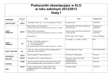 Podręczniki obowiązujące w XLO w roku szkolnym 2012/2013 klasy I PRZEDMIOT JĘZYK POLSKI JĘZYK ANGIELSKI Tytuł KLASA I ABCD ABCD Autor „ Przeszłość to dziś” kl. I cz.1 i 2 (wydanie nowe-2012) K. Mrowcewicz STENTOR Matura Masters Pre-intermediate* *poziom podręcznika zostanie podany uczniom we wrześniu Marta Rosińska, Ken Wilson, Philip Kerr, Lynda Edwards Wydawnictwo Macmillan Matura Masters Intermediate* *poziom podręcznika zostanie podany uczniom we wrześniu Marta Rosińska, Ken Wilson, Philip Kerr, Lynda Edwards Wydawnictwo Macmillan Grammarway 4 Dooley Jenny, Evans Virginia Express Publishing : K. Łunieska U. Tworek Z. Wąsik JĘZYK NIEMIECKI AD JĘZYK ROSYJSKI BC „Wot i my” Język rosyjski dla szkół ponadgimazjalnych. Podręcznik 1 Zeszyt ćwiczeń 1 M. Wiatr-Kmiecik S. Wujec Wyd. Szkolne PWN „Oblicza geografii” /zakres podstawowy/ R.Uliszak, K. Wiedermann Nowa Era E.Bonar W. Krzeszowiec-Jeleń S.Czachorowski Stanisław Roszak Jarosław Kłaczkow Nowa Era Arkadiusz Janicki Nowa Era ABCD BIOLOGIA ABCD „ Biologia na czasie” zakres podstawowy ACBD „Poznać przeszłość. Wiek XX. Podręcznik do historii dla szkoły ponadgimnazjalnej. Zakres podstawowy. Klasa I ABCD Wiedza o społeczeństwie . Podręcznik dla szkół ponadgimnazjalnych "W centrum uwagi” , zakres podstawowy. WOS WSiP „Alles klar“ 1a/1b zakres podstawowy 1a - kurs dla początkujących 1b - kurs kontynuacyjny *poziom podręcznika zostanie podany uczniom we wrześniu GEOGRAFIA HISTORIA Wydawnictwo Nowa Era „Matematyka. Podręcznik do liceów i techników. Klasa 1. Zakres podstawowy i rozszerzony”. Wydanie z 2012r. „Matematyka. Zbiór zadań do liceów i techników. Klasa 1. Poziom podstawowy i rozszerzony”. Wydanie z 2012r. M. Kurczab M. Kurczab E. Świda Matematyka. Podręcznik do liceów i techników. Klasa 1. Zakres podstawowy”. Wydanie z 2012r „Matematyka. Zbiór zadań do liceów i techników. Klasa 1. Zakres podstawowy”. Wydanie z 2012r. M. Kurczab E. Kurczab E. Świda M. Kurczab E. Kurczab E. Świda Oficyna Edukacyjna PAZDRO Oficyna Edukacyjna PAZDRO ABCD „Odkryć fizykę-podręcznik dla szkół ponadgimnazjalnych ” (zakres podstawowy) M.Braun,W.Śliwa NOWA ERA ABCD podręcznik zostanie podany uczniom we wrześniu ABCD 1. seria CIEKAWI ŚWIATA 2. seria ODKRYWAMY NA NOWO *wybór serii zostanie podany uczniom we wrześniu ABCD „Człowiek twórca kultury” zakres podstawowy rozszerzony Z. Majchrowski K. Mrowcewicz STENTOR ABCD „Ciekawi świata - podstawy przedsiębiorczości” Piotr Krzyszczyk OPERON ABCD Informatyka. Po prostu. Zakres podstawowy. Szkoły ponadgimnazjalne. Z. Nowakowski WSiP ABCD „Jestem świadkiem Chrystusa w Kościele” Podręczniki kupić po konsultacji z nauczycielem Z. Marek WAM 2003 AD MATEMATYKA BC FIZYKA CHEMIA EDUKACJA DLA BEZPIECZEŃSTWA WOK PRZEDSIĘBIORCZOŚĆ TECHNOLOGIA INFORMACYJNA RELIGIA M. Kurczab M. Kurczab E. Świda Oficyna Edukacyjna PAZDRO Oficyna Edukacyjna PAZDRO OPERON Podręczniki obowiązujące w XLO w roku szkolnym 2012/2013 klasy II PRZEDMIOT JĘZYK POLSKI KLASA II ABCD ABCD JĘZYK ANGIELSKI AD JĘZYK ROSYJSKI BC BIOLOGIA HISTORIA Grammarway 4 (kontynuacja) „Alles klar“ 1b/2a zakres podstawowy (nowe wydanie) ABC D B „Wot i my” Język rosyjski dla szkół ponadgimazjalnych. Podręcznik 2 Zeszyt ćwiczeń 2 „Geografia cz.2” /zakres podstawowy/ „Geografia społeczno-ekonomiczna” /zakres rozszerzony/ „Biologia 2”, zakres rozszerzony ACD „ Biologia 2” zakres podstawowy ABD C „Historia 2 ” – kształcenie w zakresie podstawowym Historia dla maturzysty. Nowożytność. Zakres rozszerzony. Historia. Zeszyt do ćwiczeń na mapach konturowych. Wiek XVI-XIX. zeszyt przedmiotowy formatu A4 "Wiedza o społeczeństwie. Podręcznik dla liceum ogólnokształcącego, liceum profilowanego i technikum, zakres podstawowy. „Wiedza o społeczeństwie – zakres podstawowy” „Wiedza o społeczeństwie – zakres rozszerzony” „Atlas. Wiedza o społeczeństwie. Gimnazjum. Szkoły ponadgimnazjalne, zakres podstawowy i rozszerzony.” zeszyt przedmiotowy formatu A4 ABD WOS „ Przeszłość to dziś” kl. II cz.1 (wydanie zmienione) „ Przeszłość to dziś” kl. II cz. 2. (wydanie zmienione) Matura Masters Intermediate (kontynuacja) Matura Masters Upper-intermediate JĘZYK NIEMIECKI GEOGRAFIA Tytuł C Autor Wydawnictwo A. Nawarecki, D. Siwicka E. Paczoska Marta Rosińska, Ken Wilson, Philip Kerr, Lynda Edwards Marta Rosińska, Ken Wilson, Philip Kerr, Lynda Edwards Dooley Jenny, Evans Virginia K. Łunieska U. Tworek Z. Wąsik STENTOR STENTOR Wydawnictwo Macmillan Wydawnictwo Macmillan Express Publishing WSiP M. Wiatr-Kmiecik S. Wujec Wyd. Szkolne PWN J. Kop, M. Kucharska, E. Szkurłat J. Kop, M. Kucharska, E. Szkurłat E.Holak W. Lewiński, M. Łaszczyca G. Skirmuntt J.Walkiewicz J. Balerstet, E. Bartnik, J. Holak, W. Lewiński, M. Łaszczyca, K. Sabath, J. Choińska - Mike P. Szlanta K. Zielińska Jarosław Czubaty Włodzimierz Chybowski Wyd. Szk. PWN Wyd. Szk. PWN OPERON Zbigniew Smutek, Janusz Maleska, Beata Surmacz OPERON K.A. Wojtaszczyk WSiP OPERON WSiP Wyd. Szk. PWN Wyd. Szk. PWN Nowa era AD MATEMATYKA BC BCD „Matematyka. Podręcznik dla liceów i techników. Klasa II. Zakres podstawowy i rozszerzony”. Wydanie I Matematyka. Zbiór zadań dla liceów i techników. Klasa II. Zakres podstawowy i rozszerzony”. Wydanie II zmienione Matematyka. Podręcznik dla liceów i techników. Klasa 2. Zakres podstawowy”. Wydanie I, 2009r. „Matematyka. Zbiór zadań dla liceów i techników. Klasa 2. Zakres podstawowy”. „Fizyka dla szkół ponadgimnazjalnych” „Fizyka dla szkół ponadgimnazjalnych” FIZYKA CHEMIA PO PRZEDSIĘBIORCZOŚĆ A ABCD ABCD ABC D TECHNOLOGIA INFORMACYJNA RELIGIA A ABCD „Fizyka dla szkół ponadgimnazjalnych treści rozszerzające część 1” „Fizyka dla szkół ponadgimnazjalnych treści rozszerzające część 2” podręcznik zostanie podany uczniom we