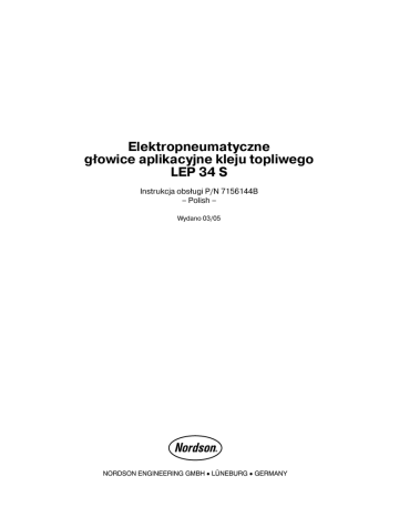 Elektropneumatyczne g³owice aplikacyjne kleju topliwego LEP 34 S Instrukcja obs³ugi P/N 7156144B – Polish – Wydano 03/05 NORDSON ENGINEERING GMBH LÜNEBURG GERMANY Uwaga Niniejsza instrukcja obs³ugi odnosi siê do ca³ej serii urz¹dzeñ. Numer zamówienia P/N = Numer zamówienia dla produktów firmy Nordson Wskazówka To jest chroniona prawem autorskim publikacja firmy Nordson. Copyright 2003. Fotokopiowanie, powielanie w inny sposób lub t³umaczenie na inne jêzyki tego dokumentu – jak równie¿ jego pojedynczych czêœci – bez uprzedniego pisemnego zezwolenia firmy Nordson jest zabronione. Firma Nordson zastrzega sobie prawo na wprowadzenie zmian bez specjalnego uprzedzenia. © 2005 Wszelkie prawa zastrze¿one. Znaki towarowe AccuJet, AeroCharge, AquaGuard, Asymtek, Automove, Autotech, Baitgun, Blue Box, CanWorks, Century, CF, Clean Coat, CleanSleeve, CleanSpray, Control Coat, CoolWave, Cross‐Cut, Cyclo‐Kinetic, Dispensejet, DispenseMate, Durafiber, Durasystem, Easy Coat, Easymove Plus, Econo‐Coat, EFD, ETI, Excel 2000, FlexiCoat, Flexi‐Spray, Flex‐O‐Coat, Flow Sentry, Fluidmove, FoamMelt, FoamMix, Heli‐flow, Helix, Horizon, Hot Shot, Isocoil, Isocore, Iso‐Flo, JR, KB30, Kinetix, Little Squirt, Magnastatic, MEG, Meltex, Microcoat, Micromark, MicroSet, Millenium, Mini Squirt, Moist‐Cure, Mountaingate, MultiScan, Nordson, OmniScan, OptiMix, Package of Values, Patternview, PermaFlo, Plasmod, PluraFoam, Porous Coat, PowderGrid, Powderware, Prism, ProBlue, Pro‐Flo, ProLink, Pro‐Meter, Pro‐Stream, RBX, Rhino, Saturn, SC5, S. design stylized, Seal Sentry, Select Charge, Select Coat, Select Cure, Slautterback, Smart‐Coat, Solder Plus, Spectrum, Speed‐Coat, Spraymelt, Spray Squirt, Super Squirt, Sure Coat, Tela‐Therm, Tracking Plus, Trends, Tribomatic, Ultrasaver, UniScan, UpTime, Veritec, VersaBlue, Versa‐Coat, Versa‐Screen, Versa‐Spray, Walcom, Watermark, When you expect more. to zarejestrowane znaki towarowe – ® – Nordson Corporation. AeroDeck, AeroWash, Apogee, ATS, Auto‐Flo, AutoScan, BetterBook, CanNeck, Chameleon, Check Mate, ColorMax, Controlled Fiberization, Control Weave, CPX, Dry Cure, DuraBlue, Dura‐Coat, DuraPail, Dura‐Screen, Easy Clean, Eclipse, EcoDry, e.DOT, E‐Nordson, Equi=Bead, ESP, e Stylized, Fillmaster, Fill Sentry, Gluie, HDLV, iControl, iFlow, Ink‐Dot, iON, Iso‐Flex, iTrend, KVLP, Lacquer Cure, March, Maxima, MicroFin, MicroMax, Minimeter, Multifil, OptiStroke, Origin, PatternPro, PluraMix, Powder Pilot, Powercure, Primarc, Printplus, Process Sentry, Pulse Spray, PurTech, Ready Coat, Scoreguard, Select Series, Sensomatic, Shaftshield, SheetAire, Spectral, Spectronic, Speedking, Spray Works, Summit, SureBead, Sure Brand, Sure Clean, Sure‐Max, Swirl Coat, Tempus, ThruWave, Trade Plus, Trak, Ultrasmart, Universal, Vantage, Viper, Vista, Web Cure, 2 Rings (Design) to znaki towarowe – – Nordson Corporation. Oznaczenia i znaki przedsiêbiorstw mog¹ byæ markami towarowymi, których u¿ywanie przez osoby trzecie do w³asnych celów mo¿e pogwa³ciæ prawa ich posiadaczy. P/N 7156144B LEP 34 S 2005 Nordson Corporation Spis treœci I Spis treœci 2005 Nordson Corporation Zasady bezpiecznego u¿ytkowania . . . . . . . . . . . . . . . . . . . . . . . 1 Uwagi dotycz¹ce instrukcji obs³ugi . . . . . . . . . . . . . . . . . . . . . . . 1 Opis . . . . . . . . . . . . . . . . . . . . . . . . . . . . . . . . . . . . . . . . . . . . . . . . . . . . . Zakres zastosowañ . . . . . . . . . . . . . . . . . . . . . . . . . . . . . . . . . . . . . . . . Przyk³ady niew³aœciwego u¿ycia . . . . . . . . . . . . . . . . . . . . . . . . . . Pozosta³e zagro¿enia . . . . . . . . . . . . . . . . . . . . . . . . . . . . . . . . . . . . . . Przeznaczenie . . . . . . . . . . . . . . . . . . . . . . . . . . . . . . . . . . . . . . . . . . . . Przyk³adowa aplikacja: klejenie etykiet . . . . . . . . . . . . . . . . . . . . Omówienie serii . . . . . . . . . . . . . . . . . . . . . . . . . . . . . . . . . . . . . . . . . . . Blok powietrza rozpryskuj¹cego . . . . . . . . . . . . . . . . . . . . . . . . Blok z przy³¹czem wê¿a / p³yta koñcowa z przy³¹czem wê¿a Blok z³o¿ony . . . . . . . . . . . . . . . . . . . . . . . . . . . . . . . . . . . . . . . . . Model odporny na zachlapania . . . . . . . . . . . . . . . . . . . . . . . . . . . Tabliczka znamionowa . . . . . . . . . . . . . . . . . . . . . . . . . . . . . . . . . . . Objaœnienie opisu . . . . . . . . . . . . . . . . . . . . . . . . . . . . . . . . . . . . . Akcesoria . . . . . . . . . . . . . . . . . . . . . . . . . . . . . . . . . . . . . . . . . . . . . . . . . Filtr materia³u . . . . . . . . . . . . . . . . . . . . . . . . . . . . . . . . . . . . . . . . . . . Wspornik . . . . . . . . . . . . . . . . . . . . . . . . . . . . . . . . . . . . . . . . . . . . . . . 1 1 2 2 3 3 4 5 5 5 6 6 6 7 7 7 Instalacja . . . . . . . . . . . . . . . . . . . . . . . . . . . . . . . . . . . . . . . . . . . . . . . . Rozpakowanie . . . . . . . . . . . . . . . . . . . . . . . . . . . . . . . . . . . . . . . . . . . . Transport . . . . . . . . . . . . . . . . . . . . . . . . . . . . . . . . . . . . . . . . . . . . . . . . . Przechowywanie . . . . . . . . . . . . . . . . . . . . . . . . . . . . . . . . . . . . . . . . . . Utylizacja . . . . . . . . . . . . . . . . . . . . . . . . . . . . . . . . . . . . . . . . . . . . . . . . . Instalacja . . . . . . . . . . . . . . . . . . . . . . . . . . . . . . . . . . . . . . . . . . . . . . . . . Odprowadzanie oparów kleju . . . . . . . . . . . . . . . . . . . . . . . . . . . . . Po³¹czenia elektryczne . . . . . . . . . . . . . . . . . . . . . . . . . . . . . . . . . . . . . Prowadzenie kabli . . . . . . . . . . . . . . . . . . . . . . . . . . . . . . . . . . . . . . . Kabel zasilaj¹cy . . . . . . . . . . . . . . . . . . . . . . . . . . . . . . . . . . . . . . Pod³¹czanie g³owicy aplikacyjnej . . . . . . . . . . . . . . . . . . . . . 