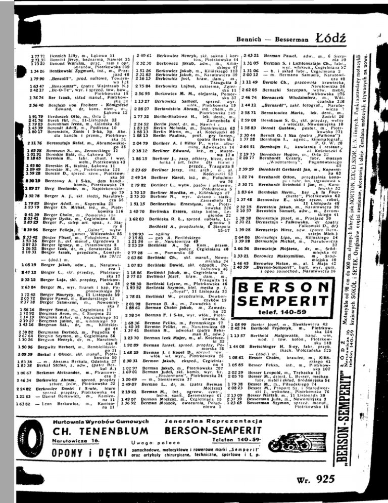 Bennich — Besserman Łódź Bennich L i l l y , m.. Ł ą k o w a 1 1 2 49 6 1 Berkowlcz H e n r y k , s k l . sukna i k o r 2 43 2 1 Berman P a w e ł , a d w . , C Sierp Benołst Jerzy, bednarnia. N a w r o t 35 t ó w . P i o t r k o w s k a 44 nia 29 Benoist W i l h e l m , prac. r a m I o p r , 2 32 30 Berkowlcz Jakub, a d w . , m . , K i l i ń 1 3 1 0 5 Berman S. i Lichtensztajn C h . , f a b r . , obrazów, Piotrkowska 209 skiego 47 w y r . w ł ó k i e n . , Cegielniana 52 1 5 1 26 Berkowlcz Jakub, m . , Kilińskiego 113 1 3 1 0 6 — b . i skład f a b r . , Cegielniana 3 1 34 26 Bentkowski Z y g m u n t , i n ż . , m . , Prze j a z d 46 2 3 1 8 2 Berkowlcz Jakub, n i . , Narutowicza 39 2 0 0 1 2 — m . Bermana Samuela, N a r u t o w i 21613 17990 „ B e n z o l i t " , p r o d . naftowe, T o w a r o Berkowlcz Joel, kraw. dam., m., I cza 40 wa 1.21 T r a u g u t t a 5 1 1 1 1 4 9 Bermlc C h . , pracownia krawiecka, 1 6 3 47 „ B e n z o s m a r " , (patrz W a j n t r a u b N . ) 2 75 84 Berkowlcz L a j b u ś , cukiernia Zgier Narutowicza 56 „ B e - O - T e " , w y r . i sprzed, t o w . b a w . , ska U 2 62 05 Bernacki Szczepan, wytw. mebli. 9 Piotrkowska 18 2 4217 2 56 95 B e r k o w l c z M . M . , o l e j a r n i a , Pomor P i o t r k o w s k a 275 p~ i Ber Izaak, skład manuf., P i o t r k o w ska 37 2 46 7 4 Bernaczek Włodzimierz, m . . Wól ska 24 1 7 6 74 czańska 226 1 1 3 27 Berkowlcz Samuel, sprzed, w y r . Berchem v o n Frelherr - Könlgsfeld „ B e r n a r d l " , zakł. fotograf., Naruto w ł ó k . . P i o t r k o w s k a 19 1 4 4 1 1 Edward, d r , kons. n i e m . , m . . 2 56 40 wicza 1 2 28 27 Berlandsteln A b r a m , i n ż . chem., m „ Ł ą k o w a 13 P i o t r k o w s k a 249 2 5 8 7 1 B e r n a t o w i c z M a r l a , lek. dent., m . . Ż w i r k i 26 1 9 1 7 9 Berduszek Otto, m . . Orla 5 1 7 7 32 Berlln-Raabowa H . , l e k . d e n t . 2 4 1 7 6 Berek HU, m . , 11-Llstopada 33 Zamenhofa 6 2 59 08 Bernbaum S. G., s k ł . p r z ę d z y , wełny 1 7 9 0 3 Berenblum I r e n a , m . , G d a ń s k a 63 2 24 5 2 B e r l i n Józef, d r , m . , N a w r o t I i w ł ó c z k i , N o w o m i e j s k a 10 1 4 3 3 9 Berendt Adolf, m . . Podleśna 10 1 8 3 1 5 B e r l i n Melania, m . , Sienkiewicza 63 1 58 83 Berndt G u s t a w , pastor, m . . Piotr 1 8 0 1 7 Berensteln, Zonls i S-ka, Sp. A k c . 1 8 8 1 3 B e r l i n M i r o n , m . , a l . Kościuszki 46 kowska 2 7 1 przem., Piotrkow 18813 Berlin Paulina, proi. g r y f o r t e p . , 2 3 0 44 B e r n d t O . I Ska ( p a t r z „ F a l k o n a " ) dla handlu ska 5 1 ( p a t r z B e r l i n M . ) 1 37 28 B e r n h a j m I . , a g e n c , k i n e m a t o g r a f . , 8 2 04 79 Berllner A . I Hiller P . , w y t w . albu P. O. W . 20 2 1 1 7 6 Berensztajn R a f a ł , m . , A b r a m o w s k i e Ix, NI go 35 m i n y . Adwokacka 14 2 64 5 1 B e r n h a j m f . , kawiarnia i restaur., 21812 Berllner E d w a r d , i n ż . , m . , Mosto 1 6 5 08 Berenzon S., m . , Żeromskiego 1 1 a l . Kościuszki 6 wa 17 a 2 1 9 73 Bernecker H u g o n , m . . Orla 12 1 0 1 9 1 Bereskin Bala, m . , Ł ą k o w a 10 O 'w chust. I w y r . 1 86 15 Berllner J.. pasy, p l k i e r y , bicze, c z ó 2 2 0 77 B e r n h a r d t 2 1 8 65 Bereskin H . , fabr. Cezary, fabr. maszyn „Wodoturblny , Pogonowskiego wełn., Piotrkowska 43 łenka I a r t . techn dla t k a l n i I ~* "3, 1 9 3 80 Bereskin H . , t k a l n i a , Ł ą k o w a 1 1 przędz., Traugutta 8 I Ü4 i» 1 0 9 49 Bereskin H . , m , , Piotrkowska 1 2 1 Koperni inż. arch., m . , a l . 2 39 29 B e r n h a r d t G e r b a r d t J a n , 2 23 69 Berllner Jerzy, U 'C 1 5 9 28 I Berezin D., sprzed, szew.. P i o t r k o w ka 63 Kościuszki 53 ska 68 2 49 14 Berllner K a r o l , i n ż . , m . , P o ł u d n i o 1 2 2 7 4 B e r n h a r d t O t t o n , p r z ę d z a l n i a k o n o pi i labr. l i n , Ogrodowa u 2 3 0 1 9 Berezowy A . I S-ka, dom h a n d l . - I wa 76 W o* k o m i s . , Piotrkowska 79 2 79 82 Berllner L . , w y t w . p a s ó w i p i k i e r ó w . 2 3 0 7 1 B e r n h a r d t Reinhold i J a n , m . , K a r o I - Cl lewska 5 2 1 8 9 2 7 Berg Beniamin, t n . , Napiórkowskie Południowa 5 i Z 1 83 64 Bernheim H e r m . , b a r „ i la F o u r go 79 1 7 0 1 5 Berllner M o r d k a , m . , Kilińskiego 47 1 3 2 78 Berger A . J., skł. śledzi, N a r u t o w i chette". Piotrkowska 62 2 75 3 5 Berllner N . , w y r . dziano - s i a t k . , I cza 66 Zamenhola 13 I 1 3 7 4 8 Bernowicz E . , sklep ręczn. r o b o t , IZ I I Listopada 48 1 7 9 8 5 Berger Adolf, m , Kopernika 2 1 15115 Berllnerblau Ernestyna, m . . Piotr Jakub, m., N a r u t o w i c z a 96' kowska 226 | 2 3 2 1 5 Bernstein 1 23 79 Berger Ch. Michał, i n ż . , m . . P i o t r kowska 116 1 40 70 Berlińska Estera, sklep k o l o n . . L e 2 1 0 5 7 Bernstein Samuel, a d w . , m . , Ż e r o m skiego 4 1 2 4 1 3 9 (Berger Chalm, m . , Pomorska l l a gionów 22 2 03 4 1 B e r g e r D y d i a , m . , Cegielniana 58 I 1 6 2 03 Berlińska R. Ł . , sprzed, nabiału, L e ' 1 38 5 8 Bernsztajn J ó z e f , m . . Przejazd 30 dr (patrz 185 25 Berger F . , sklep a r t . s p o ż . , r . Sta g i o n ó w 8 2 5 1 2 1 Bernsztajn - F a ł k o w s k a , Falkowski D , d r ) ry 5 Berliński A . , przędzalnia, 6 Sierpnia 2 39 96 Berger Felicja, i . „ G a i n e " , wytw. 1 3 9 28 Bernsztejn H l r s z , a d w . ( p a t r z K e r n 15-17 w gorset.. Wólczańska 85 sztejn M i c h . ) 1 2 0 93 — ogólny (3 2 64 86 Bernsztejn L i p a , m . , K i l i ń s k i e g o 14 2 33 42 Berger Fisze!, m . , Południowa 92 2 1 5 8 1 — gab A . Berlińskiego >» ca 1 5 3 1 6 Berger I . , s k ł . manuf., Ogrodowa 1 Bernsztejn M i c h a ł , m., N a r u t o w i c z a 1 3 9 2 8 1 2 1 5 4 — m., Narutowicza 49 2 07 23 Berger Ignacy, m . , Piramowicza 8 37 2 23 29 Berliński A . , Sp. K o m . , p r z e m . 1 2 6 52 Berger Izak, d r , m . , Senatorska 36 d r , m . . Śród p o ń c z . . Cegielniana 40 1 6 6 56 Bernsztejn M o j ż e s z , co t, 2