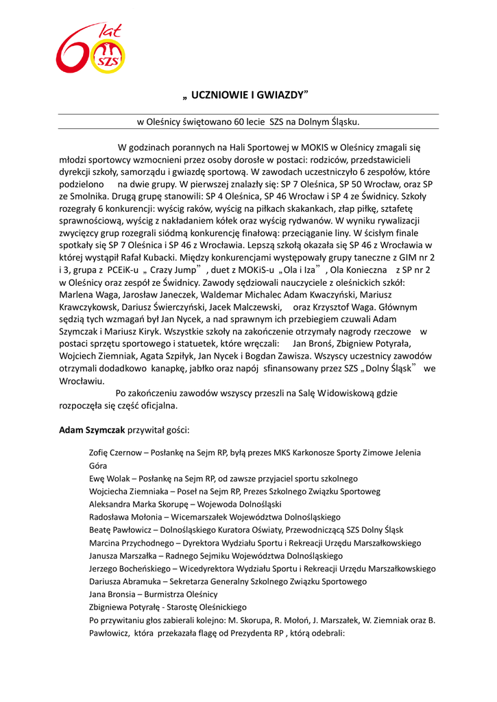 „ UCZNIOWIE I GWIAZDY” w Oleśnicy świętowano 60 lecie SZS na Dolnym Śląsku. W godzinach porannych na Hali Sportowej w MOKIS w Oleśnicy zmagali się młodzi sportowcy wzmocnieni przez osoby dorosłe w postaci: rodziców, przedstawicieli dyrekcji szkoły, samorządu i gwiazdę sportową. W zawodach uczestniczyło 6 zespołów, które podzielono na dwie grupy. W pierwszej znalazły się: SP 7 Oleśnica, SP 50 Wrocław, oraz SP ze Smolnika. Drugą grupę stanowili: SP 4 Oleśnica, SP 46 Wrocław i SP 4 ze Świdnicy. Szkoły rozegrały 6 konkurencji: wyścig raków, wyścig na piłkach skakankach, złap piłkę, sztafetę sprawnościową, wyścig z nakładaniem kółek oraz wyścig rydwanów. W wyniku rywalizacji zwycięzcy grup rozegrali siódmą konkurencję finałową: przeciąganie liny. W ścisłym finale spotkały się SP 7 Oleśnica i SP 46 z Wrocławia. Lepszą szkołą okazała się SP 46 z Wrocławia w której wystąpił Rafał Kubacki. Między konkurencjami występowały grupy taneczne z GIM nr 2 i 3, grupa z PCEiK-u „ Crazy Jump”, duet z MOKiS-u „Ola i Iza”, Ola Konieczna z SP nr 2 w Oleśnicy oraz zespół ze Świdnicy. Zawody sędziowali nauczyciele z oleśnickich szkół: Marlena Waga, Jarosław Janeczek, Waldemar Michalec Adam Kwaczyński, Mariusz Krawczykowsk, Dariusz Świerczyński, Jacek Malczewski, oraz Krzysztof Waga. Głównym sędzią tych wzmagań był Jan Nycek, a nad sprawnym ich przebiegiem czuwali Adam Szymczak i Mariusz Kiryk. Wszystkie szkoły na zakończenie otrzymały nagrody rzeczowe w postaci sprzętu sportowego i statuetek, które wręczali: Jan Bronś, Zbigniew Potyrała, Wojciech Ziemniak, Agata Szpiłyk, Jan Nycek i Bogdan Zawisza. Wszyscy uczestnicy zawodów otrzymali dodadkowo kanapkę, jabłko oraz napój sfinansowany przez SZS „Dolny Śląsk” we Wrocławiu. Po zakończeniu zawodów wszyscy przeszli na Salę Widowiskową gdzie rozpoczęła się część oficjalna. Adam Szymczak przywitał gości: Zofię Czernow – Posłankę na Sejm RP, byłą prezes MKS Karkonosze Sporty Zimowe Jelenia Góra Ewę Wolak – Posłankę na Sejm RP, od zawsze przyjaciel sportu szkolnego Wojciecha Ziemniaka – Poseł na Sejm RP, Prezes Szkolnego Związku Sportoweg Aleksandra Marka Skorupę – Wojewoda Dolnośląski Radosława Mołonia – Wicemarszałek Województwa Dolnośląskiego Beatę Pawłowicz – Dolnośląskiego Kuratora Oświaty, Przewodniczącą SZS Dolny Śląsk Marcina Przychodnego – Dyrektora Wydziału Sportu i Rekreacji Urzędu Marszałkowskiego Janusza Marszałka – Radnego Sejmiku Województwa Dolnośląskiego Jerzego Bocheńskiego – Wicedyrektora Wydziału Sportu i Rekreacji Urzędu Marszałkowskiego Dariusza Abramuka – Sekretarza Generalny Szkolnego Związku Sportowego Jana Bronsia – Burmistrza Oleśnicy Zbigniewa Potyrałę - Starostę Oleśnickiego Po przywitaniu głos zabierali kolejno: M. Skorupa, R. Mołoń, J. Marszałek, W. Ziemniak oraz B. Pawłowicz, która przekazała flagę od Prezydenta RP , którą odebrali: Kopik Katarzyna - uczennica SP 4 Oleśnica Malczewski Jacek - nauczyciel Gim 2 Oleśnica Mariola Pagacz - pracownik biura SZS „Dolny Śląsk” we Wrocławiu W dalszej części nastąpiło: Wręczenie wyróżnień Postaciom 60 lecia. Nagrody ( list, upominek od Marszałka, medal 60 lecia) wręczali : Rafał Jurkowlaniec, Radosław Mołoń, Beata Pawłowicz, Wojciech Ziemniak. Otrzymuja je: Józef Wiatrowski, Antoni Kurzyński, Zbigniew Lipiński, Andrzej Surówka, Adam Kaźmierczyk, Stanisław Kochanowski Wręczenie wyróżnień byłym szefom SZS. Nagrody ( list, medal 60 lecia i płomień ) wręczają Beata Pawłowicz, Radosław Mołoń, Dariusz Abramuk ) Otrzymują je: Ryszard Helemejko, Andrzej Włodarczyk, Andrzej Surówka,, Jerzy Bocheński Wręczenie medali „ Przyjaciel Sportu Szkolnego „ przyznanych przez ZG SZS. Nasze działania nie byłyby możliwe gdyby nie przyjaźń i wsparcie przyjaciół sportu szkolnego, mamy ich wielu i wśród posłów i samorządowców i wśród właścicieli firm i wśród innych osób wspomagających nas. To specjalny medal, który dzisiaj trafia do specjalnych osób, które są z nami, często od wielu lat i na które, jak na przyjaciela, możemy zawsze liczyć. Medale wręczają Wojciech Ziemniak i Beata Pawłowicz. Otrzymują je: Zofia Czernow, Ewa Wolak, Marcin Przychodny, Arkadiusz Zagrodnik, Zbigniew Rutka – z-ca dyrektora Wydziału Oświaty, Kultury i Sportu Urzędu Miasta Legnica Ewa Kocemba - Starosta Kamiennogórski Michał Lenkiewicz - Wicestarosta Powiatu Jaworskiego Artur Biliński - Starosta Zgorzelecki Jan Bronś - Burmistrz Miasta Oleśnica, Zbigniew Potyrała - Starosta Oleśnicki, Marcin Kasina - Wójt Gminy Oleśnica, Janusz Rusinek – właściciel firmy Powerman Sport Zbigniew Sozański - Przewodniczący Rady Miejskiej w Środzie Śląskiej Mirosław Baraniecki - Zastępca Burmistrza Środy Śląskiej Dorota Pawnuk - Burmistrz Strzelina Jan Serkies - Burmistrz Miasta Chojnowa Marcin Orzeszek - Burmistrz Ząbkowic Śląskich Roman Fester - Starosta Ząbkowicki Ryszard Zelinka – Przewodniczący rady Miejskiej w Oleśnicy Dariusz Chmura – Burmistrz Wołowa Paweł Choczaj - dyrektor Wydziału Edukacji Starostwa Powiatowego w Złotoryi Marek Marzec - właściciel firmy TOP Sport Medale „ Za zasługi w sporcie szkolnym „ przyznał Zarząd Główny SZS . Wręcza Wojciech Ziemniak i Ryszard Helemejko. Otrzymują je: Franciszek Hawrysz, Leszek Leśko, Władysław Zięba. Odznaki Zasłużony dla Sportu na Dolnym Śląsku nadane przez Zarząd DFS. Wręczają Aleksander Marek Skorupa i Adam Szymczak. Otrzymują je: Zenon Król, Bogusław Dolata, Roman Danilewicz, Wiesław Cerazy, Przemysław Chorzępa, Joanna Maceluch , Zdzisław Maceluch, Zdzisław Kulmatycki, Lucjan Morajda , Marek Kachniarz, Grażyna Ramska , Edward Spraski Zbiorowe odznaki „ Za zasługi w sporcie szkolnym „. Wręczają Beata Pawłowicz i Marcin Przychodny. Otrzymują j