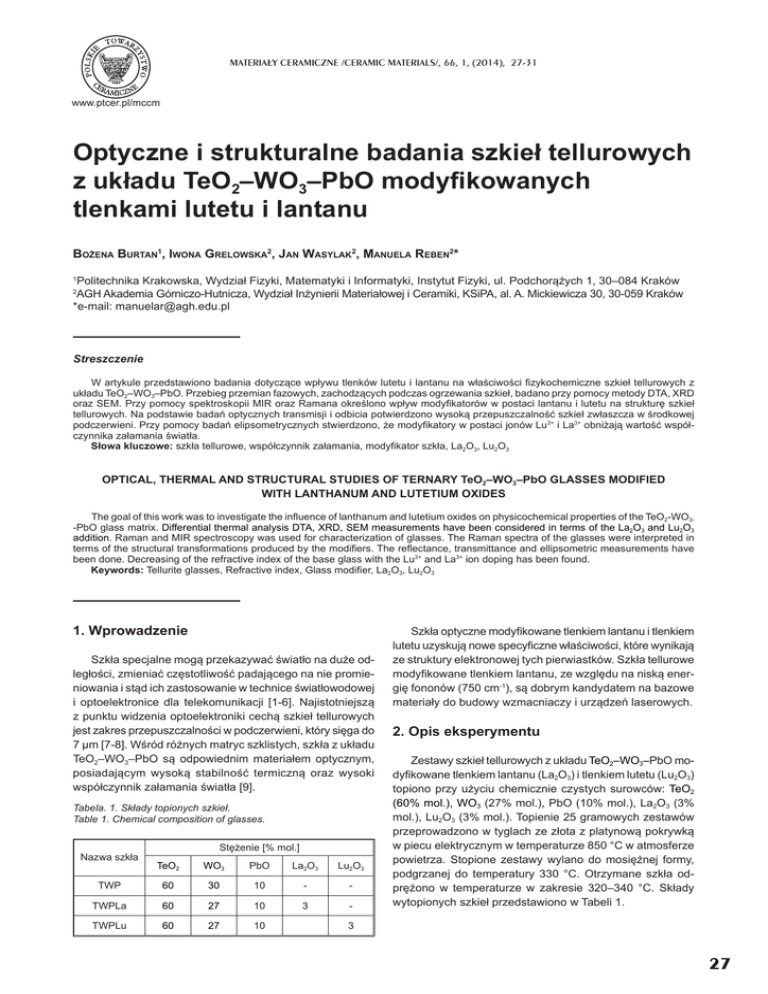 MATERIA£Y CERAMICZNE /CERAMIC MATERIALS/, 66, 1, (2014), 27-31 www.ptcer.pl/mccm Optyczne i strukturalne badania szkieá tellurowych z ukáadu TeO2–WO3–PbO mody¿kowanych tlenkami lutetu i lantanu BOĩENA BURTAN1, IWONA GRELOWSKA2, JAN WASYLAK2, MANUELA REBEN2* 1 Politechnika Krakowska, Wydziaá Fizyki, Matematyki i Informatyki, Instytut Fizyki, ul. PodchorąĪych 1, 30–084 Kraków AGH Akademia Górniczo-Hutnicza, Wydziaá InĪynierii Materiaáowej i Ceramiki, KSiPA, al. A. Mickiewicza 30, 30-059 Kraków *e-mail: [email protected] 2 Streszczenie W artykule przedstawiono badania dotyczące wpáywu tlenków lutetu i lantanu na wáaĞciwoĞci ¿zykochemiczne szkieá tellurowych z ukáadu TeO2–WO3–PbO. Przebieg przemian fazowych, zachodzących podczas ogrzewania szkieá, badano przy pomocy metody DTA, XRD oraz SEM. Przy pomocy spektroskopii MIR oraz Ramana okreĞlono wpáyw mody¿katorów w postaci lantanu i lutetu na strukturĊ szkieá tellurowych. Na podstawie badaĔ optycznych transmisji i odbicia potwierdzono wysoką przepuszczalnoĞü szkieá zwáaszcza w Ğrodkowej podczerwieni. Przy pomocy badaĔ elipsometrycznych stwierdzono, Īe mody¿katory w postaci jonów Lu3+ i La3+ obniĪają wartoĞü wspóáczynnika zaáamania Ğwiatáa. Sáowa kluczowe: szkáa tellurowe, wspóáczynnik zaáamania, mody¿kator szkáa, La2O3, Lu2O3 OPTICAL, THERMAL AND STRUCTURAL STUDIES OF TERNARY TeO2–WO3–PbO GLASSES MODIFIED WITH LANTHANUM AND LUTETIUM OXIDES The goal of this work was to investigate the inÀuence of lanthanum and lutetium oxides on physicochemical properties of the TeO2-WO3-PbO glass matrix. Differential thermal analysis DTA, XRD, SEM measurements have been considered in terms of the La2O3 and Lu2O3 addition. Raman and MIR spectroscopy was used for characterization of glasses. The Raman spectra of the glasses were interpreted in terms of the structural transformations produced by the modi¿ers. The reÀectance, transmittance and ellipsometric measurements have been done. Decreasing of the refractive index of the base glass with the Lu3+ and La3+ ion doping has been found. Keywords: Tellurite glasses, Refractive index, Glass modi¿er, La2O3, Lu2O3 1. Wprowadzenie Szkáa specjalne mogą przekazywaü Ğwiatáo na duĪe odlegáoĞci, zmieniaü czĊstotliwoĞü padającego na nie promieniowania i stąd ich zastosowanie w technice Ğwiatáowodowej i optoelektronice dla telekomunikacji [1-6]. Najistotniejszą z punktu widzenia optoelektroniki cechą szkieá tellurowych jest zakres przepuszczalnoĞci w podczerwieni, który siĊga do 7 m [7-8]. WĞród róĪnych matryc szklistych, szkáa z ukáadu TeO2–WO3–PbO są odpowiednim materiaáem optycznym, posiadającym wysoką stabilnoĞü termiczną oraz wysoki wspóáczynnik zaáamania Ğwiatáa [9]. Tabela. 1. Skáady topionych szkieá. Table 1. Chemical composition of glasses. StĊĪenie [% mol.] Nazwa szkáa TeO2 WO3 PbO La2O3 Lu2O3 TWP 60 30 10 - - TWPLa 60 27 10 3 - TWPLu 60 27 10 Szkáa optyczne mody¿kowane tlenkiem lantanu i tlenkiem lutetu uzyskują nowe specy¿czne wáaĞciwoĞci, które wynikają ze struktury elektronowej tych pierwiastków. Szkáa tellurowe mody¿kowane tlenkiem lantanu, ze wzglĊdu na niską energiĊ fononów (750 cm-1), są dobrym kandydatem na bazowe materiaáy do budowy wzmacniaczy i urządzeĔ laserowych. 2. Opis eksperymentu Zestawy szkieá tellurowych z ukáadu TeO2–WO3–PbO mody¿kowane tlenkiem lantanu (La2O3) i tlenkiem lutetu (Lu2O3) topiono przy uĪyciu chemicznie czystych surowców: TeO2 (60% mol.), WO3 (27% mol.), PbO (10% mol.), La2O3 (3% mol.), Lu2O3 (3% mol.). Topienie 25 gramowych zestawów przeprowadzono w tyglach ze záota z platynową pokrywką w piecu elektrycznym w temperaturze 850 °C w atmosferze powietrza. Stopione zestawy wylano do mosiĊĪnej formy, podgrzanej do temperatury 330 °C. Otrzymane szkáa odprĊĪono w temperaturze w zakresie 320–340 °C. Skáady wytopionych szkieá przedstawiono w Tabeli 1. 3 27 B. BURTAN, I. GRELOWSKA, J. WASYLAK, M. REBEN 2.1. Metodyka badaĔ Badania strukturalne szkieá tellurowych z ukáadu TeO2 – WO3 – PbO – La2O3 oraz TeO2 – WO3 – PbO – Lu2O3 przeprowadzono przy uĪyciu spektroskopii w podczerwieni (MIR – ang. mid-infrared oraz spektroskopii Ramana). Pomiary w obszarze MIR zastaáy wykonane na spektrometrze fourierowskim Vertex 70v ¿rmy Bruker. Widma zarejestrowano w skali absorbancji w zakresie 4000–400 cm-1, przy 256 skanach i rozdzielczoĞci 4 cm-1. Pomiary ramanowskie wykonano na spektrometrze Horiba Jobin Yvon LabRam HR800. Jako Ĩródáa wzbudzającego uĪyto lasera Ar+ 532 nm. Widma rejestrowano w zakresie 50–4000 cm-1. Charakterystyczne efekty termiczne zachodzące podczas ogrzewania szkieá tellurowych zbadano przy wykorzystaniu termicznej analizy róĪnicowej (DTA – ang. differential thermal analysis) i skaningowej kalorymetrii róĪnicowej (DSC – ang. differential scanning calorimetry). Amor¿cznoĞü otrzymanych szkieá bezpoĞrednio po wytopie potwierdzono przy pomocy badaĔ rentgenowskich (XRD – ang. X-ray diffraction). Pomiary elipsometryczne badanych szkieá tellurowych polegaáy na wyznaczeniu parametrów Ȍ i ǻ w funkcji dáugoĞci fali w zakresie widmowym 190–1700 nm [10]. Pomiary przeprowadzono dla trzech kątów padania, tj. 60°, 65° i 70°, wykorzystując elipsometr spektroskopowy M-2000 ¿rmy J.A. Woollam. ZnajomoĞü parametrów elipsometrycznych pozwoliáa na okreĞlenie zaleĪnoĞci dyspersyjnych staáych optycznych badanych szkieá, a dodatkowo ich chropowatoĞci [11]. Zarówno do rejestracji danych doĞwiadczalnych, jak i dopasowywania odpowiedniego modelu teoretycznego sáuĪyáo oprogramowanie CompleteEASE v. 4.1, w jaki elipsometr M-2000 jest wyposaĪony. Ze wzglĊdu na bardzo sáabą absorpcjĊ w obszarze 400–1700 nm, moĪna zastosowaü model Sellmeiera, pozwalający na otrzymanie zaleĪnoĞci analitycznej dyspersji wspóáczynnika zaáamania dla badanych szkieá, tym bardziej