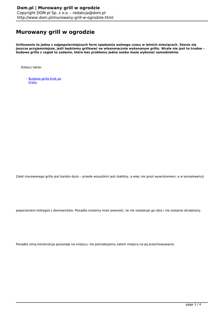 Dom.pl | Murowany grill w ogrodzie Copyright DOM.pl Sp. z o.o. - [email protected] http://www.dom.pl/murowany-grill-w-ogrodzie.html Murowany grill w ogrodzie Grillowanie to jedna z najpopularniejszych form spędzania wolnego czasu w letnich miesiącach. Stanie się jeszcze przyjemniejsze, jeśli będziemy grillować na własnoręcznie wykonanym grillu. Wcale nie jest to trudne – budowa grilla z cegieł to zadanie, które bez problemu jedna osoba może wykonać samodzielnie. Zobacz także: - Budowa grilla krok po kroku Zalet murowanego grilla jest bardzo dużo – przede wszystkim jest stabilny, a więc nie grozi wywróceniem, a w konsekwencji poparzeniem któregoś z domowników. Ponadto możemy mieć pewność, że nie zaatakuje go rdza i nie zostanie skradziony. Ponadto zimą konstrukcja pozostaje na miejscu, nie potrzebujemy zatem miejsca na jej przechowywanie. page 1 / 4 Dom.pl | Murowany grill w ogrodzie Copyright DOM.pl Sp. z o.o. - [email protected] http://www.dom.pl/murowany-grill-w-ogrodzie.html (Murowany grill, fot. Wienerberger) Zanim rozpoczniemy budowę, zaplanujmy miejsce, w którym nasz grill powstanie. Głównym kryterium powinna być nasza wygoda. Najlepiej umieścić go niedaleko miejsca, w którym zazwyczaj siedzimy - wówczas będziemy mogli prowadzić swobodną rozmowę podczas przygotowywania potraw, poza tym jedzenie nie będzie stygło. Uwaga – unikajmy jego sąsiedztwa ze ścianą lub okapem budynku, gdyż wówczas mogą powstać na nich zabrudzenia trudne do usunięcia. page 2 / 4 Dom.pl | Murowany grill w ogrodzie Copyright DOM.pl Sp. z o.o. - [email protected] http://www.dom.pl/murowany-grill-w-ogrodzie.html (Grill z murowanymi elementami, fot. Röben) Do stworzenia grilla najlepiej użyć cegły elewacyjnej lub cegły klinkierowej. Starajmy się dobrać jej kolor do barwy elewacji domu. Dużo lepiej sprawdzą się kolory ciemne – ewentualne zabrudzenia będą na nich mniej widoczne. Starajmy się unikać płytek o wyraźnie widocznej fakturze – nie jest łatwo utrzymać je w czystości. Ponadto potrzebować będziemy zaprawy murarskiej do klinkieru, oraz rusztu ze stali. Grillowanie to jedna z najpopularniejszych form spędzania wolnego czasu w letnich miesiącach. Stanie się jeszcze przyjemniejsze, jeśli będziemy grillować na własnoręcznie wykonanym grillu. Wcale nie jest to trudne – budowa grilla z cegieł to zadanie, które bez problemu jedna osoba może wykonać samodzielnie. Oto kolejne etapy budowy grilla murowanego: - Przygotowanie – przede wszystkim należy zaprojektować kształt i wielkość grilla tak, by korzystanie z niego przy danej wielkości działki było wygodne. Pamiętajmy też, że budowa grilla trwa kilka dni, więc upewnijmy się, że dysponujemy page 3 / 4 Dom.pl | Murowany grill w ogrodzie Copyright DOM.pl Sp. z o.o. - [email protected] http://www.dom.pl/murowany-grill-w-ogrodzie.html czasem na jej dokończenie. - Budowa fundamentów – zaznaczamy za pomocą palików i sznurka miejsce, w którym będzie stał grill. Następnie wykopujemy na tym obszarze dołek o głębokości około 30 centymetrów, do którego wysypujemy żwirek, a następnie całość zalewamy betonem. Tak przygotowaną płytę fundamentową pozostawiamy do wyschnięcia na parę dni. - Ustawienie grilla „na sucho” – po wyschnięciu fundamentów stawiamy próbną konstrukcję i sprawdzamy, czy jest stabilna, oraz czy wszystkie kąty są proste. - Ułożenie cegieł – budujemy ściany, łącząc je zaprawą do klinkieru. W uzyskaniu idealnie prostych fug pomogą nam elementy dystansowe. Warto użyć poziomnicy – wtedy będziemy mieć pewność, że wszystkie kąty są proste. - Montaż płyty paleniska – ustawiamy tymczasowa podporę, na której cegły będą ułożone prostopadle do ścian. Podpory zostawiamy aż do momentu związania zaprawy. W ułożonych z przodu cegłach wiercimy otwory. Pamiętajmy, że cegły przy górnej ścianie grilla muszą być ułożone dłuższym brzegiem do środka. - Rozmieszczenie ceowników – są to bardzo ważne elementy, gdyż posłużą nam jako prowadnice rusztu. Najlepiej, by były wetknięte pomiędzy dwie kolejne warstwy cegieł. Warto dokładnie zmierzyć odległość między ceownikami, aby uniknąć późniejszej przykrej niespodzianki – źle wymierzona odległość może nam uniemożliwić montaż rusztu. - Ułożenie bruku klinkierowego – bruk układamy na przygotowanej wcześniej, dobrze wypoziomowanej podsypce cementowo-piaskowej. - Układamy blachę i ruszt – podstawową kwestią jest ich dobre wymierzenie. Blacha musi być wycięta na wymiar, a ruszt idealnie mieścić się w prowadnicach. - Osadzamy płytę z piaskowca – używając do tego celu kleju do kamienia. Pamiętajmy też o jej dokładnym wypoziomowaniu i zaimpregnowaniu. page 4 / 4
