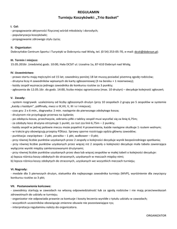REGULAMIN Turnieju Koszykówki: „Trio Basket” I. Cel: - propagowanie aktywności fizycznej wśród młodzieży i dorosłych; - popularyzacja koszykówki; - propagowanie zdrowego stylu życia; II. Organizator: Dobrzyńskie Centrum Sportu i Turystyki w Dobrzyniu nad Wisłą, tel. (0 54) 253-05-70, e-mail: [email protected]; III. Termin i miejsce: 15.05.2016r. (niedziela) godz. 10:00, Hala DCSiT ul. Licealna 1a, 87-610 Dobrzyń nad Wisłą; IV. Uczestnictwo: - prawo startu mają mężczyźni od 15 lat; zawodnicy poniżej 18 lat muszą posiadać pisemną zgodę rodziców; - drużyna liczy 4 zawodników wpisanych do karty zgłoszeniowej (3 na boisku + 1 rezerwowy); - każdy zespół wyznacza jednego zawodnika do konkursu rzutów za 3 punkty; - zgłoszenia do 12.05.16r. do godz. 14:00, liczba miejsc ograniczona (max. 10 drużyn) – decyduje kolejność zgłoszeń; V. Zasady: - system rozgrywek uzależniony od liczby zgłoszonych drużyn (przy 10 zespołach 2 grupy po 5 zespołów w systemie „każdy z każdym”, półfinały, mecz o IX,VII, V, III i o I miejsce); - czas gry: 2 x 6 min., dogrywka: 2 min. następnie do pierwszego zdobytego kosza; - drużynom nie przysługuje przerwa na żądanie; - po zdobyciu kosza, przechwycie, zebraniu piłki z tablicy zespół musi wycofać się za linię 6,75m; - za zdobyty kosz drużyna otrzymuje 1 punkt, za rzut zza linii 6,75m – 2 punkty; - każdy zespół w jednej połowie meczu może popełnić 4 przewinienia, każde następne skutkuje 1 rzutem wolnym; - w trakcie gry obowiązują przepisy PZKosz. Sprawy sporne rozstrzyga sędzia główny zawodów; - punktacja: zwycięstwo - 2 pkt, porażka – 1 pkt, walkower – 0 pkt; - przy równej liczbie punktów uzyskanych przez 2 zespoły o kolejności decyduje wynik bezpośredniego spotkania; - przy równej liczbie punktów uzyskanych przez więcej niż 2 zespoły o kolejności decyduje mała tabela zawierająca wyłącznie wyniki między zainteresowanymi drużynami; - przy równej liczbie punktów uzyskanych przez dwa lub więcej zespołów w małej tabeli o kolejności decyduje: a) lepsza różnica koszy zdobytych do straconych, uzyskanych w meczach między nimi; b) lepsza różnica koszy zdobytych do straconych, uzyskanych we wszystkich meczach turnieju; VI. Nagrody: - medale dla 3 pierwszych drużyn, statuetka dla najlepszego zawodnika turnieju (MVP), wyróżnienie dla zwycięzcy konkursu rzutów za 3 pkt; VII. Postanowienia końcowe: - zawodnicy startują w zawodach na własną odpowiedzialność lub za zgodą rodziców i nie mają przeciwwskazań zdrowotnych do udziału w turnieju; - organizator nie odpowiada prawnie za kontuzje i koszty leczenia wynikłe z tytułu udziału w zawodach; - wszystkich uczestników obowiązuje zmienne obuwie nie pozostawiające rys; - interpretacja regulaminu należy do organizatora. ORGANIZATOR