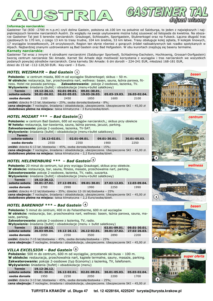 Informacje narciarskie: Gasteiner Tal (830 –2700 m n.p.m) czyli dolina Gastein, położona ok.100 km na południe od Salzburga, to jeden z największych i najpiękniejszych terenów narciarskich Austrii. Ze względu na swoje usytuowanie można tutaj szusować od listopada do kwietnia. Na obszarze Gasteiner Tal jest 5 terenów narciarskich: Graukogel, Schlossalm, Sportgastein, Stubnerkogel oraz na Fulseck. Łączna długość tras zjazdowych to 170 km, z czego 13 km to trasy trudne, 104 km średnie, 53 km łatwe. Trasy obsługuje kolej zębata, 9 kolejek linowych, 17 wyciągów krzesełkowych, 24 orczykowych. Region ten słynie również z gorących źródeł radioaktywnych tak rzadko spotykanych w Alpach. Najbardziej znanymi uzdrowiskami są Bad Gastein oraz Bad Hofgastein. W obu kurortach znajdują się baseny termalne. Karnety narciarskie: Gasteiner Tal wraz z innymi 4 ośrodkami narciarskimi (Salzburger Sportwelt, Schladming-Dachstein, Hochkoenig, Grossarl-Dorfgastein) tworzą centrum narciarskie Ski Amade. Karnet Ski Amade daje możliwość korzystania z wyciągów i tras narciarskich we wszystkich podanych powyżej ośrodków narciarskich. Cena karnetu Ski Amade: 6 dni dorośli – 224-241 EUR, młodzież 168-181 EUR, dzieci do 15 lat –112-120,50 EUR. Key-card – 3 Euro. HOTEL WEISMAYR – Bad Gastein 1 basen Położenie: w centrum miasta, 800 m od wyciągów Stubnerkogel; skibus – 50 m. W obiekcie: restauracja, bar, przechowalnia nart, wellness: basen, sauna, łaźnia parowa, fitness. Hotel nie posiada parkingu. Zakwaterowanie: pokoje 2-osobowe, łazienka, TV. Wyżywienie: śniadania (bufet) i obiadokolacje (menu+bufet sałatkowy) Termin sobota-sobota 19.12-26.12. 30.01-06.02. 02.01-09.01. 06.02-05.03. 09.01-30.01. 19.03-26.03. 05.03-19.03. 26.03-02.04. osoba dorosła 2100 2450 1850 1600 2100 zniżki: dziecko 9-13 lat /dostawka – 25%, osoba dorosła/dostawka - 8%; cena obejmuje: 7 noclegów, śniadania i obiadokolacje, ubezpieczenie. Ubezpieczenie SKI – 45,00 zł dodatkowo płatne na miejscu: taksa klimatyczna - 3 Euro/osoba/dzień. HOTEL MOZART *** – Bad Gastein 1 centrum 2 Położenie: w centrum Bad Gastein, 600 od wyciągów narciarskich,; skibus przy obiekcie W hotelu: restauracja, bar-kawiarnia, sauna, łaźnia parowa, jacuzzi, parking. Zakwaterowanie: pokoje 2-osobowe, łazienka, TV-SAT. Wyżywienie: śniadania (bufet) i obiadokolacje (menu+bufet sałatkowy) Termin sobota-sobota 26.12-02.01. 02.01-09.01. 09.01-30.01. 30.01-05.03. osoba dorosła 2550 2350 1900 2250 zniżki: dziecko 6-13 lat /dostawka – 45%, osoba dorosła/dostawka - 15%; cena obejmuje: 7 noclegów, śniadania i obiadokolacje, ubezpieczenie. Ubezpieczenie SKI – 45,00 zł. dodatkowo płatne na miejscu: taksa klimatyczna – 2,2 Euro/osoba/dzień. 2 HOTEL HELENENBURG *** – Bad Gastein 3 wellness Położenie: 20 minut do centrum, tuż przy wyciągu Graukogel, skibus przy obiekcie. W obiekcie: restauracja, bar, sauna, fitness, masaże, przechowalnia nart, parking. Zakwaterowanie: pokoje 2-osobowe, łazienka, TV, radio, suszarka. Wyżywienie: śniadania (bufet) i obiadokolacje (menu+bufet sałatkowy) Termin sobota-sobota 19.12-26.12. 30.01-27.02. 27.12-09.01. 09.01-30.01 27.02-12.03. 12.03-09.04. osoba dorosła 2700 2990 1990 2250 1990 zniżki: dziecko 4-12 lat/dostawka – 35%; dziecko 12-16 lat/dostawka – 25% cena obejmuje: 7 noclegów, śniadania i obiadokolacje, ubezpieczenie. Ubezpieczenie SKI – 45,00 zł dodatkowo płatne na miejscu: taksa klimatyczna – 2,2 Euro/osoba/dzień. HOTEL BARENHOF *** – Bad Gastein 3 4 basen Położenie: 5 minut do centrum, 400 m do Felsentherme, 600 m od wyciagów W obiekcie: restauracja, bar, przechowalnia nart, wellness: basen, łaźnia parowa, sauna, masaże, parking. Zakwaterowanie: pokoje 2-osobowe z łazienką, TV, radio. Wyżywienie: śniadania (bufet) i obiadokolacje (menu + bufet sałatkowy) Termin sobota-sobota 21.11-19.12. 26.03-09.04. 19.12-26.12. 26.12-02.01. 02.01-09.01. 30.01-27.02. 09.01-30.01. 27.02-26.03. osoba dorosła 2050 2350 3500 2890 2200 zniżki: dziecko 7-15 lat/dostawka – 45%, osoba dorosła/dostawka – 25% cena obejmuje: 7 noclegów, śniadania i obiadokolacje, ubezpieczenie. Ubezpieczenie SKI – 45,00 zł VILLA EXCELSIOR – Bad Gastein 4 5 Położenie: 500 m do centrum, 600 m od wyciągów, przystanek ski busa – 100 m. W obiekcie: restauracja, przechowalnia nart, kąpiele termalne, sauny, masaże, parking. Zakwaterowanie: pokoje 2-osobowe (typ Economy) z łazienką, TV, telefonem. Wyżywienie: śniadania (bufet) i obiadokolacje (menu) Termin sobota-sobota 19.12-26.12. 09.01-30.01. 26.12-02.01. 02.01-09.01. 30.01-05.03. 05.03-02.04. osoba dorosła 1950 2250 2050 2200 1700 zniżki: dziecko 3-13 lat /dostawka – 45%, osoba dorosła/dostawka – 25%; cena obejmuje: 7 noclegów, śniadania i obiadokolacje, ubezpieczenie. Ubezpieczenie SKI – 45,00 zł TURYSTA KRAKÓW ul. Długa 47 super oferta 5 tel. 12 4228164, 4225247 [email protected] super oferta PENSJONAT ST.LEONHARD – Bad Gastein 1 Położenie: 10 minut do centrum, 3 minuty do wyciągów, 100 m do basenów Felsentherme. W obiekcie: sala śniadaniowa, kącik internetowy, sauna, masaże, przechowalnia nart, parking. Zakwaterowanie: pokoje 2-osobowe z łazienką, TV, balkon. Wyżywienie: śniadania (bufet) Termin sobota-sobota 1 03.12-19.12. 02.01-30.01. 12.03-26.03. 26.12-02.01. osoba dorosła 1500 1850 1650 zniżki: dziecko 6-13 lat/dostawka – 45%, osoba dorosła/dostawka – 20% cena obejmuje: 7 noclegów, śniadania, ubezpieczenie. Ubezpieczenie SKI – 45,00 zł APARTAMENTY VILLA EDITH – Bad Gastein 19.12-26.12. 30.01-12.03. 1750 2 Położenie: 5 minut do centrum Bad Gastein, 10 minut od kolejki Stubnerkogel i basenów Felsentherme, skibus przy obiekcie. W obiekcie: przechowlania nart, parking. Zakwaterowanie: apartament 2/4-osobowy: sypialnia, pokój dzienny, aneks kuchenny, łazienka. apartament 5/6-osobowy: 2 sypialnie, pokój dzienny, aneks kuchenny, łazi