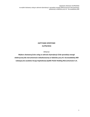 Zapytanie ofertowe 31/PN/2016 na wybór dostawcy usług w zakresie dystrybucji i sprzedaży energii elektrycznej do nieruchomości położonej w Gdańsku przy Al. Grunwaldzkiej 409 ZAPYTANIE OFERTOWE 31/PN/2016 dotyczy: Wyboru dostawcy/ców usług w zakresie dystrybucji i/lub sprzedaży energii elektrycznej dla nieruchomości zlokalizowanej w Gdańsku przy Al. Grunwaldzkiej 409 należącej do zasobów Grupy Kapitałowej Spółki Polski Holding Nieruchomości S.A. 1 Zapytanie ofertowe 31/PN/2016 na wybór dostawcy usług w zakresie dystrybucji i sprzedaży energii elektrycznej do nieruchomości położonej w Gdańsku przy Al. Grunwaldzkiej 409 Informacje o Zamawiającym Zamawiającym jest: Spółka Polski Holding Nieruchomości S.A. Warszawa 00-124, Al. Jana Pawła II 12 I. Tryb udzielenia zamówienia: Postępowanie prowadzone jest zgodnie z przepisami wewnętrznymi Spółki PHN S.A. – nie ma zastosowania Ustawa z dnia 29 stycznia 2004 r. Prawo Zamówień Publicznych (j.t. Dz.U. z 2007 r. Nr 223, poz. 1655). II. Opis przedmiotu zamówienia: 1. Przedmiotem zamówienia jest wybór dostawcy/ców usług w zakresie dystrybucji i/lub sprzedaży energii elektrycznej dla nieruchomości zlokalizowanej w Gdańsku przy Al. Grunwaldzkiej 409, należącej do zasobów Grupy Kapitałowej Spółki Polski Holdingu Nieruchomości S.A. 2. Planowane zużycie energii elektrycznej w okresie 12 m-cy to ok. 2 500,00 MWh. 3. Zamawiający przewiduje zawarcie umowy na okres 12 m-cy, od 01-01-2017 r. do 3112-2017 r. 4. Zamawiający dopuszcza możliwość złożenia ofert w następujących wariantach: a) w zakresie dystrybucji energii elektrycznej lub b) w zakresie sprzedaży energii elektrycznej lub c) w zakresie dystrybucji i sprzedaży energii elektrycznej. 5. III. Opis zasad wyboru Wykonawcy. 1. W przetargu mogą brać udział Wykonawcy, którzy spełnią warunki udziału w postępowaniu określone przez Zamawiającego. 2. Złożone oferty przez Wykonawców, którzy nie spełnią warunków określonych przez Zamawiającego zostaną odrzucone. 3. Ocena spełniania warunków udziału w postępowaniu zostanie dokonana na podstawie załączonych do oferty dokumentów, z zastosowaniem formuły spełnia/niespełna. 4. Ocena ofert będzie dokonywana wg kryteriów określonych w treści niniejszego Zapytania ofertowego. 5. W przypadku ofert zawierających braki, Zespół wystąpi do Wykonawców o ich uzupełnienie lub złożenie wyjaśnień w wyznaczonym terminie. 6. Na podstawie dokonanej oceny ważnych, spełniających warunki udziału w postępowaniu ofert, planuje się wybrać podmioty, których oferty uzyskają najwyższe oceny punktowe. 7. Zespół przetargowy przeprowadzi z wybranymi Wykonawcami negocjacje, których przedmiotem będzie cena za realizację usług oraz warunki i sposób ich realizacji. 8. Zespół przetargowy będzie rekomendował Zarządowi Spółki zawarcie umowy z Wykonawcą, którego oferta otrzymała najwyższą ocenę punktową. 2 Zapytanie ofertowe 31/PN/2016 na wybór dostawcy usług w zakresie dystrybucji i sprzedaży energii elektrycznej do nieruchomości położonej w Gdańsku przy Al. Grunwaldzkiej 409 IV. Wymagania stawiane Wykonawcy usługi: 1. Wykonawca odpowiedzialny będzie za realizację usług objętych przedmiotem zamówienia zgodnie z obowiązującymi w tym zakresie regulacjami prawnymi. 2. Wymagana jest należyta staranność przy realizacji przedmiotu zamówienia. 3. O udzielenie zamówienia mogą ubiegać się Wykonawcy, którzy: a) posiadają uprawnienia do wykonywania działalności lub czynności określonej przedmiotem zamówienia, b) posiadają niezbędną wiedzę i doświadczenie oraz potencjał techniczny i osobowy do wykonania zamówienia, c) znajdują się w sytuacji ekonomicznej i finansowej zapewniającej wykonanie zamówienia. V. Modyfikacja warunków zamówienia: 1. W uzasadnionych przypadkach Zamawiający może, przed upływem terminu składania ofert, zmodyfikować treść Zapytania ofertowego i jego Załączników. 2. Wprowadzone w ten sposób modyfikacje, zmiany lub uzupełnienia przekazane zostaną wszystkim Wykonawcom, którym przekazano zapytanie ofertowe, przy czym będą one wiążące przy składaniu ofert. 3. O przedłużeniu terminu, jeżeli będzie to niezbędne dla wprowadzenia w ofertach zmian wynikających z modyfikacji, zawiadomieni zostaną wszyscy Wykonawcy, których zaproszono do udziału w postępowaniu. VI. Termin wykonania zamówienia: Zamawiający przewiduje zawarcie umowy na okres 12 m-cy. VII. Gwarancja niezmienności cen: Zamawiający wymaga gwarancji niezmienności cen przez cały okres trwania umowy. VIII. Opis warunków udziału w postępowaniu: 1. Posiadanie niezbędnych uprawnień do wykonywania działalności objętej przedmiotem zamówienia. Wykonawca zobowiązany jest posiadać: w przypadku wariantu a) aktualną koncesję na prowadzenie działalności gospodarczej w zakresie wytwarzania energii elektrycznej wydanej przez prezesa Urzędu Regulacji Energetyki, zgodnie z ustawą z dnia 10.04.1997 r. Prawo energetyczne, w przypadku wariantu b) aktualną koncesję na prowadzenie działalności gospodarczej w zakresie dystrybucji energii elektrycznej wydanej przez prezesa Urzędu Regulacji Energetyki, zgodnie z ustawą z dnia 10.04.1997 r. Prawo energetyczne, w przypadku wariantu c) aktualną koncesję na prowadzenie działalności gospodarczej w zakresie dystrybucji energii elektrycznej oraz aktualną koncesją na wytwarzanie energii elektrycznej wydanych przez prezesa Urzędu Regulacji Energetyki, zgodnie z ustawą z dnia 10.04.1997 r. Prawo energetyczne. 3 Zapytanie ofertowe 31/PN/2016 na wybór dostawcy usług w zakresie dystrybucji i sprzedaży energii elektrycznej do nieruchomości położonej w Gdańsku przy Al. Grunwaldzkiej 409 Do oferty należy dołączyć w zależności od wariantu jaki obejmuje oferta: 1) Kopię aktualnej koncesji na prowadzenie działalności gospodarczej w zakresie obrotu energią elektryczną lub/i ak