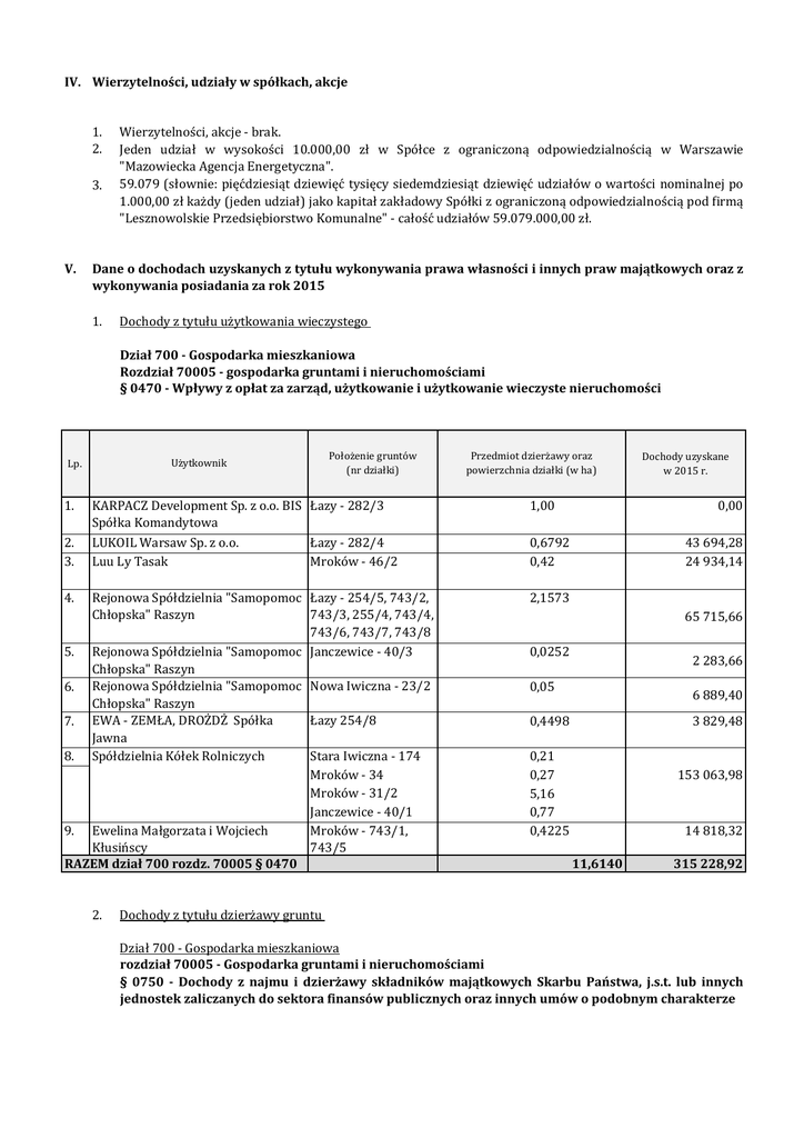 IV. Wierzytelności, udziały w spółkach, akcje 1. 2. 3. V. Dane o dochodach uzyskanych z tytułu wykonywania prawa własności i innych praw majątkowych oraz z wykonywania posiadania za rok 2015 1. 2. 3. Dochody z tytułu użytkowania wieczystego Dział 700 - Gospodarka mieszkaniowa Rozdział 70005 - gospodarka gruntami i nieruchomościami § 0470 - Wpływy z opłat za zarząd, użytkowanie i użytkowanie wieczyste nieruchomości Położenie gruntów (nr działki) Użytkownik Lp. 1. Wierzytelności, akcje - brak. Jeden udział w wysokości 10.000,00 zł w Spółce z ograniczoną odpowiedzialnością w Warszawie "Mazowiecka Agencja Energetyczna". 59.079 (słownie: pięćdziesiąt dziewięć tysięcy siedemdziesiąt dziewięć udziałów o wartości nominalnej po 1.000,00 zł każdy (jeden udział) jako kapitał zakładowy Spółki z ograniczoną odpowiedzialnością pod firmą "Lesznowolskie Przedsiębiorstwo Komunalne" - całość udziałów 59.079.000,00 zł. KARPACZ Development Sp. z o.o. BIS Łazy - 282/3 Spółka Komandytowa LUKOIL Warsaw Sp. z o.o. Luu Ly Tasak Łazy - 282/4 Mroków - 46/2 Rejonowa Spółdzielnia "Samopomoc Łazy - 254/5, 743/2, Chłopska" Raszyn 743/3, 255/4, 743/4, 743/6, 743/7, 743/8 5. Rejonowa Spółdzielnia "Samopomoc Janczewice - 40/3 Chłopska" Raszyn 6. Rejonowa Spółdzielnia "Samopomoc Nowa Iwiczna - 23/2 Chłopska" Raszyn Łazy 254/8 7. EWA - ZEMŁA, DROŻDŻ Spółka Jawna Stara Iwiczna - 174 8. Spółdzielnia Kółek Rolniczych Mroków - 34 Mroków - 31/2 Janczewice - 40/1 Mroków - 743/1, 9. Ewelina Małgorzata i Wojciech Kłusińscy 743/5 RAZEM dział 700 rozdz. 70005 § 0470 4. 2. Dochody z tytułu dzierżawy gruntu Przedmiot dzierżawy oraz powierzchnia działki (w ha) 1,00 0,6792 0,42 0,00 43 694,28 24 934,14 2,1573 65 715,66 0,0252 2 283,66 0,05 6 889,40 0,4498 0,21 0,27 5,16 0,77 0,4225 Dochody uzyskane w 2015 r. 3 829,48 153 063,98 11,6140 14 818,32 315 228,92 Dział 700 - Gospodarka mieszkaniowa rozdział 70005 - Gospodarka gruntami i nieruchomościami § 0750 - Dochody z najmu i dzierżawy składników majątkowych Skarbu Państwa, j.s.t. lub innych jednostek zaliczanych do sektora finansów publicznych oraz innych umów o podobnym charakterze Nazwiska i imię Lp. 2 1 Teren dzierżawy 1. Osoby fizyczne - 126 dzierżawców Mysiadlo 2. Farkowska Krystyna i Kazimierz Mysiadło 3. Wasiewicz Jolanta 3 Mysiadlo Lesznowola 4. T-Mobile, ul. Marynarska 12, 02-674 Warszawa (dawniej: Polska Telefonia Cyfrowa Sp. z o.o. "ERA", Al. Jerozolimskie 181) 5. Polska Telefonia Komórkowa "ORANGE" PGR Lesznowola 6. Clear Channel Poland Sp. z o.o. + Mysiadło po KPGO (jedna umowa) Stara Iwiczna - dz. nr 167/1, 7/6 8. ARW FOCUS Krzysztof Wojtiuk Sp.J. 9. Agencja Reklamowa "POLPLAKAT" Mysiadło po KPGO Mysiadło po KPGO 10. BUDOKRUSZ Sp. z o.o. Zakład Pracy Mysiadło po KPGO 11. CITYBOARD MEDAI Sp. z o.o. Mysiadło po KPGO 12. EMMA BIS Piekarski Mariusz Mysiadło po KPGO 14. "Naukolandia", Firma Paula Golbo Mysiadło 7. AUCHAN Polska Sp. z o.o. Rzepka Spółka Jawna Chroniony 13. Raszewski Wojciech Mysiadło po KPGO Mysiadło 15. Mostostal Warszawa S.A. Mysiadło po KPGO 16. Mostostal Warszawa S.A. Mysiadło po KPGO 17. "NR" Sp. z o.o. Mysiadło po KPGO 18. Piotrowski Ryszard Mysiadło po KPGO Przedmiot dzierżawy 4 Grunt z przeznaczeniem na usytuowanie garaży o wymiarach 3m x 6m Grunt na usytuowanie pawilonu usługowego Grunt na usytuowanie pawilonu usługowego Grunt pod stację bazową do pracy w systemie telefonii cyfrowej Dochody uzyskane w 2015 r. 5 37 587,61 3 632,50 3 632,50 167,77 Grunt pod usytuowanie masztu antenowego 56 291,28 grunt na usytuowanie nośnika reklamowego 5 558,40 Grunt na usytuowanie nośnika reklamowego 7 717,24 grunt dz. 1/229 (13 m2) grunt cz. dz. 1/229 - na ustytuowanie nośnika reklamowego (9 m2) Dz. gr części dz. 7/6 pow. 7.812,5 m2 wraz z obiektem biurowo-socjalnym pow. 100 m2 Dz. gr. części dz. 7/6 oraz części dz. nr 1/229 na postawienie urządzeń reklamowych (pow. 100 m2) Dz. gr. części dz. 7/6 wraz częścią szklarni o pow. 300 m2 CE i S, ul. Kwiatowa 28 11 864,33 2 214,00 dz. gruntu części dz. 7/6 o pow. 16.800 m2 - prowadzenie zaplecza technicznomagazynowego Dzierżawa gr. części dz. nr 7/6 o pow. 5.000 m2 na zaplecze techniczno-magazynowe Dzierżawa części dz. nr 7/6 o pow. 7.465 m2 z płytą betonową o pow. 3.642 m2 oraz budynek o pow. 580 m2 107 937,54 CE i S, ul. Kwiatowa 28 Dzierżawa części gr. dz. nr 1/229 na postawienie reklamy 3x3 m2 41 132,04 95 439,58 3 541,60 216,00 5 313,60 78 597,00 3 777,80 19. Psia Szkoła Jadwiga Chodzeń Mysiadło po KPGO 20. "RUCH" Mysiadło po KPGO 21. Truk-Mar Maria Marzanna Pietrzak Mysiadło po KPGO 22. Jacek i Małgorzata Wielogórscy Mysiadło po KPGO 23. Auto Handel Giuseppe Leon Mysiadło po KPGO 24. "Adgaz" Adam Stępień Mysiadło po KPGO 25. Azaliowy Ogród Robert Pełka Mysiadło po KPGO 26. "EWAD" s.c. Ewelina Kuźmińska, Mysiadło po KPGO 27. H.P.U. FALDROM Mysiadło po KPGO 28. "MAESTRO" Andrzej Gozdecki Mysiadło po KPGO 29. PRESTIGE BOARD S.A. Mysiadło po KPGO 30. ATUT Polska Robert Słowik Mysiadło po KPGO 31. SCHODMAR Zakład Stolarski Mysiadło po KPGO 32. VIETSPORT Minth-Tuan Tran Mysiadło po KPGO 33. Maciej Białobłocki MOTOMASTERS Mysiadło po KPGO 34. Bernacka Teresa obręb Radiostacja Łazy Ludwicki Artur Pacholski Sebastian Grzywacz s.c. Dzierżawa gr. części dz. nr 1/229 o pow. 2.000 m2 prowadzenie działalności usługowej Dzierżawa gr. części dz. nr 1/229 z przeznaczeniem na kiosk Dzierżawa gr. części dz. nr 7/6 o pow. 1.500 m2 - sprzedaż samochodów używanych Dzierżawa gr. o pow. 5 m2, dz. nr 1/229 - działalność usługowa Dzierżawa gr. o pow. 2.000 m2, działka nr 7/6 - sprzedaż samochodów używanych Dzierżawa gr. części dz. nr 1/229 - reklama pow. 4 m2 Dzierżawa gr. części działki nr 7/10 o pow. 800 m2 - kiermasz choinek (jednorazowa) Dzierżawa gr. części działki nr 7/6 o pow. 25 m2 - kiosk warzywny Dzierż
