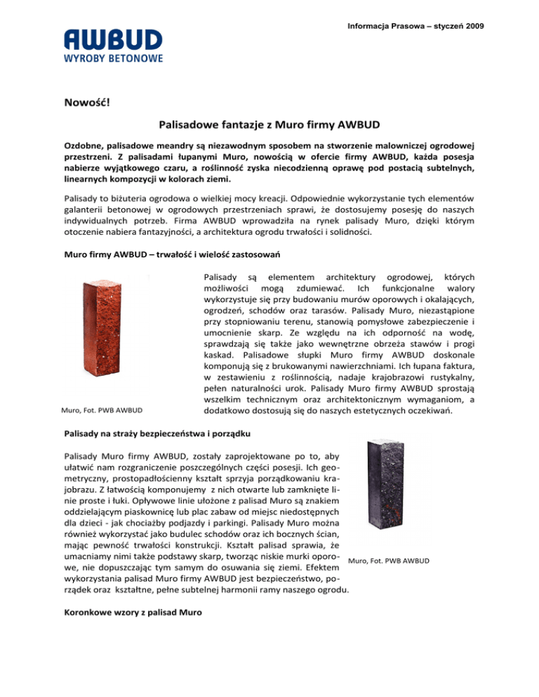 Informacja Prasowa – styczeń 2009 Nowość! Palisadowe fantazje z Muro firmy AWBUD Ozdobne, palisadowe meandry są niezawodnym sposobem na stworzenie malowniczej ogrodowej przestrzeni. Z palisadami łupanymi Muro, nowością w ofercie firmy AWBUD, każda posesja nabierze wyjątkowego czaru, a roślinność zyska niecodzienną oprawę pod postacią subtelnych, linearnych kompozycji w kolorach ziemi. Palisady to biżuteria ogrodowa o wielkiej mocy kreacji. Odpowiednie wykorzystanie tych elementów galanterii betonowej w ogrodowych przestrzeniach sprawi, że dostosujemy posesję do naszych indywidualnych potrzeb. Firma AWBUD wprowadziła na rynek palisady Muro, dzięki którym otoczenie nabiera fantazyjności, a architektura ogrodu trwałości i solidności. Muro firmy AWBUD – trwałość i wielość zastosowań Muro, Fot. PWB AWBUD Palisady są elementem architektury ogrodowej, których możliwości mogą zdumiewać. Ich funkcjonalne walory wykorzystuje się przy budowaniu murów oporowych i okalających, ogrodzeń, schodów oraz tarasów. Palisady Muro, niezastąpione przy stopniowaniu terenu, stanowią pomysłowe zabezpieczenie i umocnienie skarp. Ze względu na ich odporność na wodę, sprawdzają się także jako wewnętrzne obrzeża stawów i progi kaskad. Palisadowe słupki Muro firmy AWBUD doskonale komponują się z brukowanymi nawierzchniami. Ich łupana faktura, w zestawieniu z roślinnością, nadaje krajobrazowi rustykalny, pełen naturalności urok. Palisady Muro firmy AWBUD sprostają wszelkim technicznym oraz architektonicznym wymaganiom, a dodatkowo dostosują się do naszych estetycznych oczekiwań. Palisady na straży bezpieczeństwa i porządku Palisady Muro firmy AWBUD, zostały zaprojektowane po to, aby ułatwić nam rozgraniczenie poszczególnych części posesji. Ich geometryczny, prostopadłościenny kształt sprzyja porządkowaniu krajobrazu. Z łatwością komponujemy z nich otwarte lub zamknięte linie proste i łuki. Opływowe linie ułożone z palisad Muro są znakiem oddzielającym piaskownicę lub plac zabaw od miejsc niedostępnych dla dzieci - jak chociażby podjazdy i parkingi. Palisady Muro można również wykorzystać jako budulec schodów oraz ich bocznych ścian, mając pewność trwałości konstrukcji. Kształt palisad sprawia, że umacniamy nimi także podstawy skarp, tworząc niskie murki oporo- Muro, Fot. PWB AWBUD we, nie dopuszczając tym samym do osuwania się ziemi. Efektem wykorzystania palisad Muro firmy AWBUD jest bezpieczeństwo, porządek oraz kształtne, pełne subtelnej harmonii ramy naszego ogrodu. Koronkowe wzory z palisad Muro Informacja Prasowa – styczeń 2009 Nowe palisadowe propozycje firmy AWBUD nie tylko sprawdzają się przy wyznaczaniu poziomów te renu. Są również idealnym narzędziem do stworzenia z naszego ogrodu małego dzieła sztuki. Jako ob ramowanie dla drzew, roślinnych tarasów i klombów, spełniają się w roli ogrodowej biżuterii, ponie waż niezaprzeczalnie, zupełnie jak barwne bransolety, wzmagają fantazyjność krajobrazu. Z palisadami Muro zwolennicy secesyjnych akcentów przestrzennych mogą zaprojektować swój własny tajemniczy ogród. Wzory powstałe przy pomocy Muro przywodzą na myśl charakterystyczną dla secesji asymetryczną, falującą linię, która okala kwiatowe rabaty czy też obiekty małej architektury ogrodowej takie jak ławki, murki i altanki. Palisady Muro mogą zastępować także obrzeża chodnikowe, występując jako wykończenie ścieżek, które będą pląsać pośród zieleni niczym skalne meandry. Uzyskany efekt wizualny zwieńczy naturalna kolorystyka Muro, która przywodzi na myśl oryginalne odcienie różnorodnych barw wydobytych z głębi ziemi. Palisady łupane MURO: rozmiar: wysokość - 42 cm, szerokość 13 cm, głębokość - 13 cm, Kolor szary, cena: 16,60 zł netto/szt, wersja postarzona cena: 18,80 zł netto/szt Kolory karmelowy; brązowy; antracytowy cena: 18,80 zł netto/szt, wersja postarzona cena: 20,80 zł netto/szt Muro, Fot. PWB AWBUD Kolory antracytowo – biały; karmelowo – antracytowy; piaskowo – karmelowy; biało – piaskowo – antracytowy; piaskowy cena: 21,80 netto/szt, wersja postarzona cena: 23,80 netto/szt Produkcja Wyrobów Betonowych AWBUD 42-443 Fugasówka/Zawiercie, ul.Reja 4 www.awbud.pl Firma Awbud powstała w 1989 r. z inicjatywy jej obecnego prezesa i głównego akcjonariusza Andrzeja Wuczyńskiego. W pierwszych latach działalności firma koncentrowała się na usługach budowlanych, od 1994 r. rozpoczęła produkcję betonu towarowego a od 1996 r. zaczęła produkcję prefabrykatów wibroprasowanych. Po okresie dynamicznego wzrostu organicznego zarząd spółki podjął decyzję o rozwoju firmy z wykorzystaniem strategii konsolidacji regionalnego rynku. W 2007 r. spółka pozyskała inwestora finansowego - fundusz BBI Capital NFI S.A. Na bazie pozyskanych od inwestora środków oraz dodatkowego finansowania dłużnego rozpoczęła się realizacja strategii. W 2007 r. AWBUD dokonał dwóch akwizycji. W maju 2007 r. przejął aktywa, rynek i klientów spółki Utex-Sigma, dzięki czemu znacznie powiększył swoje zdolności wytwórcze w tym asortymencie (2 dodatkowe zakłady: w Mikołowie-Bujakowie oraz Roszkowie). W lipcu 2007 r. AWBUD przejął firmę Betra (zakład w Raciborzu), specjalizującą się w produkcji prefabrykatów betonowych i żelbetowych. Długoletnie doświadczenie w produkcji betonu w połączeniu z własnym nowoczesnym zapleczem badawczym stanowią o przewadze konkurencyjnej firmy w branży. AWBUD oferuje klientom produkty najwyższej jakości. Dzięki stałej dbałości o podnoszenie jakości wyrobów AWBUD skutecznie konkuruje dziś na rynku budowlanym.