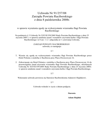 Uchwała Nr 91/257/08 Zarządu Powiatu Raciborskiego z dnia 8 października 2008r. w sprawie wyrażenia zgody na wykorzystanie wizerunku flagi Powiatu Raciborskiego Na podstawie § 3 Uchwały Nr XXVII/359/2005 Rady Powiatu Raciborskiego z dnia 25 stycznia 2005 r. w sprawie ustalenia zasad i warunków używania herbu i flagi Powiatu Raciborskiego i § 8 ust. 1 i 2 załącznika nr 1 cytowanej Uchwały, ZARZĄD POWIATU RACIBORSKIEGO uchwala, co następuje: §1 1. Wyraża się zgodę na wykorzystanie wizerunku flagi Powiatu Raciborskiego przez Hotel Polonia z siedzibą w Raciborzu przy Placu Dworcowym 16. 2. Zobowiązuje się Hotel Polonia z siedzibą w Raciborzu przy Placu Dworcowym 16 do przestrzegania zasad używania wizerunku flagi Powiatu Raciborskiego, określonych Uchwałą Nr XXVII/359/2005 Rady Powiatu Raciborskiego z dnia 25 stycznia 2005r. w sprawie ustalenia zasad i warunków używania herbu i flagi Powiatu Raciborskiego. §2 Wykonanie uchwały powierza się Staroście Raciborskiemu Adamowi Hajdukowi. §3 Uchwała wchodzi w życie z dniem podjęcia. Starosta Adam Hajduk Uzasadnienie: Dyrektor Hotelu Polonia z siedzibą w Raciborzu przy Placu Dworcowym 16 w piśmie z dnia 29 września 2008 r. zwrócił się z prośbą o wyrażenie zgody na wykorzystanie wizerunku flagi Powiatu Raciborskiego w Hotelu Polonia w dniach świąt państwowych zgodnie z zasadami precedencji. Wizerunek herbu i flagi Powiatu Raciborskiego określa Uchwała Nr VII/102/2003 Rady Powiatu Raciborskiego z dnia 29 kwietnia 2003 r. w sprawie przyjęcia herbu i flagi Powiatu Raciborskiego. Zgodnie z zapisem § 5 ust.3 Statutu Powiatu Raciborskiego, używanie herbu i flagi powiatu odbywa się na zasadach i warunkach ustalonych w odrębnej uchwale. Konsekwencją statutowych regulacji jest Uchwała Nr XXVII/359/2005 Rady Powiatu Raciborskiego z dnia 25 stycznia 2005 r. w sprawie ustalenia zasad i warunków używania herbu i flagi Powiatu Raciborskiego. Miejsce, gdzie można zakupić flagę Powiatu Raciborskiego, zgodną z wzorem podanym w powyższych aktach prawnych zostanie wskazane dyrektorowi Hotelu Polonia w odrębnym piśmie. Użycie wizerunku flagi Powiatu Raciborskiego z należytą czcią i szacunkiem oraz powagą przewidzianą dla insygniów władzy w miejscu publicznym np. Hotelu Polonia, przyczyni się do właściwej promocji powiatu raciborskiego wśród odwiedzających go turystów. Wobec powyższego w tym stanie prawnym, podjęcie uchwały jest celowe i uzasadnione. Kierownik Referatu Promocji, Rozwoju i Współpracy Zagranicznej Grażyna Wójcik