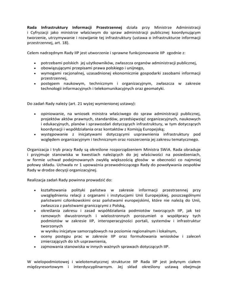 Rada Infrastruktury Informacji Przestrzennej działa przy Ministrze Administracji i Cyfryzacji jako ministrze właściwym do spraw administracji publicznej koordynującym tworzenie, utrzymywanie i rozwijanie tej infrastruktury (ustawa o infrastrukturze informacji przestrzennej, art. 18). Celem nadrzędnym Rady IIP jest utworzenie i sprawne funkcjonowanie IIP zgodnie z: potrzebami polskich jej użytkowników, zwłaszcza organów administracji publicznej, obowiązującymi przepisami prawa polskiego i unijnego, wymogami racjonalnej, uzasadnionej ekonomicznie gospodarki zasobami informacji przestrzennej, postępem naukowym, technicznym i organizacyjnym, zwłaszcza w zakresie technologii informacyjnych i telekomunikacyjnych oraz geomatyki. Do zadań Rady należy (art. 21 wyżej wymienionej ustawy): opiniowanie, na wniosek ministra właściwego do spraw administracji publicznej, projektów aktów prawnych, standardów, przedsięwzięć organizacyjnych, naukowych i edukacyjnych, planów i sprawozdań dotyczących infrastruktury, w tym dotyczących koordynacji i współdziałania oraz kontaktów z Komisją Europejską; występowanie z inicjatywami dotyczącymi usprawnienia infrastruktury pod względem organizacyjnym i technicznym oraz rozszerzenia jej zakresu tematycznego. Organizacja i tryb pracy Rady są określone rozporządzeniem Ministra SWiA. Rada obraduje i przyjmuje stanowiska w kwestiach należących do jej właściwości na posiedzeniach, w formie uchwał podejmowanych zwykłą większością głosów w obecności co najmniej połowy składu. Uchwała nr 1 upoważnia przewodniczącego Rady do powoływania zespołów Rady w drodze decyzji organizacyjnej. Realizacja zadań Rady powinna prowadzić do: kształtowania polityki państwa w zakresie informacji przestrzennej przy uwzględnieniu relacji z organami i instytucjami Unii Europejskiej, poszczególnymi państwami członkowskimi oraz państwami europejskimi, które nie należą do Unii, zwłaszcza z państwami graniczącymi z Polską, określania zakresu i zasad współdziałania podmiotów tworzących IIP, jak też ramowych dwustronnych i wielostronnych porozumień o współpracy tych podmiotów w zakresie IIP, interoperacyjności portali, systemów i infrastruktur tworzonych w wyniku inicjatyw samorządowych na poziomie regionalnym i lokalnym, oceny postępu prac w zakresie IIP oraz formułowania wniosków i zaleceń zmierzających do ich usprawnienia, zajmowania stanowiska w innych ważnych sprawach dotyczących IIP. W wielopodmiotowej i wielotematycznej strukturze IIP Rada IIP jest jedynym ciałem międzyresortowym i interdyscyplinarnym. Jej skład określony ustawą obejmuje przedstawicieli organów administracji rządowej i jednostek samorządu terytorialnego, instytucji naukowych i organizacji pozarządowych. Tym samym Rada spełnia rolę forum konsultacyjnego, na którym w trybie dyskusji dochodzi się do opinii użytecznych przy podejmowaniu skoordynowanych decyzji przez wymienione wyżej organy, jednostki, instytucje i organizacje. Rada IIP powołana została przez Ministra Spraw Wewnętrznych i Administracji w dniu 7 marca 2011 r. i obejmowała pierwotnie 15 osób. W dniu 12 września 2012 r. Minister Administracji i Cyfryzacji zaktualizował i rozszerzył skład Rady IIP, która obecnie obejmuje 21 następujących członków: Marek Baranowski - Dyrektor Instytutu Geodezji i Kartografii Kazimierz Bujakowski - Główny Geodeta Kraju Sławomir Brodziński - Główny Geolog Kraju Jan Maciej Czajkowski - Współprzewodniczący Zespołu do Spraw Społeczeństwa Informacyjnego KWRiST Stanisław Gawłowski - Sekretarz Stanu w Ministerstwie Ochrony Środowiska Jerzy Gaździcki - Prezes Polskiego Towarzystwa Informacji Przestrzennej Andrzej Jagusiewicz - Główny Inspektor Ochrony Środowiska Jacek Jarząbek - Zastępca Głównego Geodety Kraju Michał Kiełsznia - Generalny Dyrektor Ochrony Środowiska Piotr Lech - Starosta Milicki, członek Zarządy Związku Powiatów Polskich Krzysztof Mączewski - Geodeta Województwa Mazowieckiego kom. Henryk Nitner - Szef Biura Hydrograficznego Marynarki Wojennej Sławomir Neumann - Sekretarz Stanu w Ministerstwie Zdrowia Kazimierz Plocke - Sekretarz Stanu w Ministerstwie Rolnictwa i Rozwoju Wsi Dorota Pyć - Podsekretarz Stanu w Ministerstwie Infrastruktury i Rozwoju Edward Trojanowski - Sekretarz Generalny Związku Gmin Wiejskich RP Witold Sumisławski - Prezes Krajowego Zarządu Gospodarki Wodnej Janusz Witkowski - Prezes Głównego Urzędu Statystycznego Zbigniew Zwoliński - profesor Uniwersytetu im. Adama Mickiewicza w Poznaniu Janusz Żbik - Podsekretarz Stanu w Ministerstwie Infrastruktury i Rozwoju Piotr Żuchowski - Sekretarz Stanu w Ministerstwie Kultury i Dziedzictwa Narodowego Przewodniczącym Rady jest prof. Jerzy Gaździcki, wiceprzewodniczącym – Jacek Jarząbek.