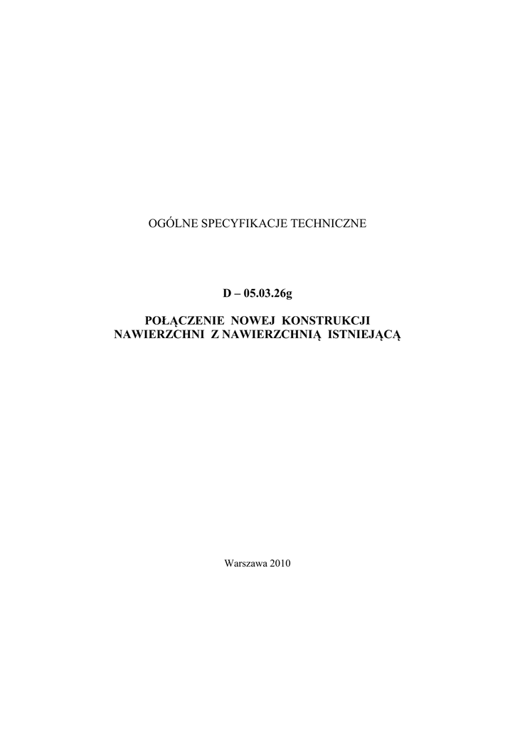 OGÓLNE SPECYFIKACJE TECHNICZNE D – 05.03.26g POŁĄCZENIE NOWEJ KONSTRUKCJI NAWIERZCHNI Z NAWIERZCHNIĄ ISTNIEJĄCĄ Warszawa 2010 SPIS TREŚCI 1. WSTĘP ........................................................................................................................... 3 2. MATERIAŁY ................................................................................................................. 4 3. SPRZĘT .......................................................................................................................... 6 4. TRANSPORT ................................................................................................................. 6 5. WYKONANIE ROBÓT ................................................................................................ 7 6. KONTROLA JAKOŚCI ROBÓT ................................................................................ 9 7. OBMIAR ROBÓT ....................................................................................................... 10 8. ODBIÓR ROBÓT ........................................................................................................ 10 9. PODSTAWA PŁATNOŚCI ........................................................................................ 11 10. PRZEPISY ZWIĄZANE ............................................................................................. 11 11. ZAŁĄCZNIKI .............................................................................................................. 13 NAJWAŻNIEJSZE OZNACZENIA I SKRÓTY OST ST IBDiM - ogólna specyfikacja techniczna - specyfikacja techniczna wykonania i odbioru robót budowlanych - Instytut Badawczy Dróg i Mostów D-05.03.26g Połączenie nowej konstrukcji nawierzchni z nawierzchnią istniejącą 3 1. WSTĘP 1.1. Przedmiot OST Przedmiotem niniejszej ogólnej specyfikacji technicznej (OST) są wymagania dotyczące wykonania i odbioru robót związanych z połączeniem nowej konstrukcji nawierzchni z nawierzchnią istniejącą. 1.2. Zakres stosowania OST Ogólna specyfikacja techniczna (OST) jest materiałem pomocniczym do opracowania specyfikacji technicznej wykonania i odbioru robót budowlanych (ST) stosowanej jako dokument przetargowy i kontraktowy przy zlecaniu i realizacji robót na drogach i ulicach. 1.3. Zakres robót objętych OST Ustalenia zawarte w niniejszej specyfikacji dotyczą zasad prowadzenia robót związanych z wykonaniem i odbiorem połączenia nowej konstrukcji nawierzchni, zawierającej asfaltową warstwę ścieralną i wiążącą z istniejącą nawierzchnią asfaltową na dowolnej podbudowie. Połączenie polega na rozbiórce starej nawierzchni z wykonaniem schodkowania jej krawędzi, skropieniu warstwy wiążącej emulsją asfaltową i ułożeniu geokompozytu, a następnie przykryciu go nową asfaltową warstwą ścieralną. Wykonanie połączenia ma zapobiec (lub co najmniej opóźnić) wystąpieniu na powierzchni jezdni poprzecznego pęknięcia, odbitego od spoiny na krawędzi połączenia. 1.4. Określenia podstawowe 1.4.1. Nawierzchnia – konstrukcja składająca się z kilku warstw, służących do przejmowania i rozkładania na podłoże obciążeń od ruchu pojazdów. 1.4.2. Warstwa nawierzchni – element konstrukcji nawierzchni zbudowany z jednego materiału. 1.4.3. Warstwa ścieralna – górna warstwa nawierzchni będąca w bezpośrednim kontakcie z kołami pojazdów. 1.4.4. Warstwa wiążąca – warstwa nawierzchni między warstwą ścieralną a podbudową. 1.4.5. Podbudowa – główny element konstrukcyjny nawierzchni, ułożony w jednej lub kilku warstwach. 1.4.6. Połączenie nowej i starej nawierzchni – sposób konstrukcji, łączący nową nawierzchnię z nawierzchnią istniejącą, mający na celu zagwarantowanie tej samej nośności (trwałości zmęczeniowej) obu części i zapobiegający wystąpieniu na powierzchni jezdni poprzecznego pęknięcia. 4 Połączenie nowej konstrukcji nawierzchni z nawierzchnią istniejącą D-05.03.26g 1.4.7. Kategoria ruchu – obciążenie drogi ruchem samochodowym, wyrażone w osiach obliczeniowych (100 kN) wg „Katalogu typowych konstrukcji nawierzchni podatnych i półsztywnych”, GDDP – IBDiM, Warszawa 1997. 1.4.8. Emulsja asfaltowa – emulsja, w której fazą zdyspergowaną jest asfalt, a fazą ciągłą jest woda lub roztwór wodny, o ile nie ustalono inaczej. 1.4.9. Geokompozyt – geosyntetyk, składający się z siatki z włókien mineralnych połączonej z geowłókniną z włókien syntetycznych. 1.4.10. Pozostałe określenia podstawowe są zgodne z obowiązującymi, odpowiednimi polskimi normami i z definicjami podanymi w OST D-M-00.00.00 „Wymagania ogólne” [1] pkt 1.4. 1.5. Ogólne wymagania dotyczące robót Ogólne wymagania dotyczące robót podano w OST D-M-00.00.00 „Wymagania ogólne” [1] pkt 1.5. 2. MATERIAŁY 2.1. Ogólne wymagania dotyczące materiałów Ogólne wymagania dotyczące materiałów, ich pozyskiwania i składowania, podano w OST D-M-00.00.00 „Wymagania ogólne” [1] pkt 2. 2.2. Materiały do wykonania robót 2.2.1. Zgodność materiałów z dokumentacją projektową Materiały do wykonania robót powinny być zgodne z ustaleniami dokumentacji projektowej lub ST. 2.2.2. Materiały do wykonania robót Do wykonania robót należy użyć: geokompozyt, wzmacniający nawierzchnię na linii styku starej i nowej nawierzchni, emulsję asfaltową do złączenia geokompozytu z nawierzchnią. Ponadto przy konstruowaniu połączenia nowej i starej nawierzchni występują materiały, z których zbudowana będzie nowa nawierzchnia. – – 2.2.3. Geokompozyt Jeśli dokumentacja projektowa nie ustala inaczej, pod linią styku starej i nowej nawierzchni można zastosować geokompozyt, stanowiący połączenie siatki z włókien mineralnych (np. poliestrowych, szklanych) z geowłókniną wytworzoną z włókien syntetycznych (polipropylenowych, polietylenowych lub poliestrowych) ciągłych wzmacnianych mechan