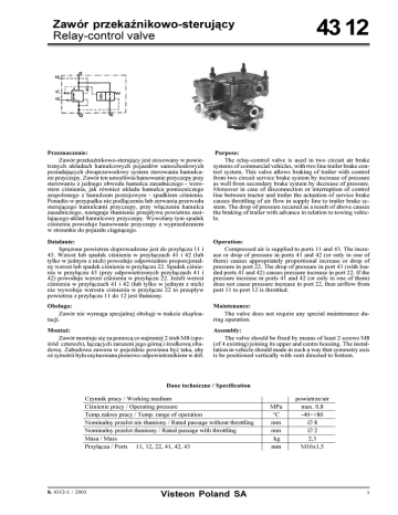43 12 Zawór przekanikowo-steruj¹cy Relay-control valve Przeznaczenie: Zawór przekanikowo-steruj¹cy jest stosowany w powietrznych uk³adach hamulcowych pojazdów samochodowych posiadaj¹cych dwuprzewodowy system sterowania hamulcami przyczepy. Zawór ten umo¿liwia hamowanie przyczepy przy sterowaniu z jednego obwodu hamulca zasadniczego - wzrostem cinienia, jak równie¿ uk³adu hamulca pomocniczego zespolonego z hamulcem postojowym - spadkiem cinienia. Ponadto w przypadku nie pod³¹czenia lub zerwania przewodu steruj¹cego hamulcami przyczepy, przy w³¹czeniu hamulca zasadniczego, nastêpuje t³umienie przep³ywu powietrza zasilaj¹cego uk³ad hamulcowy przyczepy. Wywo³any tym spadek cinienia powoduje hamowanie przyczepy z wyprzedzeniem w stosunku do pojazdu ci¹gn¹cego. Purpose: The relay-control valve is used in two circuit air brake systems of commercial vehicles, with two line trailer brake control system. This valve allows braking of trailer with control from two circuit service brake system by increase of pressure as well from secondary brake system by decrease of pressure. Moreover in case of disconnection or interruption of control line between tractor and trailer the actuation of service brake causes throttling of air flow in supply line to trailer brake system. The drop of pressure occured as a result of above causes the braking of trailer with advance in relation to towing vehicle. Dzia³anie: Sprê¿one powietrze doprowadzone jest do przy³¹cza 11 i 43. Wzrost lub spadek cinienia w przy³¹czach 41 i 42 (lub tylko w jednym z nich) powoduje odpowiednio proporcjonalny wzrost lub spadek cinienia w przy³¹czu 22. Spadek cinienia w przy³¹czu 43 (przy odpowietrzonych przy³¹czach 41 i 42) powoduje wzrost cinienia w przy³¹czu 22. Je¿eli wzrost cinienia w przy³¹czach 41 i 42 (lub tylko w jednym z nich) nie wywo³uje wzrostu cinienia w przy³¹czu 22 to przep³yw powietrza z przy³¹cza 11 do 12 jest t³umiony. Operation: Compressed air is supplied to ports 11 and 43. The increase or drop of pressure in ports 41 and 42 (or only in one of them) causes appropriately proportional increase or drop of pressure in port 22. The drop of pressure in port 43 (with loaded ports 41 and 42) causes pressure increase in port 22. If the pressure increase in ports 41 and 42 (or only in one of them) does not cause pressure increase in port 22, then airflow from port 11 to port 12 is throttled. Obs³uga: Zawór nie wymaga specjalnej obs³ugi w trakcie eksploatacji. Maintenance: The valve does not require any special maintenance during operation. Monta¿: Zawór montuje siê za pomoc¹ co najmniej 2 rub M8 (sporód czterech), ³¹cz¹cych zarazem jego górn¹ i rodkow¹ obudowê. Zabudowa zaworu w pojedzie powinna byæ taka, aby o symetrii by³a usytuowana pionowo odpowietrznikiem w dó³. Assembly: The valve should be fixed by means of least 2 screws M8 (of 4 existing) joining its upper and centre housing. The installation in vehicle should made in such a way that symmetry axis is be positioned vertically with vent directed to bottom. Dane techniczne / Specification Czynnik pracy / Working medium Cinienie pracy / Operating pressure Temp.zakres pracy / Temp. range of operation Nominalny przelot nie t³umiony / Rated passage without throttling Nominalny przelot t³umiony / Rated passage with throttling Masa / Mass Przy³¹cza / Ports 11, 12, 22, 41, 42, 43 K 4312-1 / 2003 Visteon Poland SA MPa °C mm mm kg mm powietrze/air max. 0,8 -40÷+80 Æ8 Æ2 2,3 M16x1,5 1 Odmiany / Variations: Odmiana Variation 43 12 010 0 43 12 011 0 Wyprzedzenie Advance [MPa] 0,02 0,05 T³umik ha³asu Silencer - Charakterystyki pracy / Performance characteristics: Wykresy cinienia wyjciowego p2 w funkcji cinienia steruj¹cego p41, p42 i p43 Diagrams - Outlet pressure p2 vs control pressure p41, p42 and p43 Obwód 1 Circuit 1 Cin.w przy³¹czu 1 Pressure in port 1 Obwód 2 Circuit 2 2 K 4312-1 / 2003 43 12 Zawór przekanikowo-steruj¹cy Relay-control valve Przeznaczenie: Zawór przekanikowo-steruj¹cy jest stosowany w powietrznych uk³adach hamulcowych pojazdów samochodowych posiadaj¹cych dwuprzewodowy system sterowania hamulcami przyczepy. Zawór ten umo¿liwia hamowanie przyczepy przy sterowaniu z jednego obwodu hamulca zasadniczego - wzrostem cinienia, jak równie¿ uk³adu hamulca pomocniczego zespolonego z hamulcem postojowym - spadkiem cinienia. Ponadto w przypadku nie pod³¹czenia lub zerwania przewodu steruj¹cego hamulcami przyczepy, przy w³¹czeniu hamulca zasadniczego, nastêpuje t³umienie przep³ywu powietrza zasilaj¹cego uk³ad hamulcowy przyczepy. Wywo³any tym spadek cinienia powoduje hamowanie przyczepy. Purpose: The relay-control valve is used in two circuit air brake systems of commercial vehicles, with two line trailer brake control system. This valve allows braking of trailer with control from two circuit service brake system by increase of pressure as well from secondary brake system by decrease of pressure. Moreover in case of disconnection or interruption of control line between tractor and trailer the actuation of service brake causes throttling of air flow in supply line to trailer brake system. The drop of pressure occured as a result of above causes the braking of trailer. Dzia³anie: Sprê¿one powietrze doprowadzone jest do przy³¹cza 11 i 43. Wzrost lub spadek cinienia w przy³¹czach 41 i 42 (lub tylko w jednym z nich) powoduje odpowiednio proporcjonalny wzrost lub spadek cinienia w przy³¹czu 22. Spadek cinienia w przy³¹czu 43 (przy odpowietrzonych przy³¹czach 41 i 42) powoduje wzrost cinienia w przy³¹czu 22. Je¿eli wzrost cinienia w przy³¹czach 41 i 42 (lub tylko w jednym z nich) nie wywo³uje wzrostu cinienia w przy³¹czu 22 to przep³yw powietrza z przy³¹cza 11 do 12 jest t³umiony. Operation: Compressed air is supplied to ports 11 and 43. The increase or drop of pressure in ports 41 and 42 (or only in one of them) causes appropriately proportional increase 