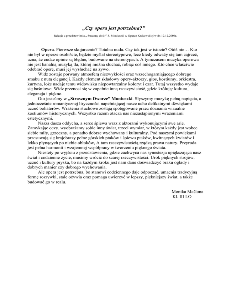 „Czy opera jest potrzebna?” Relacja z przedstawienia „ Straszny dwór” S. Moniuszki w Operze Krakowskiej w dn 12.12.2006r. Opera. Pierwsze skojarzenie? Totalna nuda. Czy tak jest w istocie? Otóż nie… Kto nie był w operze osobiście, będzie myślał stereotypowo, lecz kiedy odważy się tam zajrzeć, uzna, że cudze opinie są błędne, budowane na stereotypach. A tymczasem muzyka operowa nie jest banalną muzyką tła, której można słuchać, robiąc coś innego. Kto chce właściwie odebrać operę, musi jej wysłuchać na żywo. Widz zostaje porwany atmosferą niezwykłości oraz wszechogarniającego dobrego smaku z nutą elegancji. Każdy element składowy opery-aktorzy, głos, kostiumy, orkiestra, kurtyna, loże nadaje temu widowisku niepowtarzalny koloryt i czar. Tutaj wszystko wydaje się baśniowe. Widz przenosi się w zupełnie inną rzeczywistość, gdzie królują: kultura, elegancja i piękno. Oto jesteśmy w „Strasznym Dworze” Moniuszki. Słyszymy muzykę pełną napięcia, a jednocześnie romantycznej liryczności napełniającej nasze ucho delikatnymi dźwiękami uczuć bohaterów. Wrażenia słuchowe zostają spotęgowane przez doznania wizualne kostiumów historycznych. Wszystko razem otacza nas niezastąpionymi wrażeniami estetycznymi. Nasza dusza oddycha, a serce śpiewa wraz z aktorami wykonującymi swe arie. Zamykając oczy, wyobrażamy sobie inny świat, trzeci wymiar, w którym każdy jest wobec siebie miły, grzeczny, a ponadto dobrze wychowany i kulturalny. Pod naszymi powiekami przesuwają się krajobrazy pełne górskich ptaków i śpiewu ptaków, kwitnących kwiatów i lekko płynących po niebie obłoków, A tam rzeczywistością rządzą prawa natury. Przyroda jest pełna harmonii i wzajemnej współpracy w tworzeniu pięknego świata. Niestety po wyjściu z przedstawienia, gdzie zachwyca nas synestezja upiększająca nasz świat i codzienne życie, musimy wrócić do szarej rzeczywistości. Urok pięknych strojów, uczuć i kultury pryska, bo na każdym kroku jest nam dane doświadczyć braku ogłady i dobrych manier czy dobrego wychowania. Ale opera jest potrzebna, bo stanowi codziennego daje odpocząć, umacnia tradycyjną formę rozrywki, stale ożywia oraz pomaga uwierzyć w lepszy, piękniejszy świat, a także budować go w realu. Monika Maślona Kl. III LO