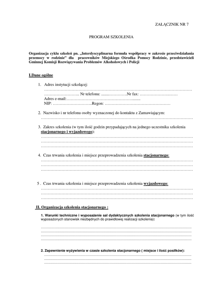 ZAŁĄCZNIK NR 7 PROGRAM SZKOLENIA Organizacja cyklu szkoleń pn. „Interdyscyplinarna formuła współpracy w zakresie przeciwdziałania przemocy w rodzinie” dla pracowników Miejskiego Ośrodka Pomocy Rodzinie, przedstawicieli Gminnej Komisji Rozwiązywania Problemów Alkoholowych i Policji I.Dane ogólne 1. Adres instytucji szkolącej: ……………………………………………………………………………………………… …………………….. Nr telefonu: ........………….Nr fax: ………………….…… Adres e-mail:…………………………………………........ NIP: ………………………..Regon: ………………………………………… 2. Nazwisko i nr telefonu osoby wyznaczonej do kontaktu z Zamawiającym: ………………………………………………………………………………………………… 3. Zakres szkolenia (w tym ilość godzin przypadających na jednego uczestnika szkolenia stacjonarnego i wyjazdowego): ………………………………………………………………………………………………… ………………………………………………………………………………………………… ………………………………………………………………………………………………… 4. Czas trwania szkolenia i miejsce przeprowadzenia szkolenia stacjonarnego: ………………………………………………………………………………………………… ………………………………………………………………………………………………… ………………………………………………………………………………………………… 5 . Czas trwania szkolenia i miejsce przeprowadzenia szkolenia wyjazdowego: ………………………………………………………………………………………………… ………………………………………………………………………………………………… ………………………………………………………………………………………………… II. Organizacja szkolenia stacjonarnego : 1. Warunki techniczne i wyposażenie sal dydaktycznych szkolenia stacjonarnego (w tym ilość wyposażonych stanowisk niezbędnych do prawidłowej realizacji szkolenia): …………………………………………………………………………………………………………………… …………………………………………………………………………………………………………………… …………………………………………………………………………………………………………………… …………………………………………………………………………………………………………………… 2. Zapewnienie wyżywienia w czasie szkolenia stacjonarnego ( miejsce i ilość posiłków): ………………………………………………………………………………………………………………… ………………………………………………………………………………………………………………… ………………………………………………………………………………………………………………… 3. Charakterystyka szkolenia stacjonarnego w Szczecinie DZIEŃ I ( 04.10.2010) Grupa szkoleniowa 1 Czas trwania szkolenia Przerwa posiłek na Tematyka szkolenia Czas trwania szkolenia Przerwa posiłek na Tematyka szkolenia Czas trwania szkolenia Przerwa posiłek na Tematyka szkolenia Czas trwania szkolenia Przerwa posiłek na Tematyka szkolenia Czas trwania szkolenia Przerwa posiłek na Tematyka szkolenia Grupa wykładowa 1 Grupa wykładowa 2 DZIEŃ II ( 05.10.2010) Grupa szkoleniowa 2 Grupa wykładowa 1 Grupa wykładowa 2 DZIEŃ III ( 06.10.2010) Grupa szkoleniowa 3 Grupa wykładowa 1 Grupa wykładowa 2 DZIEŃ IV ( 07.10.2010) Grupa szkoleniowa 4 Grupa wykładowa 1 Grupa wykładowa 2 DZIEŃ V ( 08.10.2010) Grupa szkoleniowa 5 III. Organizacja szkolenia wyjazdowego : 1. Warunki techniczne i wyposażenie sal dydaktycznych szkolenia wyjazdowego (w tym ilość wyposażonych stanowisk niezbędnych do prawidłowej realizacji szkolenia): ……………………………………………………………………………………………………………………… ……………………………………………………………………………………………………………………… ……………………………………………………………………………………………………………………… 2. Zapewnienie wyżywienia w czasie szkolenia wyjazdowego ( miejsce i ilość posiłków): ………………………………………………………………………………………………………………………. ………………………………………………………………………………………………………………………. ………………………………………………………………………………………………………………………. ………………………………………………………………………………………………………………………. ………………………………………………………………………………………………………………………. ………………………………………………………………………………………………………………………. ………………………………………………………………………………………………………………………. 3. Charakterystyka szkolenia wyjazdowego Wyjazd 30-31.10.2010r. Grupa szkoleniowa 1 Grupa wykładowa 1 Grupa wykładowa 2 Czas trwania szkolenia Przerwa posiłek na Tematyka szkolenia Wyjazd 0