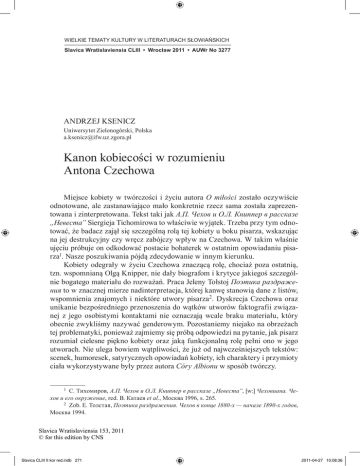 WIELKIE TEMATY KULTURY W LITERATURACH SŁOWIAŃSKICH Slavica Wratislaviensia CLIII • Wrocław 2011 • AUWr No 3277 ANDRZEJ KSENICZ Uniwersytet Zielonogórski, Polska [email protected] Kanon kobiecości w rozumieniu Antona Czechowa Miejsce kobiety w twórczości i życiu autora O miłości zostało oczywiście odnotowane, ale zastanawiająco mało konkretnie rzecz sama została zaprezentowana i zinterpretowana. Tekst taki jak А.П. Чехов и О.Л. Книппер в рассказе „Невеста” Siergieja Tichomirowa to właściwie wyjątek. Trzeba przy tym odnotować, że badacz zajął się szczególną rolą tej kobiety u boku pisarza, wskazując na jej destrukcyjny czy wręcz zabójczy wpływ na Czechowa. W takim właśnie ujęciu próbuje on odkodować postacie bohaterek w ostatnim opowiadaniu pisarza1. Nasze poszukiwania pójdą zdecydowanie w innym kierunku. Kobiety odegrały w życiu Czechowa znaczącą rolę, chociaż poza ostatnią, tzn. wspomnianą Olgą Knipper, nie dały biografom i krytyce jakiegoś szczególnie bogatego materiału do rozważań. Praca Jeleny Tołstoj Поэтика раздражения to w znacznej mierze nadinterpretacja, której kanwę stanowią dane z listów, wspomnienia znajomych i niektóre utwory pisarza2. Dyskrecja Czechowa oraz unikanie bezpośredniego przenoszenia do wątków utworów faktografii związanej z jego osobistymi kontaktami nie oznaczają wcale braku materiału, który obecnie zwykliśmy nazywać genderowym. Pozostaniemy niejako na obrzeżach tej problematyki, ponieważ zajmiemy się próbą odpowiedzi na pytanie, jak pisarz rozumiał cielesne piękno kobiety oraz jaką funkcjonalną rolę pełni ono w jego utworach. Nie ulega bowiem wątpliwości, że już od najwcześniejszych tekstów: scenek, humoresek, satyrycznych opowiadań kobiety, ich charaktery i przymioty ciała wykorzystywane były przez autora Córy Albionu w sposób twórczy. 1 С. Тихомиров, А.П. Чехов и О.Л. Книппер в рассказе „Невеста”, [w:] Чеховиана. Чехов и его окружение, red. В. Катаев et al., Москва 1996, s. 265. 2 Zob. Е. Толстая, Поэтика раздражения. Чехов в конце 1880-х — начале 1890-х годов, Москва 1994. Slavica Wratislaviensia 153, 2011 © for this edition by CNS Slavica CLIII II kor red.indb 271 2011-04-27 10:08:36 272 • Andrzej Ksenicz Kiedy czytamy listy pisarza, łatwo zauważamy, że jego stosunek do kobiet nie wyróżniał się jakąś szczególną atencją. Wyjątek stanowiły matka pisarza, może siostra czy Maria Zańkowiecka i jeszcze dwie, trzy kobiety. W listach znajdujemy zwyczajowe, a nawet tzw. obiegowe opinie o paniach. Młody pisarz, po kilku latach nieobecności w Taganrogu swój zachwyt dla kobiet z południa Rosji wyraził okrzykiem: „Ах, какие здесь женщины!”3. Miał najwyraźniej jednak młody Czechow dość tradycyjne wyobrażenie o ich zaletach i wadach, w liście do Aleksieja Suworina pisał bowiem: Мысли ваши насчет женщин весьма правильны. Больше всего несимпатичны женщины своею несправедливостью и тем, что справедливость, кажется, органически им не свойственна. Человечество инстинктивно не допускало их к общественной деятельности; оно, Бог даст, дойдет до этого умом. В крестьянской семье мужик и умен, и рассудителен, и справедлив, и богобоязлив, а баба — упаси Господи Боже! (5, 18) Nie takiej zapewne opinii o kobietach spodziewaliśmy się po autorze Damy z pieskiem, ale przcież to Gurow, bohater opowiadania, do momentu poznania Anny nazywa je „niższą rasą”. By zaskoczenie to nieco stonować, przywołam opinię pisarza o płci pięknej skierowaną do Lidii Awiłowej, z której wynika wprost, że mówiłby on o kobietach jeszcze dosadniej, gdyby nie to, że czuje się: „[…] сдержан привычною порядочностью и привязанностью к матери, сестре и вообще к женщинам” (5, 27). Do tych wyjątkowych należała, jak sądzę, wspomniana już Zańkowiecka, z którą Czechow utrzymywał kontakt przez wiele lat. Interesowała go jako kobieta i aktorka, którą, jak pisał, „Україна не забуде!” (4, 347). Ale równocześnie nie powstrzymał się od dosadnego komentarza po obejrzeniu jej w spektaklu z życia „prostego ludu”: „Вчера в глупейшей пьесе видел Заньковецкую. И жаль было, и стыдно” (5, 253). Nie dodał tylko pisarz, że carski ukaz nie pozwalał ukraińskim trupom teatralnym wystawiać innych sztuk. Trudno byłoby, na podstawie listów pisarza czy wspomnień jego znajomych, nakreślić jakoś mocniej skonkretyzowany kanon kobiecego piękna, natomiast to, co znajdujemy w utworach, należy traktować w kategoriach estetyki podporządkowanej założeniom twórcy realizowanym w danym utworze. Nasuwa się tu, może nieco paradoksalnie, zbieżność z wywodem Carla Gustava Junga, dotyczącym p o d m i o t u i p r z e d m i o t u w estetyce4. Jeżeli przyjęlibyśmy, że pisarz patrzy na kobietę jako przedmiot postrzegany właśnie w kategoriach estetyki, to pozwoli to nam, jak sądzę, prawidłowo odczytać sens niektórych powtarzających się określeń, takich jak: „piękna”, „przepiękna”, brzydka”, „pomarszczona”, „blada”, „chuda”, „bezkrwista” „trupia biel”. Analiza korespondencji pisarza i wspomnień znających go bliżej ludzi daje pewne wyobrażenie 3 А. Чехов, Полное собрание сочинений и писем в тридцати