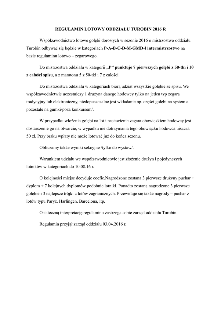 REGULAMIN LOTOWY ODDZIAŁU TUROBIN 2016 R Współzawodnictwo lotowe gołębi dorosłych w sezonie 2016 o mistrzostwo oddziału Turobin odbywać się będzie w kategoriach P-A-B-C-D-M-GMD-I intermistrzostwo na bazie regulaminu lotowo – zegarowego. Do mistrzostwa oddziału w kategorii ,,P’’ punktuje 7 pierwszych gołębi z 50-tki i 10 z całości spisu, a z maratonu 5 z 50-tki i 7 z całości. Do mistrzostwa oddziału w kategoriach biorą udział wszystkie gołębie ze spisu. We współzawodnictwie uczestniczy 1 drużyna danego hodowcy tylko na jeden typ zegara tradycyjny lub elektroniczny, niedopuszczalne jest wkładanie np. części gołębi na system a pozostałe na gumki/poza konkursem/. W przypadku włożenia gołębi na lot i nastawienie zegara obowiązkiem hodowcy jest dostarczenie go na otwarcie, w wypadku nie dotrzymania tego obowiązku hodowca uiszcza 50 zł. Przy braku wpłaty nie może lotować już do końca sezonu. Obliczamy także wyniki sekcyjne /tylko do wystaw/. Warunkiem udziału we współzawodnictwie jest złożenie drużyn i pojedynczych lotników w kategoriach do 10.08.16 r. O kolejności miejsc decyduje coefic.Nagrodzone zostaną 3 pierwsze drużyny puchar + dyplom + 7 kolejnych dyplomów podobnie lotniki. Ponadto zostaną nagrodzone 3 pierwsze gołębie i 3 najlepsze trójki z lotów zagranicznych. Przewiduje się także nagrody – puchar z lotów typu Paryż, Harlingen, Barcelona, itp. Ostateczną interpretację regulaminu zastrzega sobie zarząd oddziału Turobin. Regulamin przyjął zarząd oddziału 03.04.2016 r.