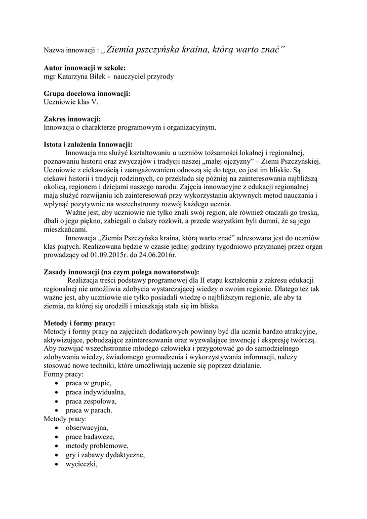 Nazwa innowacji : „Ziemia pszczyńska kraina, którą warto znać”