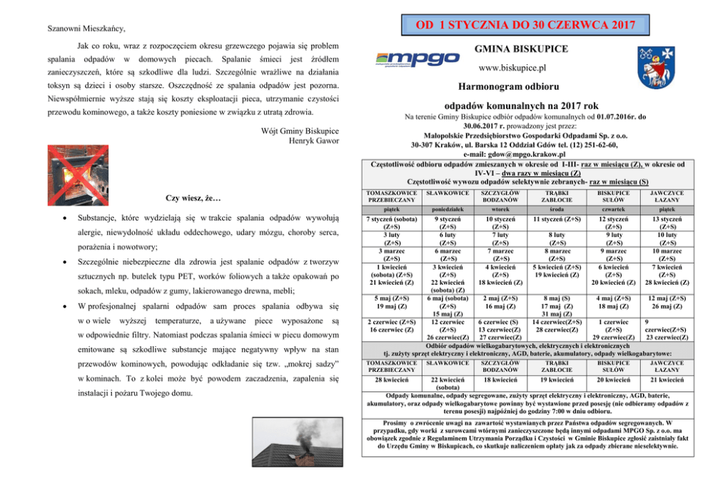 OD 1 STYCZNIA DO 30 CZERWCA 2017 Szanowni Mieszkańcy, Jak co roku, wraz z rozpoczęciem okresu grzewczego pojawia się problem spalania odpadów w domowych piecach. Spalanie śmieci jest GMINA BISKUPICE źródłem www.biskupice.pl zanieczyszczeń, które są szkodliwe dla ludzi. Szczególnie wrażliwe na działania toksyn są dzieci i osoby starsze. Oszczędność ze spalania odpadów jest pozorna. Harmonogram odbioru Niewspółmiernie wyższe stają się koszty eksploatacji pieca, utrzymanie czystości przewodu kominowego, a także koszty poniesione w związku z utratą zdrowia. Wójt Gminy Biskupice Henryk Gawor Czy wiesz, że… Substancje, które wydzielają się w trakcie spalania odpadów wywołują alergie, niewydolność układu oddechowego, udary mózgu, choroby serca, porażenia i nowotwory; Szczególnie niebezpieczne dla zdrowia jest spalanie odpadów z tworzyw sztucznych np. butelek typu PET, worków foliowych a także opakowań po sokach, mleku, odpadów z gumy, lakierowanego drewna, mebli; W profesjonalnej spalarni odpadów sam proces spalania odbywa się w o wiele wyższej temperaturze, a używane piece wyposażone są w odpowiednie filtry. Natomiast podczas spalania śmieci w piecu domowym emitowane są szkodliwe substancje mające negatywny wpływ na stan odpadów komunalnych na 2017 rok Na terenie Gminy Biskupice odbiór odpadów komunalnych od 01.07.2016r. do 30.06.2017 r. prowadzony jest przez: Małopolskie Przedsiębiorstwo Gospodarki Odpadami Sp. z o.o. 30-307 Kraków, ul. Barska 12 Oddział Gdów tel. (12) 251-62-60, e-mail: [email protected] Częstotliwość odbioru odpadów zmieszanych w okresie od I-III- raz w miesiącu (Z), w okresie od IV-VI – dwa razy w miesiącu (Z) Częstotliwość wywozu odpadów selektywnie zebranych- raz w miesiącu (S) TOMASZKOWICE PRZEBIECZANY SŁAWKOWICE SZCZYGŁÓW BODZANÓW TRĄBKI ZABŁOCIE BISKUPICE SUŁÓW JAWCZYCE ŁAZANY piątek poniedziałek wtorek środa czwartek piątek 7 styczeń (sobota) (Z+S) 3 luty (Z+S) 3 marzec (Z+S) 1 kwiecień (sobota) (Z+S) 21 kwiecień (Z) 9 styczeń 10 styczeń 11 styczeń (Z+S) 12 styczeń 13 styczeń (Z+S) (Z+S) (Z+S) (Z+S) 6 luty 7 luty 8 luty 9 luty 10 luty (Z+S) (Z+S) (Z+S) (Z+S) (Z+S) 6 marzec 7 marzec 8 marzec 9 marzec 10 marzec (Z+S) (Z+S) (Z+S) (Z+S) (Z+S) 3 kwiecień 4 kwiecień 5 kwiecień (Z+S) 6 kwiecień 7 kwiecień (Z+S) (Z+S) 19 kwiecień (Z) (Z+S) (Z+S) 22 kwiecień 18 kwiecień (Z) 20 kwiecień (Z) 28 kwiecień (Z) (sobota) (Z) 5 maj (Z+S) 6 maj (sobota) 2 maj (Z+S) 8 maj (S) 4 maj (Z+S) 12 maj (Z+S) 19 maj (Z) (Z+S) 16 maj (Z) 17 maj (Z) 18 maj (Z) 26 maj (Z) 15 maj (Z) 31 maj (Z) 2 czerwiec (Z+S) 12 czerwiec 6 czerwiec (S) 14 czerwiec(Z+S) 1 czerwiec 9 16 czerwiec (Z) (Z+S) 13 czerwiec(Z) 28 czerwiec(Z) (Z+S) czerwiec(Z+S) 26 czerwiec(Z) 27 czerwiec(Z) 29 czerwiec(Z) 23 czerwiec(Z) Odbiór odpadów wielkogabarytowych, elektrycznych i elektronicznych tj. zużyty sprzęt elektryczny i elektroniczny, AGD, baterie, akumulatory, odpady wielkogabarytowe: przewodów kominowych, powodując odkładanie się tzw. „mokrej sadzy” TOMASZKOWICE PRZEBIECZANY w kominach. To z kolei może być powodem zaczadzenia, zapalenia się 28 kwiecień instalacji i pożaru Twojego domu. SŁAWKOWICE SZCZYGŁÓW BODZANÓW TRĄBKI ZABŁOCIE BISKUPICE SUŁÓW JAWCZYCE ŁAZANY 22 kwiecień 18 kwiecień 19 kwiecień 20 kwiecień 21 kwiecień (sobota) Odpady komunalne, odpady segregowane, zużyty sprzęt elektryczny i elektroniczny, AGD, baterie, akumulatory, oraz odpady wielkogabarytowe powinny być wystawione przed posesję (nie odbieramy odpadów z terenu posesji) najpóźniej do godziny 7:00 w dniu odbioru. Prosimy o zwrócenie uwagi na zawartość wystawianych przez Państwa odpadów segregowanych. W przypadku, gdy worki z surowcami wtórnymi zanieczyszczone będą innymi odpadami MPGO Sp. z o.o. ma obowiązek zgodnie z Regulaminem Utrzymania Porządku i Czystości w Gminie Biskupice zgłosić zaistniały fakt do Urzędu Gminy w Biskupicach, co skutkuje naliczeniem opłaty jak za odpady zbierane nieselektywnie.
