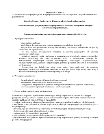 Ogłoszenie o naborze - Osoba świadcząca specjalistyczne usługi opiekuńcze dla dzieci z autyzmem i innymi zaburzeniami psychicznymi Ośrodek Pomocy Społecznej w Konstancinie-Jeziornie ogłasza nabór: Osoba świadcząca specjalistyczne usługi opiekuńcze dla dzieci z autyzmem i innymi zaburzeniami psychicznymi. Forma zatrudnienia umowa cywilno-prawna na okres od 01.01.2014 r. 1. Wymagania niezbędne: · · · · · · obywatelstwo polskie; kwalifikacje do wykonywania zawodu: pedagoga, psychologa, logopedy; nie jest i nie była pozbawiona władzy rodzicielskiej oraz władza rodzicielska nie jest jej zawieszona ani ograniczona; nie była skazana prawomocnym wyrokiem za umyślne przestępstwo lub umyślne przestępstwo skarbowe; posiada co najmniej 1 roku staż pracy w następujących jednostkach: placówce terapii lub placówce oświatowej, do której uczęszczają dzieci z zaburzeniami rozwoju lub upośledzeniem umysłowym, ośrodku terapeutyczno –edukacyjno –wychowawczym, zakładzie rehabilitacji, jednostce organizacyjnej pomocy społecznej dla osób z zaburzeniami psychicznymi; dopuszczalne jest świadczenie usług przez osoby, które zdobywają lub podnoszą wymagane kwalifikacje zawodowe określone w w/w pkt jeżeli mają roczny staż pracy i możliwość konsultacji z osobami świadczącymi już te usługi; 2. Wymagania dodatkowe: · · · · Samodzielność, umiejętność organizacji pracy własnej; Sumienność, obowiązkowość, odpowiedzialność; Umiejętności interpersonalne (łatwość nawiązywania kontaktów, empatia, cierpliwość); Doświadczenie w sprawach opiekuńczo –wychowawczych. 3. Zakres wykonywanych zadań na stanowisku: Rehabilitacja fizyczna i usprawnianie zaburzonych funkcji organizmu w zakresie nie objętym przepisami ustawy z dnia 27 sierpnia 2007r. o świadczeniach opieki zdrowotnej finansowanych ze środków publicznych (Dz.U.2004 nr 210 poz.2135): - zgodnie z zaleceniami lekarskimi lub specjalisty z zakresu rehabilitacji ruchowej lub fizjoterapii, - współpraca ze specjalistami w zakresie wspierania psychologiczno –pedagogicznego i edukacyjno – terapeutycznego zmierzającego do wielostronnej aktywizacji osoby korzystającej ze specjalistycznych usług; - dostarczanie informacji adekwatnych do wieku; - motywowanie do komunikacji werbalnej; - nauka alternatywnego (pozawerbalnego) sposobu komunikacji - porządkowanie dnia, poprzez wprowadzenie (w ustalony z opiekunami sposób) informacji o kolejno po sobie następujących danego dnia aktywnościach; Uczenie i rozwijanie umiejętności niezbędnych do samodzielnego życia, w tym zwłaszcza: - kształtowanie umiejętności zaspokajania podstawowych potrzeb życiowych, - kształtowanie umiejętności funkcjonowania społecznego; - motywowanie do aktywności; - prowadzenie treningu radzenia sobie ze złością w przypadku dzieci impulsywnych; - prowadzenie treningów umiejętności samoobsługi w zakresie : sygnalizowania potrzeb, samodzielnego jedzenia, samodzielnego mycia się, samodzielnego ubierania się i rozbierania; - kształtowania umiejętności społecznych; - interwencja i pomoc w życiu w rodzinie, w tym: psychoedukacja rodziców (prawnych opiekunów) w zakresie radzenia sobie z trudnymi zachowaniami dziecka; - informowanie rodziców (prawnych opiekunów) o rodzajach terapii wspomagających rozwój dziecka w placówkach prowadzących taką terapię. 4. Wymagane dokumenty: · · · · · · · · życiorys z przebiegiem nauki i pracy zawodowej (CV), list motywacyjny; dokument poświadczający wykształcenie; kwestionariusz osobowy * kopie świadectw pracy dokumentujących staż pracy; kopia dokumentu potwierdzającego obywatelstwo polskie i ukończenie 18 roku życia; Podpisane oświadczenie o pełnej zdolności do czynności prawnych oraz o korzystaniu z pełni praw publicznych. Podpisane oświadczenie, że kandydat nie był prawomocnie skazany za przestępstwa umyślne ścigane z oskarżenia publicznego lub umyślne przestępstwo skarbowe (osoba wybrana do zatrudnienia będzie zobowiązana do przedstawienia oryginału aktualnego „Zapytania o udzielenie informacji o osobie” z Krajowego Rejestru Karnego); Podpisana klauzula o treści „Wyrażam zgodę na przetwarzanie moich danych osobowych zawartych w ofercie pracy dla potrzeb rekrutacji, zgodnie z ustawą z dnia 29.08.1997r. o ochronie danych osobowych (Dz.U. z roku 2001 Nr 101, poz.926 z późn.zm.) oraz ustawa z dnia 21 listopada 2008r. o pracownikach samorządowych (Dz.U. z 2008r. Nr 223, poz. 1458 z późn.zm.)”. Wymagane dokumenty aplikacyjne należy składać osobiście w Ośrodku Pomocy Społecznej w Konstancinie-Jeziornie ul.Rycerska13 lub pocztą na adres Ośrodek Pomocy Społecznej w Konstancinie-Jeziornie ul. Rycerska13, 05-510 Konstancin-Jeziorna w zamkniętej kopercie z dopiskiem „ Specjalistyczne usługi dla dzieci” do dnia 27.12.2013 r. Informacja o wynikach naboru umieszczona będzie na stronie internetowej Ośrodka Pomocy Społecznej w Konstancinie-Jeziornie. *Druk kwestionariusza do pobrania ze strony Ośrodka Pomocy Społecznej w Konstancinie-Jeziornie.
