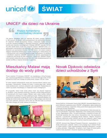 świat UNICEF dla dzieci na Ukrainie Kryzys humanitarny we wschodniej Ukrainie Od marca ubiegłego roku co najmniej 68 dzieci zostało zabitych, a 180 rannych na skutek walk prowadzonych we wschodniej Ukrainie. W ostatnich dniach doniesienia mówią o dzieciach ciężko rannych w wyniku eskalacji konfliktu w obwodzie donieckim. Niestety wiele obszarów jest obecnie niedostępnych. Dlatego UNICEF szacuje, że liczba ofiar wśród dzieci może być znacznie wyższa. UNICEF wraz z organizacjami partnerskimi robi wszystko, aby zapewnić bezpieczeństwo dzieciom we wschodniej Ukrainie. 500 000 dzieci i ich rodzin zostanie objętych kampanią edukacyjną o ryzyku związanym z obecnością min i niewybuchów oraz instrukcją bezpiecznego zachowania. W szkołach i ośrodkach wsparcia UNICEF zapewnił już pomoc psychologiczną i społeczną dla ponad 20 000 chłopców i dziewcząt. UNICEF dostarczył również wodę pitną dla ponad 550 000 osób poszkodowanych na skutek konfliktu w rejonie Doniecka i Ługańska. Mieszkańcy Malawi mają dostęp do wody pitnej © UNICEF Novak Djokovic odwiedza dzieci uchodźców z Syrii Przez ostatnie 18 miesięcy UNICEF, we współpracy z Unią Europejską, wspierał rząd Malawi w instalacji i remoncie 500 ujęć wody. W ten sposób do 2016 roku dostęp do pitnej wody uzyska 125 tys. osób. W wielu krajach afrykańskich woda jest wyznacznikiem statusu społecznego i zamożności. Dostęp do wody, a raczej jego brak, dotyka wiele społeczności, zarówno wiejskich, jak i miejskich. Najbardziej narażeni są ludzie mieszkający w miejscach trudno dostępnych. W przypadku dzieci brak wody pitnej może się okazać tragiczny w skutkach, grozi bowiem śmiercią z powodu chorób biegunkowych. W porównaniu do innych krajów, Malawi radzi sobie bardzo dobrze w zwiększaniu dostępu do wody zdatnej do picia. Według danych statystycznych zebranych w latach 2013-2014, 86% populacji Malawi ma dostęp do źródeł wody pitnej. Mimo olbrzymiego postępu, jaki dokonał się w tym zakresie, jeszcze w 2012 roku aż 748 mln ludzi na świecie nie miało dostępu do wody zdatnej do spożycia. © UNICEF © UNICEF Novak Djokovic, Ambasador Dobrej Woli UNICEF odwiedził Miejsce Przyjazne Dzieciom wspierane przez UNICEF w Belgradzie, gdzie spotkał się z dziećmi uchodźców i migrantów, którzy przemieszczają się przez Serbię w kierunku Europy Zachodniej. Novak Djokovic był głęboko poruszony sytuacją dzieci, które stanowią niemal 1/3 uchodźców i migrantów. Większość z nich ucieka przed przemocą w Syrii, Afganistanie i Iraku. Te dzieci podróżują z rodzinami od wielu dni. Przetrwały spiekotę dnia oraz zimne i deszczowe noce. Są wyczerpane fizycznie i psychicznie, powiedział Novak Djokovic. Miejsce Przyjazne Dzieciom stworzone przez UNICEF jest dla nich miejscem, gdzie mogą się bezpiecznie bawić, odpocząć i otrzymać wsparcie psychologiczne. UNICEF utworzył dwa Miejsca Przyjazne Dzieciom, wyposażone w materiały edukacyjne i zabawki. Jedno z nich znajduje się w mieście Preševo, blisko granicy z Byłą Jugosłowiańską Republiką Macedonii, a drugie w stolicy państwa – Belgradzie. W każdym z tych miejsc 50 dzieci jednocześnie może się bawić i otrzymać wsparcie psychologiczne. POLSKA MALI uczniowie idą do szkoły Każdy uczeń będzie mógł zostać autorem książki UNICEF Polska zaprasza wszystkie szkoły i przedszkola do nowego projektu edukacyjnego – MALI uczniowie idą do szkoły. W ramach projektu uczniowie dowiedzą się jak wygląda kwestia dostępu do edukacji na świecie, dlaczego nie wszędzie dzieci chodzą do szkoły i co robi UNICEF, by umożliwić każdemu naukę. Częścią projektu będzie przygotowanie własnych książek. Każdy uczeń będzie mógł zostać autorem książki, wystarczy, że uruchomi swoją wyobraźnię i przeleje na papier swój pomysł. Książki zostaną wystawione na kiermaszu w szkole, a darowizny zebrane z imprezy „Dzień Książki dla Afryki” zostaną przeznaczone na edukację dzieci w Mali. Wybrane książki wezmą także udział w konkursie, w którym nagrodą dla szkoły jest wizyta Ambasadora Dobrej Woli UNICEF – Artura Żmijewskiego. Szczegóły na stronie www. unicef.pl Zapraszamy wszystkie chętne placówki do akcji. © UNICEF Dzieci w Polsce UNICEF Polska uruchomił pierwszy w kraju serwis internetowy poświecony w całości monitorowaniu sytuacji dzieci. W serwisie DzieciwPolsce.pl można znaleźć najważniejsze informacje dotyczące życia dzieci w dziesięciu obszarach: demografia, zdrowie, edukacja, piecza zastępcza, rodzina, przemoc, ubóstwo, zachowania zdrowotne, wypadki, sport i rekreacja. Dzięki tym informacjom można uzyskać kompleksowy obraz życia dziecka w Polsce oraz wskazać najważniejsze problemy dotykające dzieci w naszym kraju. Zapraszamy wszystkich do odwiedzenia strony www.dzieciwpolsce.pl Konwencja o prawach dziecka 18 września odbyła się w Genewie Sesja Specjalna Komitetu Praw Dziecka, podczas której Rząd Polski przedstawił Raport z wykonywania przez nasz kraj zapisów Konwencji o prawach dziecka. Podczas Sesji przedstawiciele Rządu odpowiadali na dodatkowe pytania członków Komitetu. Komitet Praw Dziecka ocenia stan realizacji przez dany kraj zapisów Konwencji co 5 lat. W przypadku Polski ocena jest opracowywana na podstawie Raportu Rządowego i 2 Raportów Alternatywnych. Pierwszy z nich został przygotowany przez 12 wiodących polskich organizacji pozarządowych i zaprezentowany na Sesji Roboczej KPD w Genewie w lutym br. przez UNICEF oraz Fundację Dzieci Niczyje. © UNICEF