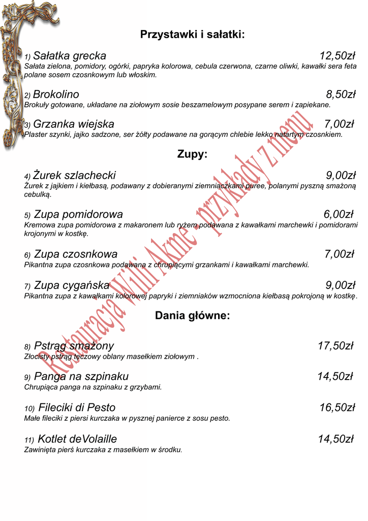 Przystawki i sałatki: 1) Sałatka grecka 12,50zł Sałata zielona, pomidory, ogórki, papryka kolorowa, cebula czerwona, czarne oliwki, kawałki sera feta polane sosem czosnkowym lub włoskim. 2) Brokolino 8,50zł Brokuły gotowane, układane na ziołowym sosie beszamelowym posypane serem i zapiekane. 3) Grzanka wiejska 7,00zł Plaster szynki, jajko sadzone, ser żółty podawane na gorącym chlebie lekko natartym czosnkiem. Zupy: 4) Żurek szlachecki 9,00zł Żurek z jajkiem i kiełbasą, podawany z dobieranymi ziemniaczkami puree, polanymi pyszną smażoną cebulką. 5) Zupa pomidorowa 6,00zł Kremowa zupa pomidorowa z makaronem lub ryżem podawana z kawałkami marchewki i pomidorami krojonymi w kostkę. 6) Zupa czosnkowa Pikantna zupa czosnkowa podawana z chrupiącymi grzankami i kawałkami marchewki. 7,00zł 7) Zupa cygańska 9,00zł Pikantna zupa z kawałkami kolorowej papryki i ziemniaków wzmocniona kiełbasą pokrojoną w kostkę. Dania główne: 8) Pstrąg smażony Złocisty pstrąg tęczowy oblany masełkiem ziołowym . 17,50zł 9) Panga na szpinaku Chrupiąca panga na szpinaku z grzybami. 14,50zł 10) Fileciki di Pesto Małe fileciki z piersi kurczaka w pysznej panierce z sosu pesto. 16,50zł 11) Kotlet deVolaille Zawinięta pierś kurczaka z masełkiem w środku. 14,50zł Wieprzowina: 12) Schab z grilla 15,00zł Schab z grilla marynowany w zalewie musztardowej podany z kawałkami świeżych pomidorów pod pierzynką z sera żółtego . 13) Golonka szefa kuchni Golonka pieczona w sosie piwnym. 16,50zł 14) Polędwiczki w sosie z leśnych Duszona polędwica w sosie z leśnych grzybów. grzybów 15) Placek po węgiersku Dwa placki ziemniaczane z gulaszem w środeczku. 26,00zł 18,50zł Dania różne i wegetariańskie 17) Ser smażony Krążek sera camembert w panierce z żurawiną. 11,00zł 18) Pierogi 11,50zł ruskie 19) Naleśniki ze szpinakiem Naleśniki zapiekane w żółtym serze i serem feta 11,00zł Desery: 20) Tequilla sunrise 9,00zł 3 gałki lodów (pomarańczowa, czekoladowa i waniliowa) polane syropem owocowym z dodatkiem świeżych owoców udekorowane pyszną bitą śmietaną. 21) Bananowy Split 8,50zł 3 gałki lodów (czekoladowa, waniliowa, dowolna) i połówki banana oblane musem czekoladowym i udekorowane bitą śmietaną. 22) Zapach lata 3 gałki do wyboru lodów owocowych, kawałki owoców, z dodatkiem bitej śmietany. 8,50zł 23) Brzoskwiniowy 8,50zł Kawałki brzoskwiń otoczone miodem, drzemiące pod kołderką z jogurtu naturalnego z dodatkiem wanillii lekko słodzonym.
