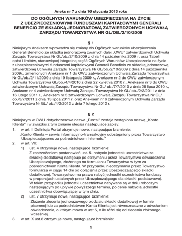 Aneks nr 7 z dnia 16 stycznia 2013 roku do Ogólnych warunków ubezpieczenia na życie z ubezpieczeniowymi funduszami kapitałowymi Generali Beneficio ze składką jednorazową zatwierdzonych Uchwałą Zarządu Towarzystwa Nr GL/ob./2/10/2009 §1 Niniejszym Aneksem wprowadza się zmiany do Ogólnych warunków ubezpieczenia Generali Beneficio ze składką jednorazową zwanych dalej „OWU” zatwierdzonych Uchwałą Zarządu Towarzystwa Nr GL/ob./2/10/2009 z dnia 14 października 2009 r. oraz Tabeli opłat i limitów, stanowiącej integralną część Ogólnych Warunków Ubezpieczenia na życie z ubezpieczeniowymi funduszami kapitałowymi Generali Beneficio ze składką jednorazową zatwierdzonej Uchwałą Zarządu Towarzystwa Nr GL/ob./2/10/2009 z dnia 14 października 2009r., zmienionych Aneksem nr 1 do OWU zatwierdzonym Uchwałą Zarządu Towarzystwa Nr GL/ob./2/11/2009 z dnia 19 listopada 2009 r., Aneksem nr 2 do OWU zatwierdzonym Uchwałą Towarzystwa GL/ob./4/4/2010 z dnia 22 kwietnia 2010 r., Aneksem nr 3 do OWU zatwierdzonym Uchwałą Zarządu Towarzystwa Nr GL/ ob./7/7/2010 z dnia 26 lipca 2010 r., Aneksem nr 4 zatwierdzonym Uchwałą Zarządu Towarzystwa Nr GL/ ob./2/2/2011 z dnia 16 lutego 2011 r., Aneksem nr 5 zatwierdzonym Uchwałą Zarządu Towarzystwa Nr GL/ ob./3/7/2011 z dnia 13 lipca 2011 r. oraz Aneksem nr 6 zatwierdzonym Uchwałą Zarządu Towarzystwa Nr GL/ ob./4/2/2012 z dnia 7 lutego 2012 r. §2 Niniejszym w OWU dotychczasowa nazwa „Portal” zostaje zastąpiona nazwą „Konto Klienta” i w związku z tym zmianie ulegają następujące zapisy: 1. w art. II Definicja Portal otrzymuje nowe, następujące brzmienie: „Konto Klienta – serwis informacyjno-transakcyjny udostępniony przez Towarzystwo Ubezpieczającemu za pośrednictwem Internetu.” 2. w art. VII: 1) ust. 4 otrzymuje nowe, następujące brzmienie: Z zastrzeżeniem postanowień ust. 5, nabycie jednostek uczestnictwa za składkę dodatkową następuje po otrzymaniu przez Towarzystwo oświadczenia Ubezpieczającego, złożonego na formularzu Towarzystwa w tym za pośrednictwem Konta Klienta. W przypadku nieotrzymania przez Towarzystwo formularza w ciągu 14 dni od opłacenia przez Ubezpieczającego składki dodatkowej, Towarzystwo ma prawo nabyć jednostki uczestnictwa funduszy w proporcjach ustalonych przez Ubezpieczającego dla składki podstawowej. W takim przypadku jednostki uczestnictwa nabywane są w dniu roboczym następującym po upływie powyższego terminu, po cenie nabycia jednostki uczestnictwa obowiązującej w tym dniu. 2) ust. 7 otrzymuje nowe, następujące brzmienie: Złożenie zlecenia jednorazowego podziału składki dodatkowej w formie pisemnej lub za pośrednictwem Konta Klienta jest równoznaczne z odwołaniem oświadczenia, o którym mowa w ust.5, o ile różni się od zlecenia złożonego wcześniej. 3. w art. X ust.8 otrzymuje nowe, następujące brzmienie: 1 Aneks nr 7 z dnia 16 stycznia 2013 roku Raz w roku polisy Towarzystwo przekaże Ubezpieczającemu informację o stanie rachunku. Przygotowanie i przekazanie informacji jest bezpłatne. Szczegółowy wykaz transakcji dostępny jest w każdym czasie w Koncie Klienta. 4. w art. XI ust. 4 otrzymuje nowe, następujące brzmienie: Towarzystwo dokona zmian w funduszach po otrzymaniu oświadczenia Ubezpieczającego, złożonego na formularzu Towarzystwa, w tym za pośrednictwem Konta Klienta udostępnionego mu przez Towarzystwo. §3 w art. XIV OWU: 1. ust. 10 otrzymuje nowe, następujące brzmienie: „10.Wszelkie zawiadomienia i oświadczenia wysłane odpowiednio na adres siedziby, miejsca zamieszkania lub na adres do korespondencji wywierają skutek z chwilą ich doręczenia adresatowi. Strony Umowy ubezpieczenia są zobowiązane do informowania się o każdej zmianie adresu siedziby lub odpowiednio miejsca zamieszkania oraz o każdej zmianie adresu do korespondencji.” 2. skreśla się ust. 11 w brzmieniu: „11. Za datę wpływu zawiadomień i Oświadczeń dotyczących Umowy, przekazywanych na piśmie przez Ubezpieczającego Pośrednikowi Ubezpieczeniowemu, uważa się datę wpływu dokumentów do siedziby Towarzystwa” 3. dotychczasowe ust. 12, 13, 14 15, 16, 17, 18, 19 otrzymują numerację 11, 12, 13, 14, 15, 16, 17, 18. nowy ust. 13 otrzymuje nowe, następujące brzmienie” „13. Wniosek, o którym mowa w ust. 12, zostanie rozpatrzony w ciągu 30 dni od daty wpływu do Towarzystwa. Gdyby w powyższym terminie rozpatrzenie skargi lub zażalenia okazało się niemożliwe ze względu na nie wyjaśnienie wszystkich okoliczności, wówczas rozpatrzenie nastąpi w ciągu 14, licząc od dnia, w którym wyjaśnienie tych okoliczności było możliwe.” 4. §4 w Klauzuli rozszerzającej ochronę o ryzyko śmierci w wyniku nieszczęśliwego wypadku: 1. w art. IV: 1) skreśla się pkt. 2.2. w brzmieniu: „2.2 z dniem przekształcenia Umowy ubezpieczenia w ubezpieczenie bezskładkowe” 2) dotychczasowy pkt. 2.3. otrzymuje numerację 2.2. 2. w art. VI ust. 5 otrzymuje nowe następujące brzmienie: „5.uprawianiem przez Ubezpieczonego następujących niebezpiecznych sportów lub aktywności fizycznych: baloniarstwa, lotniarstwa, paralotniarstwa, szybownictwa, motolotniarstwa, sportów motorowych i motorowodnych uprawianych pojazdami niezależnie od pojemności silnika, sportów walki, sportów spadochronowych, wspinaczki górskiej lub skałkowej, speleologii, skoków do wody, nurkowania przy użyciu specjalistycznego sprzętu, skoków na elastycznej linie (bungee jumping), raftingu i wszystkich jego 2 Aneks nr 7 z dnia 16 stycznia 2013 roku odmian, żeglarstwa morskiego, kite-surfingu, off-road skiingu/heliskiingu, kaskaderstwa oraz udziałem w zawodach sportowych poza lekkoatletyką i pływaniem.” §5 Niniejszym w Tabeli opłat i limitów: 1. pkt. 1 w Tabeli Opłat otrzymuje nowe, następujące brzmienie: „TABELA OPŁAT I LIMITÓW Opłaty Lp. Rodzaj opłaty 1 Opłata za przeniesienie jednostek uczestnictwa: ilość przenie