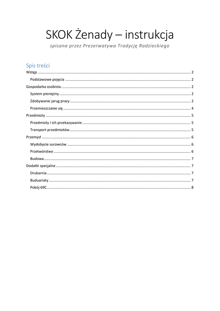 SKOK Żenady – instrukcja spisana przez Prezerwatywa Tradycję Radzieckiego Spis treści Wstęp ...................................................................................................................................................... 2 Podstawowe pojęcia ........................................................................................................................... 2 Gospodarka osobista ............................................................................................................................... 2 System pieniężny ................................................................................................................................. 2 Zdobywanie jarug pracy ...................................................................................................................... 2 Przemieszczanie się ............................................................................................................................. 4 Przedmioty .............................................................................................................................................. 5 Przedmioty i ich przekazywanie .......................................................................................................... 5 Transport przedmiotów....................................................................................................................... 5 Przemysł .................................................................................................................................................. 6 Wydobycie surowców ......................................................................................................................... 6 Przetwórstwo ...................................................................................................................................... 6 Budowa................................................................................................................................................ 7 Dodatki specjalne .................................................................................................................................... 7 Drukarnia ............................................................................................................................................. 7 Buduariaty ........................................................................................................................................... 7 Pokój 69C ............................................................................................................................................. 8 Wstęp Podstawowe pojęcia 1. SKOK Żenady, czyli (według jednego z wielu rozwinięć tego skrótu) System Kolektywnej Organizacji Komunistów im. tow. Żenady jest jednym z kilku wandejskich systemów informatycznych – i odpowiada za komunikację oraz za system gospodarczy (i kilka innych rodzajów aktywności). 2. SKOK Żenady ma budowę modułową – składa się z wielu elementów, z których można korzystać niezależnie, albo wręcz – nie korzystać wcale. 3. W niniejszym poradniku skupimy się na tej części modułów, które łącznie określa się jako „część gospodarczą”. Granica między nimi może być jednak dość płynna – dowodem jest chociażby „pozagospodarczy” moduł Służby Bezpieczeństwa, który pełniąc wiele funkcji informacyjnych i pomocniczych zawiera również element generujący jarugi pracy, wiążące się z gospodarką. Gospodarka osobista System pieniężny 1. Walutą Mandragoratu Wandystanu jest engels. Generalnie dzieli się on na 100 kimów – jednak w systemie SKOK Żenady kimy nie są wykorzystywane i nie musimy się nimi przejmować. 2. Za zarządzanie drukiem i obrotem pieniądza w systemie odpowiada Kasa Ludowa. W jej ramach wyznaczani są Kasjerzy, którzy mają możliwość podejmowania decyzji o dodruku. Protip: Kasa Ludowa została nazwana na cześć towarzysza Ludowa, znanego rewolucyjnego ekonomisty. W przeciwieństwie do inflacyjnych systemów burżuazyjnych, w SKOKu Żenady nie występuje automatyczny dodruk pieniądza. 3. Pieniądz w systemie występuje w dwóch postaciach: a. banknoty, które mają postać typowych dla systemu SKOK przedmiotów. Każdy banknot ma swój nominał i indywidualny numer. b. na kartach prepaid WanderCard, które każdy może sobie wyrobić w Kasie Ludowej (przycisk Dodaj kartę). 4. Karty prepaid można doładowywać wykorzystując posiadane banknoty. Możliwe jest też dokonywanie bezpośrednich przelewów między dwoma kartami. Karty są wydawane na okaziciela, można je swobodnie przekazywać między sobą. Nie ma ograniczeń ilości posiadanych kart. 5. Pieniądze nie pojawią się znikąd i nie przyrastają same z siebie. Aby uzyskać pieniądz, musisz go od kogoś otrzymać. Pogadaj z innymi obywatelami – może wspomogą cię bezzwrotną pożyczką, może Władza Ludowa nagrodzi Cię za jakieś działanie, albo któraś kooperatywa zapłaci za przekazywanie jarug pracy. Działaj! Protip: Centrala Przemysłu Naftowego płaci 1 engelsa za każdą jarugę pracy przekazane do jej kooperatywy. Przed przekazaniem środków upewnij się, że masz kartę prepaid, a po przekazaniu przypomnij się zarządcy CPN. Zdobywanie jarug pracy 1. Jaruga, będąca niegdyś uniwersalnym określeniem ilości jakiegoś towaru czy surowca, dziś stosowana jest niemal wyłącznie do określenia ilości pracy. Najbliższym realowym odpowiednikiem jest chyba osobodzień albo roboczogodzina. 2. Jarugi pracy, tradycyjnie dla systemów gospodarczych Wandystanu, można gromadzić, można też je przekazywać (z własnej inicjatywy, albo np. za wynagrodzenie). 3. Ilość jarug pracy, które pozyskujecie jest determinowana przez tzw. Współczynnik CHUJ, czyli Codziennej Historii Urobku Jarug. Odpowiada on twojej wydajności – im większy współczynnik, tym więcej jarug możesz pozyskać w krótszym czasie.