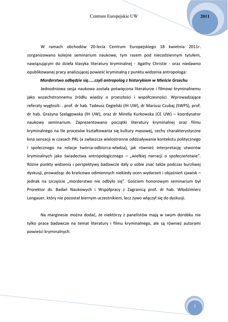 Centrum Europejskie UW 2011 W ramach obchodów 20-lecia Centrum Europejskiego 18 kwietnia 2011r. zorganizowano kolejne seminarium naukowe, tym razem pod niecodziennym tytułem, nawiązującym do dzieła klasyka literatury kryminalnej - Agathy Christie - oraz niedawno opublikowanej pracy analizującej powieść kryminalną z punktu widzenia antropologa: Morderstwo odbędzie się.....czyli antropolog z historykiem w Mieście Grzechu Jednodniowa sesja naukowa została poświęcona literaturze i filmowi kryminalnemu jako wszechstronnemu źródłu wiedzy o przeszłości i współczesności. Wprowadzające referaty wygłosili: . prof. dr hab. Tadeusz Cegielski (IH UW), dr Mariusz Czubaj (SWPS), prof. dr hab. Grażyna Szelągowska (IH UW), oraz dr Mirella Kurkowska (CE UW) – koordynator naukowy seminarium. Zaprezentowano początki literatury kryminalnej oraz filmu kryminalnego na tle procesów kształtowania się kultury masowej, cechy charakterystyczne kina sensacji w czasach PRL (a zwłaszcza wielostronne oddziaływanie kontekstu politycznego i społecznego na relacje twórca-odbiorca-władza), jak również interpretację utworów kryminalnych jako świadectwa antropologicznego – „wielkiej narracji o społeczeństwie”. Różne punkty widzenia i perspektywy badawcze dały o sobie znać także podczas burzliwej dyskusji, prowadząc do krańcowo odmiennych niekiedy ocen wydarzeń i objaśnień zjawisk – jednak na szczęście „morderstwo nie odbyło się”. Gościem honorowym seminarium był Prorektor ds. Badań Naukowych i Współpracy z Zagranicą prof. dr hab. Włodzimierz Lengauer, który nie pozostał biernym uczestnikiem, lecz żywo włączył się do dyskusji. Na marginesie można dodać, że niektórzy z panelistów mają w swym dorobku nie tylko prace badawcze na temat literatury i filmu kryminalnego, ale są również autorami powieści kryminalnych. 1