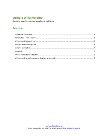 Osiedle Willa Kiełpino Standard wykończenia oraz specyfikacja techniczna Spis treści Projekt i architektura........................................................................................................................... 2 Konstrukcja i stan surowy.................................................................................................................... 2 Wykończenie zewnętrzne.................................................................................................................... 3 Wykończenie wewnętrzne .................................................................................................................. 4 Stolarka zewnętrzna ............................................................................................................................ 4 Instalacje.............................................................................................................................................. 5 Wykończenie terenu działek ............................................................................................................... 9 Wykończenie wspólnego pasa drogi wewnętrznej ............................................................................. 9 www.willakielpino.pl Biuro sprzedaży: tel. +58 550 42 02, e-mail: [email protected] PROJEKT I ARCHITEKTURA Domy osiedla „Willa Kiełpino” zaprojektowane zostały przez doświadczonych architektów z pracowni CKK Architekci w Gdyni. Została opracowana i złożona, dokładna dokumentacja architektoniczna i wykonawcza każdego z szesnastu domów wraz z wizualizacjami elewacji, rzutami poziomymi. Zastosowane rozwiązania są przemyślane, ponadczasowe i gwarantują Państwu komfortowe warunki zamieszkania przy niskich kosztach użytkowania. Na wyjątkowość projektów składa się: atrakcyjna i nowoczesna architektura z pełnej wysokości kondygnacją I piętra (bez ścian kolankowych i skosów), poddasze są nieużytkowe, ale z możliwością zagospodarowania, komfortowe, dwu lub trzykondygnacyjne wille (w zależności od ukształtowania terenu), o powierzchni użytkowej od 280 do 300 m2, dwa wygodne stanowiska w garażu, instalacja kominkowa umożliwiająca aranżację kominka wewnętrznego i zewnętrznego, duże, wygodne tarasy i podcienie, duże przestronne działki, powyżej 1250 m2, usytuowane w przepięknej okolicy bezpośrednio przy lesie, wykończona i dobrze zagospodarowana przestrzeń wspólna osiedla, zastosowanie materiałów wykończeniowych i urządzeń technicznych najwyższej jakości, ogrodzenia posesji od strony ulicy wewnętrznej pokryte klinkierem i kamieniem z ażurowymi metalowymi wypełnieniami. KONSTRUKCJA I STAN SUROWY Zastosowane technologie budowy gwarantują najwyższą jakość i komfort użytkowania domów: sprawdzona, tradycyjna technologią budowy ścian zewnętrznych i wewnętrznych z bloczków klasy YTONG ocieplanych styropianem i wełną w technologii ściany trójwarstwowej, stopy i ławy fundamentowe żelbetowe monolityczne, wylewane na miejscu budowy, ściany zewnętrzne do wysokości 35cm nad poziomem gruntu wymurowane z bloczków betonowych grubości 24 cm z izolacją przeciwwodną oraz ocieplone styropianem XPS 30 o grubości 10 cm, ściany zewnętrzne z gazobetonu o grubości 24 cm na zaprawie cementowo – wapiennej ocieplone ponadstandardowo styropianem o grubości 16 cm pod płytkami klinkierowymi i tynkiem, 12 cm pod okładziną kamienną oraz wełną mineralną o grubości 12 cm pod drewnem elewacyjnym, kominy systemowe firmy Shiedel, izolacja termiczna stropu (poddasze nieużytkowe) nad kondygnacją użytkową – wełna mineralna 15cm, www.willakielpino.pl Biuro sprzedaży: tel. +58 550 42 02, e-mail: [email protected] ściany wewnętrzne nośne z gazobetonu 24cm na zaprawie cementowo – wapiennej, ściany wewnętrzne działowe z gazobetonu 12 cm na zaprawie cementowo – wapiennej, dach wielospadowy o kącie nachylenia połaci 25°, o konstrukcji drewnianej, pokryty płytą OSB oraz folią. WYKOŃCZENIE ZEWNĘTRZNE Wykończenie elewacji wszystkich budynków: tynk silikatowo-silikonowy CT 174 2,0 mm firmy Ceresit-Henkel, kolor SV1 – gwarancja firmy Henkel – 8 lat, płytki klinkierowe holenderskiej firmy Elastolith, cokoły, słupy, słupki na tarasach oraz fragmenty ścian wykończone kamieniem elewacyjnym, wysokiej jakości drewno elewacyjne, parapety zewnętrzne podokienne oraz parapety elewacyjne (odcinające różne materiały elewacyjne), czapy na słupach i murkach wykonane są z granitu polerowanego Tiger Skin Yellow o grubości 3 cm. Dach: dachówka betonowa firmy BRASS w kolorze grafitowym o podwyższonej jakości i gładkości (technologia CISAR), opierzenia i obróbki blacharskie z blachy ocynkowanej powlekanej, orynnowanie renomowanej firmy LINDAB: o rynny Ø120mm, o rury spustowe Ø100mm. Schody zewnętrzne w domach trójkondygnacyjnych: konstrukcja żelbetonowa, stopnie obłożone granitem o grubości 3 cm, podstopnie obłożone granitem o grubości 2 cm. Wykończenie tarasów zewnętrznych na piętrze i na gruncie oraz spoczników schodów zewnętrznych: zbrojone i izolowane płyty posadzkowe, obłożenie płytami granitowymi Padang Light o grubości 1 cm, tarasy na piętrze wykończone są obróbką blacharską systemową z aluminium. Balustrady tarasowe i schodowe zewnętrzne: wykonane ze stali ocynkowanej trzykrotnie malowanej, drewniane pochwyty. www.willakielpino.pl Biuro sprzedaży: tel. +58 550 42 02, e-mail: [email protected] Oświetlenie zewnętrzne domów: każdy z typów domów posiada oświetlenie zewnętrzne - w zależności od typu domu jest to od 8 do 12 lamp tarasowych lub elewacyjnych, wszystkie lampy są energooszczędne i wyposażone w wyłącznik zmierzchowy. WYKOŃCZENIE WEWNĘTRZNE w pomieszczeniach mieszkalnych ściany i sufity pokryte są tynkiem gipsowym, w pomieszczeniach technicznych, garażu i łazienkach ściany i sufity pokryte są tynkiem cementowym, w pomieszczeniach mi