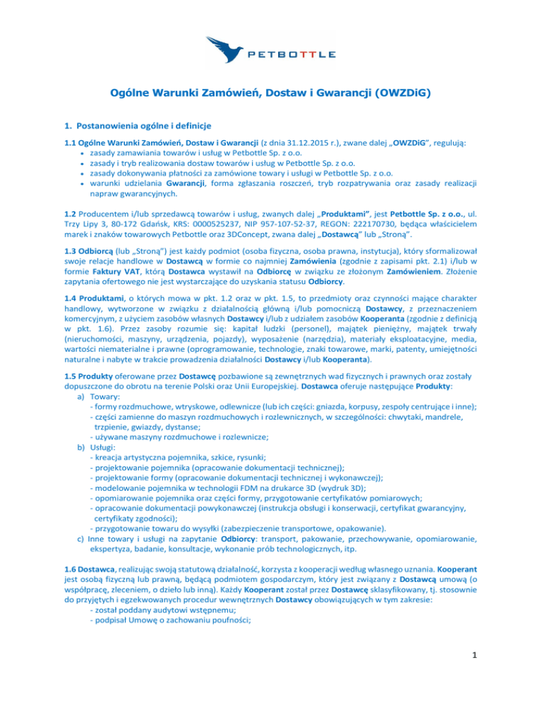 Ogólne Warunki Zamówień, Dostaw i Gwarancji (OWZDiG) 1. Postanowienia ogólne i definicje 1.1 Ogólne Warunki Zamówień, Dostaw i Gwarancji (z dnia 31.12.2015 r.), zwane dalej „OWZDiG”, regulują: zasady zamawiania towarów i usług w Petbottle Sp. z o.o. zasady i tryb realizowania dostaw towarów i usług w Petbottle Sp. z o.o. zasady dokonywania płatności za zamówione towary i usługi w Petbottle Sp. z o.o. warunki udzielania Gwarancji, forma zgłaszania roszczeń, tryb rozpatrywania oraz zasady realizacji napraw gwarancyjnych. 1.2 Producentem i/lub sprzedawcą towarów i usług, zwanych dalej „Produktami”, jest Petbottle Sp. z o.o., ul. Trzy Lipy 3, 80-172 Gdańsk, KRS: 0000525237, NIP 957-107-52-37, REGON: 222170730, będąca właścicielem marek i znaków towarowych Petbottle oraz 3DConcept, zwana dalej „Dostawcą” lub „Stroną”. 1.3 Odbiorcą (lub „Stroną”) jest każdy podmiot (osoba fizyczna, osoba prawna, instytucja), który sformalizował swoje relacje handlowe w Dostawcą w formie co najmniej Zamówienia (zgodnie z zapisami pkt. 2.1) i/lub w formie Faktury VAT, którą Dostawca wystawił na Odbiorcę w związku ze złożonym Zamówieniem. Złożenie zapytania ofertowego nie jest wystarczające do uzyskania statusu Odbiorcy. 1.4 Produktami, o których mowa w pkt. 1.2 oraz w pkt. 1.5, to przedmioty oraz czynności mające charakter handlowy, wytworzone w związku z działalnością główną i/lub pomocniczą Dostawcy, z przeznaczeniem komercyjnym, z użyciem zasobów własnych Dostawcy i/lub z udziałem zasobów Kooperanta (zgodnie z definicją w pkt. 1.6). Przez zasoby rozumie się: kapitał ludzki (personel), majątek pieniężny, majątek trwały (nieruchomości, maszyny, urządzenia, pojazdy), wyposażenie (narzędzia), materiały eksploatacyjne, media, wartości niematerialne i prawne (oprogramowanie, technologie, znaki towarowe, marki, patenty, umiejętności naturalne i nabyte w trakcie prowadzenia działalności Dostawcy i/lub Kooperanta). 1.5 Produkty oferowane przez Dostawcę pozbawione są zewnętrznych wad fizycznych i prawnych oraz zostały dopuszczone do obrotu na terenie Polski oraz Unii Europejskiej. Dostawca oferuje następujące Produkty: a) Towary: - formy rozdmuchowe, wtryskowe, odlewnicze (lub ich części: gniazda, korpusy, zespoły centrujące i inne); - części zamienne do maszyn rozdmuchowych i rozlewnicznych, w szczególności: chwytaki, mandrele, trzpienie, gwiazdy, dystanse; - używane maszyny rozdmuchowe i rozlewnicze; b) Usługi: - kreacja artystyczna pojemnika, szkice, rysunki; - projektowanie pojemnika (opracowanie dokumentacji technicznej); - projektowanie formy (opracowanie dokumentacji technicznej i wykonawczej); - modelowanie pojemnika w technologii FDM na drukarce 3D (wydruk 3D); - opomiarowanie pojemnika oraz części formy, przygotowanie certyfikatów pomiarowych; - opracowanie dokumentacji powykonawczej (instrukcja obsługi i konserwacji, certyfikat gwarancyjny, certyfikaty zgodności); - przygotowanie towaru do wysyłki (zabezpieczenie transportowe, opakowanie). c) Inne towary i usługi na zapytanie Odbiorcy: transport, pakowanie, przechowywanie, opomiarowanie, ekspertyza, badanie, konsultacje, wykonanie prób technologicznych, itp. 1.6 Dostawca, realizując swoją statutową działalność, korzysta z kooperacji według własnego uznania. Kooperant jest osobą fizyczną lub prawną, będącą podmiotem gospodarczym, który jest związany z Dostawcą umową (o współpracę, zleceniem, o dzieło lub inną). Każdy Kooperant został przez Dostawcę sklasyfikowany, tj. stosownie do przyjętych i egzekwowanych procedur wewnętrznych Dostawcy obowiązujących w tym zakresie: - został poddany audytowi wstępnemu; - podpisał Umowę o zachowaniu poufności; 1 - został zakwalifikowany do prowadzenia w prac w uzgodnionym zakresie; - podlega stałemu monitoringowi jakościowemu; - zostaje poddany regularnej, bieżącej kontroli w trakcie realizacji każdego projektu; - podlega każdorazowo weryfikacji powykonawczej. 2. Zamówienia 2.1 Tryb udzielania Zamówienia. Udzielenie Zamówienia jest realizowane chronologicznie zgodnie z poniższym harmonogramem: - zapytanie ofertowe sformułowane przez zainteresowany podmiot bez sformalizowanej formy (pocztą tradycyjną lub elektroniczną); - oferta na formularzu Dostawcy, zawierająca wszystkie istotne warunki Zamówienia oraz akceptację przez Odbiorcę OWZDiG (pocztą tradycyjną lub elektroniczną); - podpisanie Umowy o zachowaniu poufności; - zamówienie od Odbiorcy bez sformalizowanej formy powołujące się na nr i datę oferty złożonej przez Dostawcę (pocztą tradycyjną lub elektroniczną); - podpisanie umowy na dostawę Produktu (opcjonalnie); - przesłanie potwierdzenia przyjęcia Zamówienia do realizacji wraz z Fakturą VAT zaliczkową („proforma”) według oferty Dostawcy (pisemnie pocztą tradycyjną lub elektroniczną); - produkcja i dostawa Produktu do Odbiorcy; - wystawienie Faktury VAT i przesłanie do Odbiorcy; - zapłata za Fakturę VAT przez Odbiorcę zgodnie z warunkami oferty Dostawcy lub podpisanej umowy. 2.2 Realizacja Zamówienia. Dostawca przystępuje do realizacji Zamówienia po odnotowaniu wpływu na rachunek bankowy kwoty zaliczki, na podstawie przesłanej wcześniej Odbiorcy Faktury VAT zaliczkowej („pro-forma”), zgodnie z postanowieniami oferty Dostawcy (lub umowy między Dostawcą i Odbiorcą), z uwzględnieniem zapisów pkt. 2.1 i 4.2. Brak wpłaty kwoty zaliczki w okresie ważności oferty Dostawcy upoważnia Dostawcę do odstąpienia od realizacji zamówienia lub umowy bez konieczności powiadamiania o tym fakcie (potencjalnego) Odbiorcy. 2.3 Realizacja Zamówienia odbywa się zgodnie z harmonogramem ofertowym złożonym Odbiorcy. Dostawca, w szczególności inżynier projektu, w czasie realizacji projektu, pozostaje w stałym kontakcie z osobą prowadzącą projekt, wyznaczoną przez Odbiorcę. Kontakt, w zależności od potrz
