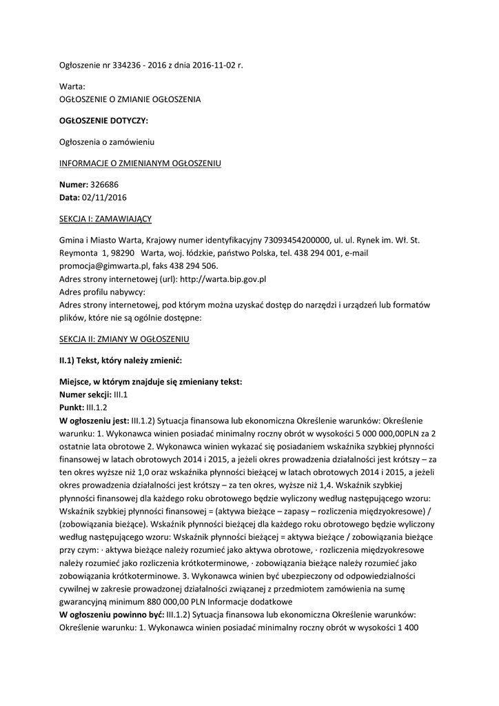 Ogłoszenie nr 334236 - 2016 z dnia 2016-11-02 r. Warta: OGŁOSZENIE O ZMIANIE OGŁOSZENIA OGŁOSZENIE DOTYCZY: Ogłoszenia o zamówieniu INFORMACJE O ZMIENIANYM OGŁOSZENIU Numer: 326686 Data: 02/11/2016 SEKCJA I: ZAMAWIAJĄCY Gmina i Miasto Warta, Krajowy numer identyfikacyjny 73093454200000, ul. ul. Rynek im. Wł. St. Reymonta 1, 98290 Warta, woj. łódzkie, państwo Polska, tel. 438 294 001, e-mail [email protected], faks 438 294 506. Adres strony internetowej (url): http://warta.bip.gov.pl Adres profilu nabywcy: Adres strony internetowej, pod którym można uzyskać dostęp do narzędzi i urządzeń lub formatów plików, które nie są ogólnie dostępne: SEKCJA II: ZMIANY W OGŁOSZENIU II.1) Tekst, który należy zmienić: Miejsce, w którym znajduje się zmieniany tekst: Numer sekcji: III.1 Punkt: III.1.2 W ogłoszeniu jest: III.1.2) Sytuacja finansowa lub ekonomiczna Określenie warunków: Określenie warunku: 1. Wykonawca winien posiadać minimalny roczny obrót w wysokości 5 000 000,00PLN za 2 ostatnie lata obrotowe 2. Wykonawca winien wykazać się posiadaniem wskaźnika szybkiej płynności finansowej w latach obrotowych 2014 i 2015, a jeżeli okres prowadzenia działalności jest krótszy – za ten okres wyższe niż 1,0 oraz wskaźnika płynności bieżącej w latach obrotowych 2014 i 2015, a jeżeli okres prowadzenia działalności jest krótszy – za ten okres, wyższe niż 1,4. Wskaźnik szybkiej płynności finansowej dla każdego roku obrotowego będzie wyliczony według następującego wzoru: Wskaźnik szybkiej płynności finansowej = (aktywa bieżące – zapasy – rozliczenia międzyokresowe) / (zobowiązania bieżące). Wskaźnik płynności bieżącej dla każdego roku obrotowego będzie wyliczony według następującego wzoru: Wskaźnik płynności bieżącej = aktywa bieżące / zobowiązania bieżące przy czym: · aktywa bieżące należy rozumieć jako aktywa obrotowe, · rozliczenia międzyokresowe należy rozumieć jako rozliczenia krótkoterminowe, · zobowiązania bieżące należy rozumieć jako zobowiązania krótkoterminowe. 3. Wykonawca winien być ubezpieczony od odpowiedzialności cywilnej w zakresie prowadzonej działalności związanej z przedmiotem zamówienia na sumę gwarancyjną minimum 880 000,00 PLN Informacje dodatkowe W ogłoszeniu powinno być: III.1.2) Sytuacja finansowa lub ekonomiczna Określenie warunków: Określenie warunku: 1. Wykonawca winien posiadać minimalny roczny obrót w wysokości 1 400 000,00PLN za 2 ostatnie lata obrotowe 2. Wykonawca winien wykazać się posiadaniem wskaźnika szybkiej płynności finansowej w latach obrotowych 2014 i 2015, a jeżeli okres prowadzenia działalności jest krótszy – za ten okres wyższe niż 1,0 oraz wskaźnika płynności bieżącej w latach obrotowych 2014 i 2015, a jeżeli okres prowadzenia działalności jest krótszy – za ten okres, wyższe niż 1,4. Wskaźnik szybkiej płynności finansowej dla każdego roku obrotowego będzie wyliczony według następującego wzoru: Wskaźnik szybkiej płynności finansowej = (aktywa bieżące – zapasy – rozliczenia międzyokresowe) / (zobowiązania bieżące). Wskaźnik płynności bieżącej dla każdego roku obrotowego będzie wyliczony według następującego wzoru: Wskaźnik płynności bieżącej = aktywa bieżące / zobowiązania bieżące przy czym: · aktywa bieżące należy rozumieć jako aktywa obrotowe, · rozliczenia międzyokresowe należy rozumieć jako rozliczenia krótkoterminowe, · zobowiązania bieżące należy rozumieć jako zobowiązania krótkoterminowe. 3. Wykonawca winien być ubezpieczony od odpowiedzialności cywilnej w zakresie prowadzonej działalności związanej z przedmiotem zamówienia na sumę gwarancyjną minimum 880 000,00 PLN Informacje dodatkowe. Burmistrz Gminy i Miasta Warta /-/ Jan Serafiński