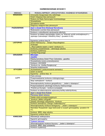 HARMONOGRAM 2010/2011 MIESIĄC WRZESIEŃ PAŹDZIERNIK LISTOPAD GRUDZIEŃ STYCZEŃ LUTY RODZAJ IMPREZY, UROCZYSTOŚCI, WAŻNEGO WYDARZENIA Uroczysta inauguracja roku szkolnego Dzień integracji klas pierwszych Wybory do Rady Samorządu Uczniowskiego Wywiadówka Sprzątanie świata Diagnozy wstępne klas pierwszych Apel z okazji Dnia Edukacji Narodowej Ślubowanie uczniów klas pierwszych Konkurs o szkodliwości spożywania alkoholu Konkurs na plakat zapraszający dzieci na "Wieczór wróżb andrzejkowych u Jędrzeja Czarodzieja i Wiedźmy Klary". (przełom X-XI). Egzaminy próbne klas III Dzień Patriotyczny - Święto Niepodległości Andrzejki „ Rzuć palenie razem z nami”- konkurs (1) Konkursy przedmiotowe – eliminacje szkolne Konkurs czytelniczy Turniej Ping-ponga Mikołajki Jasełka Międzynarodowy Dzień Praw Człowieka - gazetka Wywiadówka (oceny przewidywane) Konkurs i HIV/AIDS Konkurs na ,,Kartkę Świąteczną”. Wspólne kolędowanie Wywiadówka ( podsumowanie semestru) Dzień na temat. Egzaminy próbne klas III Ferie zimowe Przeprowadzenie konkursu mitologicznego. Stop narkotykom! - konkurs Wewnątrzszkolny konkurs geograficzny – „Jeden z dziesięciu”. Przeprowadzenie szkolnego konkursu historycznego. Podróż po Europie – konkurs europejski Konkurs na własnoręcznie wykonaną kartkę walentynkową MARZEC KWIECIEŃ Apel z okazji Dnia Kobiet Pierwszy dzień wiosny Giełda szkół ponadgimnazjalnych Konkurs „Mistrz ortografii”. Zasady zdrowego odżywiania - Konkurs Konkurs zewnętrzny „Kangur matematyczny”. Wewnątrzszkolny konkurs biologiczny - „Jeden z dziesięciu”. Stanisław Wyspiański i jego twórczość w oczach gimnazjalisty. (przełom IIIIV). Konkurs BRD- etap szkolny. Egzaminy próbne klas III Rekolekcje wielkopostne Egzamin gimnazjalny Tydzień zdrowia Wewnątrzszkolny konkurs fizyczny - „Jeden z dziesięciu”. Konkurs BRD- etap powiatowy. Konkurs czytelniczy MAJ CZERWIEC Dzień Patriotyczny - Rocznica Konstytucji 3 Maja Dzień Europejski Wywiadówka ( oceny przewidywane) „ Rzuć palenie razem z nami”- konkurs (2) Wewnątrzszkolny konkurs chemiczny- „Jeden z dziesięciu”. Egzaminy próbne klas II Diagnozy końcowe klas pierwszych. Szkolna giełda podręczników Konkurs „Bezpieczne wakacje”. Dzień Dziecka na sportowo. Wewnątrzszkolny konkurs matematyczny „Jeden z dziesięciu”. Dzień na temat: Konkurs o krajach anglo - i niemieckojęzycznych Pożegnanie absolwentów Uroczyste zakończenie roku szkolnego