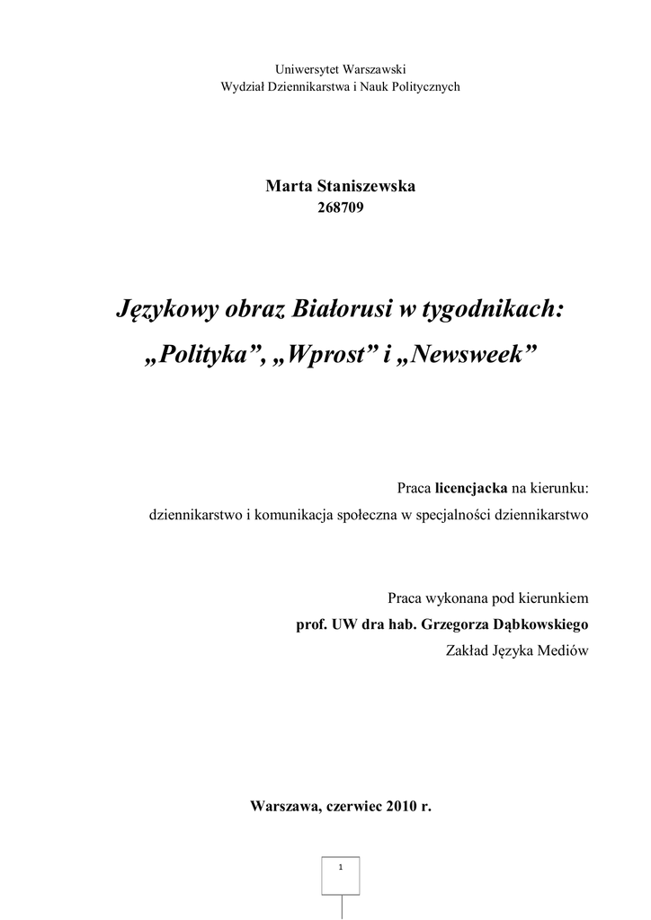 Uniwersytet Warszawski Wydział Dziennikarstwa i Nauk Politycznych Marta Staniszewska 268709 Językowy obraz Białorusi w tygodnikach: „Polityka”, „Wprost” i „Newsweek” Praca licencjacka na kierunku: dziennikarstwo i komunikacja społeczna w specjalności dziennikarstwo Praca wykonana pod kierunkiem prof. UW dra hab. Grzegorza Dąbkowskiego Zakład Języka Mediów Warszawa, czerwiec 2010 r. 1 Oświadczenie kierującego pracą Oświadczam, że niniejsza praca została przygotowana pod moim kierunkiem i stwierdzam, że spełnia ona warunki do przedstawienia jej w postępowaniu o nadanie tytułu zawodowego. 10 czerwca 2010 r. Oświadczenie autora pracy Świadoma odpowiedzialności prawnej oświadczam, że niniejsza praca dyplomowa została napisana przez mnie samodzielnie i nie zawiera treści uzyskanych w sposób niezgodny z obowiązującymi przepisami. Oświadczam również, że przedstawiona praca nie była wcześniej przedmiotem procedur związanych z uzyskaniem tytułu zawodowego w wyższej uczelni. Oświadczam ponadto, że niniejsza wersja pracy jest identyczna z załączoną wersją elektroniczną. 10 czerwca 2010 r. 2 STRESZCZENIE PRACY Celem niniejszej pracy jest analiza artykułów dotyczących Białorusi zawartych w tygodnikach: „Wprost”, „Newsweek” i „Polityka” od stycznia 2008 r. do marca 2010 r. oraz wykazanie, że Białoruś we wspomnianych tytułach przedstawiona jest jednostronnie i niepełnie. W pierwszym rozdziale przedstawiłam historię Białorusi, która ma wpływ na panujące dziś stereotypy w Polsce państwa za Bugiem. Drugi rozdział zawiera krótkie opisy czasopism, których artykuły poddałam analizie. W kolejnym rozdziale skoncentrowałam się na stereotypach Białorusinów, które wpływają na tworzenie tekstów i ich odbiór. Czwarty i piąty rozdział zostały poświęcone tematyce dotyczącej Białorusi poruszanej na łamach tygodników oraz analizie warstwy językowej, która buduje obraz państwa wśród Polaków. SŁOWA KLUCZOWE Białoruś, Łukaszenka, Białorusin, reżim, dyktatura, opozycja, stereotyp, komunizm. DZEDZINA PRACY, NUMER KODOWY I NAZWA 15.100 - dziennikarstwo i komunikacja społeczna TYTUŁ PRACY DYPLOMOWEJ W JĘZYKU ANGIELSKIM The linguistic picture of White Russia in magazines: “Newsweek”, “Wprost” and “Polityka” 3 SPIS TREŚCI WPROWADZENIE ........................................................................................................................... 6 WSTĘP.............................................................................................................................................. 7 1. Zarys historii Białorusi ............................................................................................................... 9 1.1. Początki państwa ..................................................................................................................... 9 1.2. Wielkie Księstwo Litewskie .................................................................................................... 9 1.3. Rzeczpospolita Obojga Narodów ........................................................................................... 10 1.4. Ziemie białoruskie w imperium rosyjskim ............................................................................. 11 1.5. I wojna światowa i 20-lecie międzywojenne na ziemiach białoruskich ................................... 11 1.6. II wojna światowa na ziemiach białoruskich .......................................................................... 12 1.7. Białoruska Republika Radziecka ........................................................................................... 13 1.8. Suwerenne państwo ............................................................................................................... 13 2. Charakterystyka tygodników .................................................................................................... 14 2.1. „Newsweek Polska” .............................................................................................................. 14 2.2. „Polityka” ............................................................................................................................. 15 2.3. „Wprost” ............................................................................................................................... 16 3. Stereotyp Białorusinów w Polsce.............................................................................................. 16 3.1. Stereotyp ............................................................................................................................... 16 3.2. Stereotyp Białorusinów w nazewnictwie etnicznym ............................................................... 17 3.3. Stereotypowe cechy Białorusinów ......................................................................................... 18 3.4. Stosunek do ruskiej kultury w przysłowiach geograficznych .................................................. 18 4. Tematyka dotycząca Białorusi poruszana w tygodnikach: ......................................................... 19 4.1. Polityka ................................................................................................................................. 19 4.2. Aleksandr Łukaszenka........................................................................................................... 21 4.3. Gospodarka ........................................................................................................................... 22 4.4. Brak dostępu do informacji.................................................................................................... 23 4.5. Mniejszość polska na Białorusi .............................................................................................. 24 4.6. Zagrożenie ................................................................................................