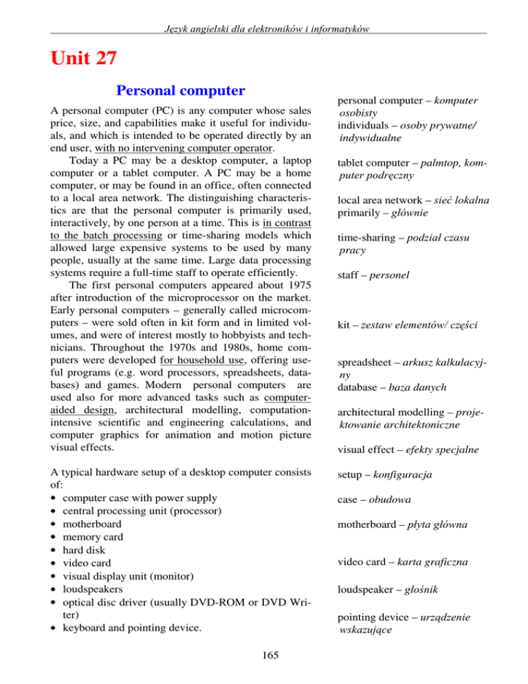 - ]\NDQJLHOVNLGODHOHNWURQLNyZLLQIRUPDW\NyZ . Unit 27 Personal computer A personal computer (PC) is any computer whose sales price, size, and capabilities make it useful for individuals, and which is intended to be operated directly by an end user, with no intervening computer operator. Today a PC may be a desktop computer, a laptop computer or a tablet computer. A PC may be a home computer, or may be found in an office, often connected to a local area network. The distinguishing characteristics are that the personal computer is primarily used, interactively, by one person at a time. This is in contrast to the batch processing or time-sharing models which allowed large expensive systems to be used by many people, usually at the same time. Large data processing systems require a full-time staff to operate efficiently. The first personal computers appeared about 1975 after introduction of the microprocessor on the market. Early personal computers – generally called microcomputers – were sold often in kit form and in limited volumes, and were of interest mostly to hobbyists and technicians. Throughout the 1970s and 1980s, home computers were developed for household use, offering useful programs (e.g. word processors, spreadsheets, databases) and games. Modern personal computers are used also for more advanced tasks such as computeraided design, architectural modelling, computationintensive scientific and engineering calculations, and computer graphics for animation and motion picture visual effects. A typical hardware setup of a desktop computer consists of: • computer case with power supply • central processing unit (processor) • motherboard • memory card • hard disk • video card • visual display unit (monitor) • loudspeakers • optical disc driver (usually DVD-ROM or DVD Writer) • keyboard and pointing device. 165 personal computer – komputer osobisty individuals – osoby prywatne/ indywidualne tablet computer – palmtop, komSXWHUSRGU F]Q\ local area network – VLHüORNDOQD primarily – JáyZQLH time-sharing –SRG]LDáF]DVX pracy staff – personel kit – ]HVWDZHOHPHQWyZF] FL spreadsheet – arkusz kalkulacyjny database – baza danych architectural modelling – projektowanie architektoniczne visual effect – efekty specjalne setup – konfiguracja case – obudowa motherboard – Sá\WDJáyZQD video card – karta graficzna loudspeaker – JáRQLN pointing device – XU]G]HQLH ZVND]XMFH Unit 27. Personal computer 0RQLWRU .H\ERDUG 0RXVH +DUG'LVF )ORS\'LVF 3ULQWHU 0RWKHUERDUG &38 3HULSKHUDOV . $/8 &ORFN *HQHUDWRU (YHU\ZKHUH 9LGHR5$0 5$0 &DFKH0HPRU\ 9LGHR 3URFHVVRU %,26 (,6$%XV %ULGJH 1HWZRUN %XV 6&6,%XV %ULGJH 0RGHP 2WKHU 3&,%XV %ULGJH '9' 3&,EXV 86% %ULGJH 86%EXV PC block diagram These components can be put together with little knowledge to build a computer. The motherboard is a main part of a computer that connects all devices together. The memory card(s), graphics card and processor are mounted directly onto the motherboard (the processor in a socket and the memory and graphics cards in expansion slots). The mass storage is connected to it with cables and can be installed in the computer case or in a separate case. This is the same for the keyboard and mouse, except that they are external and connect to the I/O panel on the back of the computer. The monitor is also connected to the I/O panel, either through a port on the motherboard, or a port on the graphics card. Several functions (implemented by chipsets) can be integrated into the motherboard, typically USB and network, but also graphics and sound. Even if these are present, a separate card can be added if what is available isn't sufficient. The graphics and sound card can have a break out box to keep the analogue parts away from the electromagnetic radiation inside the computer case. For really large amounts of data, an extra hard disk can be put together in the computer case or in an external case. The hardware capabilities of personal computers can sometimes be extended by the addition of expansion cards connected via an expansion bus. Most personal computers have multiple physical PCI expansion slots. 166 put together – ]PRQWRZDüSRáF]\ü]áR*\ü memory card – NDUWDSDPL FL mount – ]DPRQWRZDü expansion slot – gniazdo rozszeU]H separate – oddzielny, osobny port – SRUWJQLD]GR]áF]H implement – Z\NRQ\ZDü break out box – obudowa ekranuMFD hardware capabilities – PR*OLZoFLVSU] WRZH expansion bus – magistrala rozV]HU]H PCI expansion slot – gniazdo UR]V]HU]HW\SX3&, Unit 27. Personal computer Many also include an AGP bus and expansion slot or a PCI Express bus and one or more expansion slots. While early PC owners had no ready programs and they had to write their own programs to do anything useful with the machines, today’s users have access to a wide range of commercial and non-commercial software which is easily installed. The most common operating systems are Microsoft Windows, Mac OS and Linux. Software applications for personal computers include word processing, spreadsheets, databases, games, and a myriad of personal productivity and special-purpose software. Modern personal computers often have high-speed connections to the Internet, allowing access to the World Wide Web and a wide range of other resources. . access – GRVW S operating system – system operacyjny myriad – QLH]OLF]RQDLORü special-purpose software – programy specjalistyczne wide range – szeroka gama Zwroty with no intervening computer operator – EH]LQWHUZHQLRZDQLDRVRE\QDG]RUXMFHMSUDF NRmputera in contrast to the batch processing – ZSU]HFLZLHVWZLHGRSU]HWZDU]DQLDZVDGRZHJR]ELR rowego, grupowego) for household use – GRX*\WNXGRPRZHJR the computer-aided design – projektowanie wspomagane komputerowo a wide range of commercial and non-commercial software – szeroka gama komercyjnych i niekomercyjnych (darmowych) programów a myriad of personal productivity – QLH]OLF]RQDLORüSURJUDPyZQDSLVDQ\FKSU]