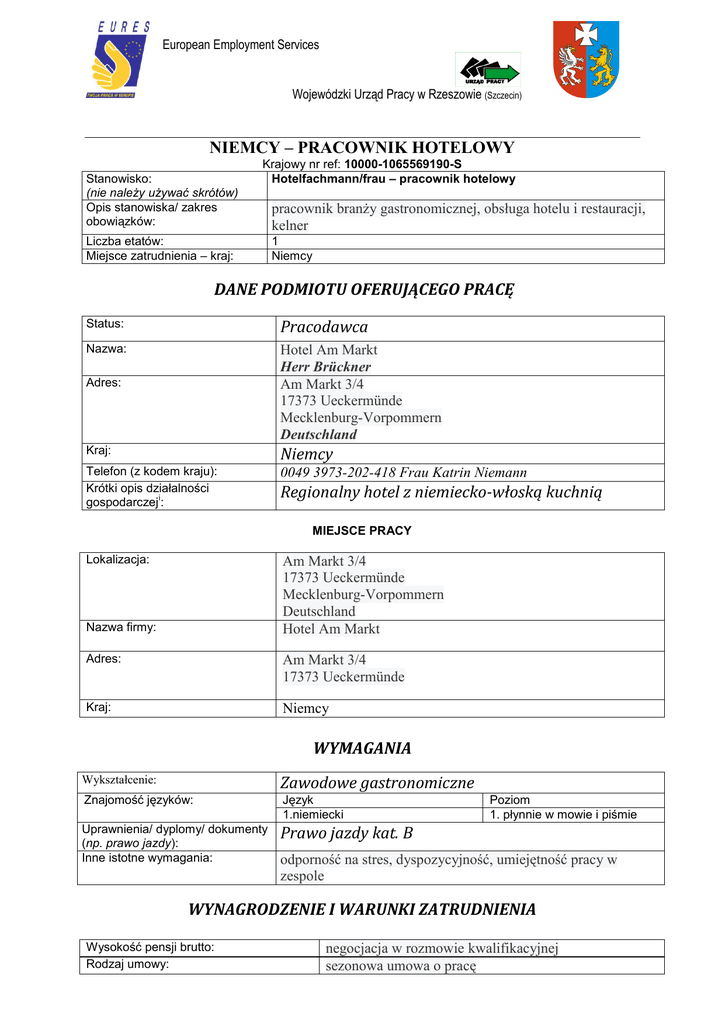 European Employment Services Wojewódzki Urząd Pracy w Rzeszowie (Szczecin) NIEMCY – PRACOWNIK HOTELOWY Stanowisko: (nie należy używać skrótów) Opis stanowiska/ zakres obowiązków: Krajowy nr ref: 10000-1065569190-S Hotelfachmann/frau – pracownik hotelowy Liczba etatów: Miejsce zatrudnienia – kraj: pracownik branży gastronomicznej, obsługa hotelu i restauracji, kelner 1 Niemcy DANE PODMIOTU OFERUJĄCEGO PRACĘ Status: Pracodawca Nazwa: Hotel Am Markt Herr Brückner Am Markt 3/4 17373 Ueckermünde Mecklenburg-Vorpommern Deutschland Adres: Kraj: Niemcy Telefon (z kodem kraju): Krótki opis działalności i gospodarczej : 0049 3973-202-418 Frau Katrin Niemann Regionalny hotel z niemiecko-włoską kuchnią MIEJSCE PRACY Lokalizacja: Am Markt 3/4 17373 Ueckermünde Mecklenburg-Vorpommern Deutschland Hotel Am Markt Nazwa firmy: Adres: Am Markt 3/4 17373 Ueckermünde Kraj: Niemcy WYMAGANIA Wykształcenie: Zawodowe gastronomiczne Znajomość języków: Język 1.niemiecki Uprawnienia/ dyplomy/ dokumenty (np. prawo jazdy): Inne istotne wymagania: Prawo jazdy kat. B Poziom 1. płynnie w mowie i piśmie odporność na stres, dyspozycyjność, umiejętność pracy w zespole WYNAGRODZENIE I WARUNKI ZATRUDNIENIA Wysokość pensji brutto: Rodzaj umowy: negocjacja w rozmowie kwalifikacyjnej sezonowa umowa o pracę Wymiar czasu pracy (praca na pełen etat/ część etatu): 40h tygodniowo, elastyczny czas pracy, praca w weekendy i święta Czas trwania umowy: (nieokreślony/ określony) Od zaraz Liczba godzin tygodniowo: 40 Zmiany i praca w dni wolne: tak Data rozpoczęcia: Od zaraz Inne informacje: Pytania proszę kierować do pani Niemann ( Tel. 03973202418) – tylko po niemiecku! Data wygaśnięcia umowy (w przypadku umowy na czas określony): 31.10.2011 SPOSÓB SKŁADANIA WNIOSKU Wymagane dokumenty (list motywacyjny, CV itp.): Język, w którym muszą być sporządzone przedkładane dokumenty: Do kogo należy wysłać dokumenty: (do pracodawcy/ doradcy EURES) Gdzie należy wysłać dokumenty: (adres, adres e-mail, nr faksu z kodem kraju itp.) Dane teleadresowe doradcy EURES lub przedstawiciela pracodawcy: (nazwisko, adres, telefon, fax, e-mail itp.) list motywacyjny, życiorys, dyplomy i certyfikaty niemiecki Do pracodawcy Hotel Am Markt Herr Brückner Am Markt 3/4 17373 Ueckermünde Mecklenburg-Vorpommern Deutschland Djane Jennricke, Bozena Witt E-Mail: [email protected] WAŻNOŚĆ Data publikacji: 28.07.2011 Termin przedkładania podań o pracę / zakończenia ważności oferty: Uprzejmie informujemy, że skontaktujemy się wyłącznie z wybranymi kandydatami. UWAGA: 1. Umowa z zagranicznym pracodawcą zostanie zawarta zgodnie z prawem kraju zatrudnienia. Oznacza to, że wszystkie roszczenia odnośnie do warunków, które obejmuje umowa, można kierować wyłącznie do odpowiedniego sądu w kraju zatrudnienia. Publiczne służby zatrudnienia (EURES) nie mogą pośredniczyć ani reprezentować pracownika w sądzie kraju zatrudnienia w przypadku sporu z pracodawcą. 2. Publiczne służby zatrudnienia (EURES) dokładają wszelkich starań, aby zapewnić rzetelność i wiarygodność ofert pracy zgłoszonych w lokalnym urzędzie pracy. Należy wyjaśnić, że oferta pracy została zgłoszona przez stronę trzecią i EURES nie odpowiada za ewentualne rozbieżności między warunkami pracy określonymi w ofercie pracy i warunkami oferowanymi przez potencjalnego pracodawcę. 3. Publiczne służby zatrudnienia (EURES) informują, że będą zbierać, przetwarzać i przekazywać potencjalnym pracodawcom zgodnie z przepisami dotyczącymi ochrony danych osobowych wszystkie dane osobowe dostarczone przez osoby poszukujące pracy.